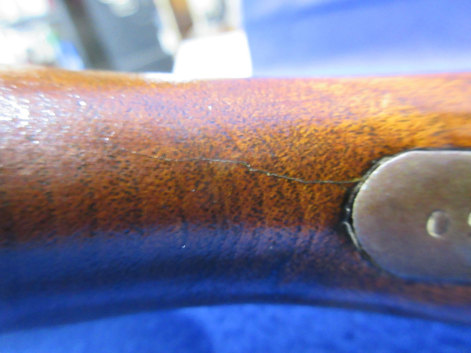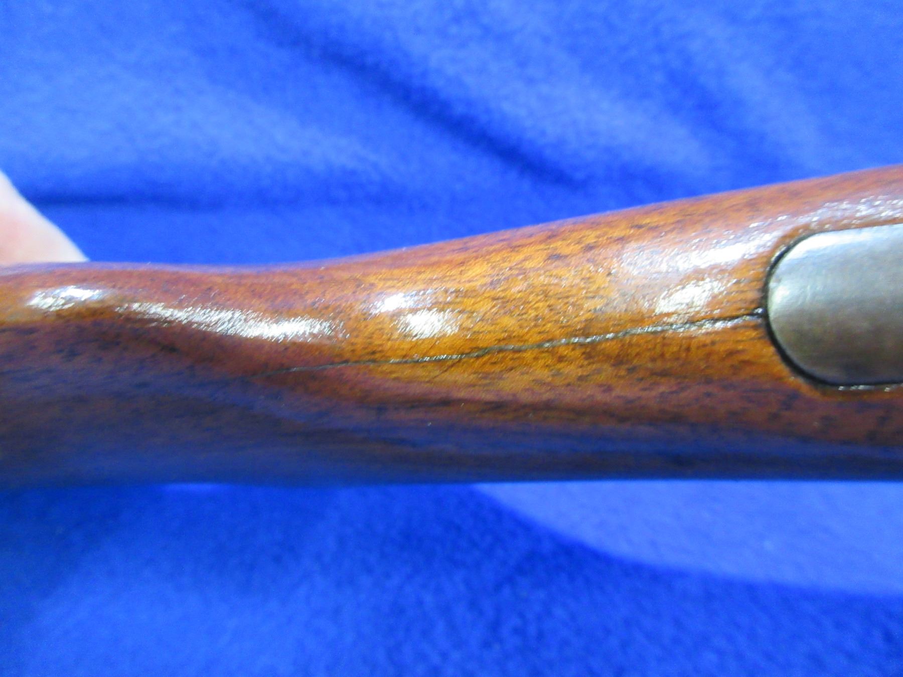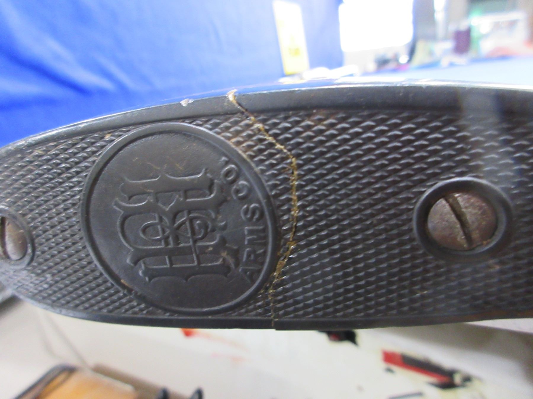 Non-Restricted - Harrington & Richardson in 12 Ga. 2 3/4" - This tip up single shot shotgun appears to be in good to very good working order, action is tight. Barrel is 36", bore is good, bluing is turning brown, has bead front sight, stock has crack repairs behind upper and lower tang and has been refinished, forearm is good and has been refinished, butt plate cracked in half and appears glued. Ser # A423650