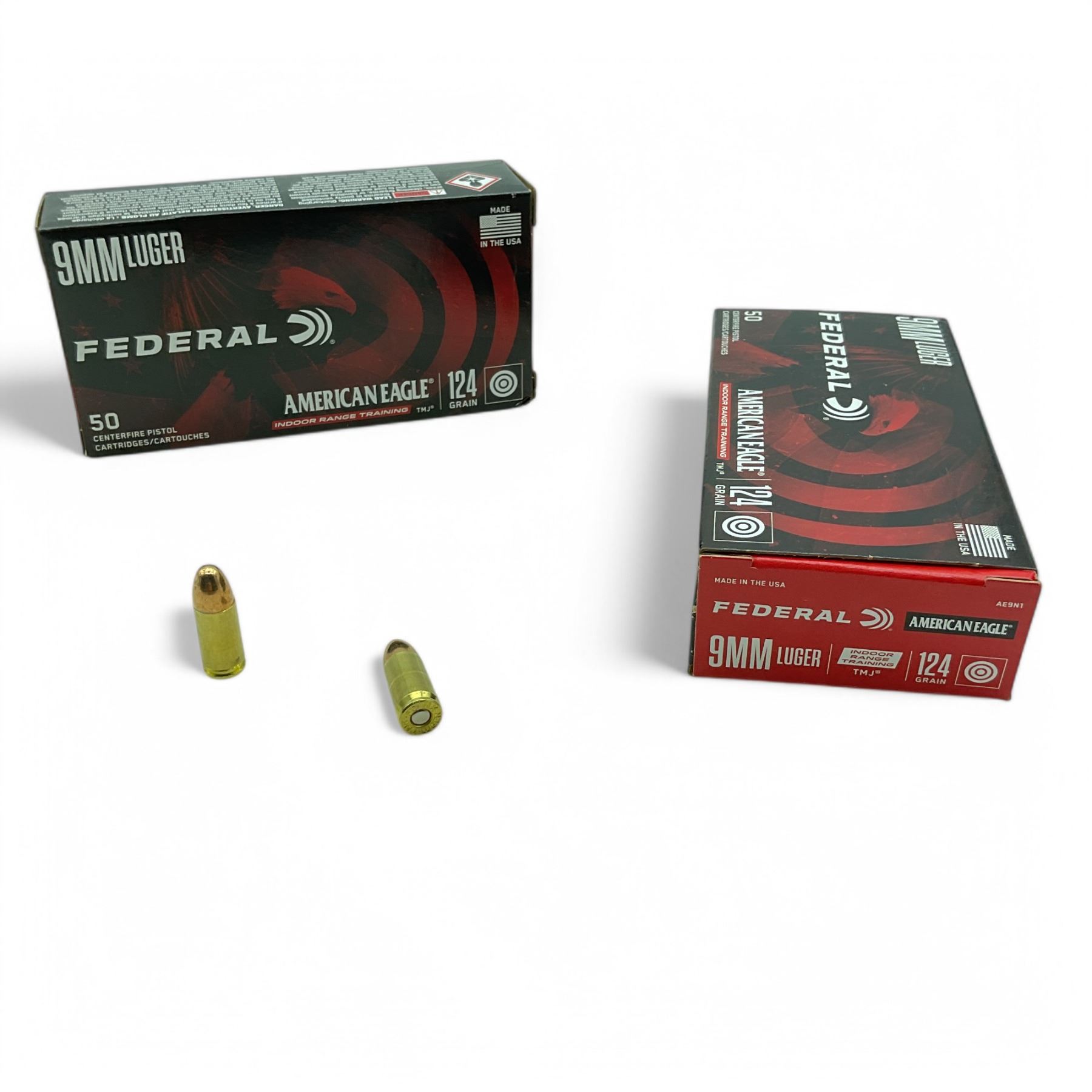 Lot 2082 Federal American Eagle Indoor Range Training 9 mm 124 Grain TMJ Ammunition, 100 Rounds