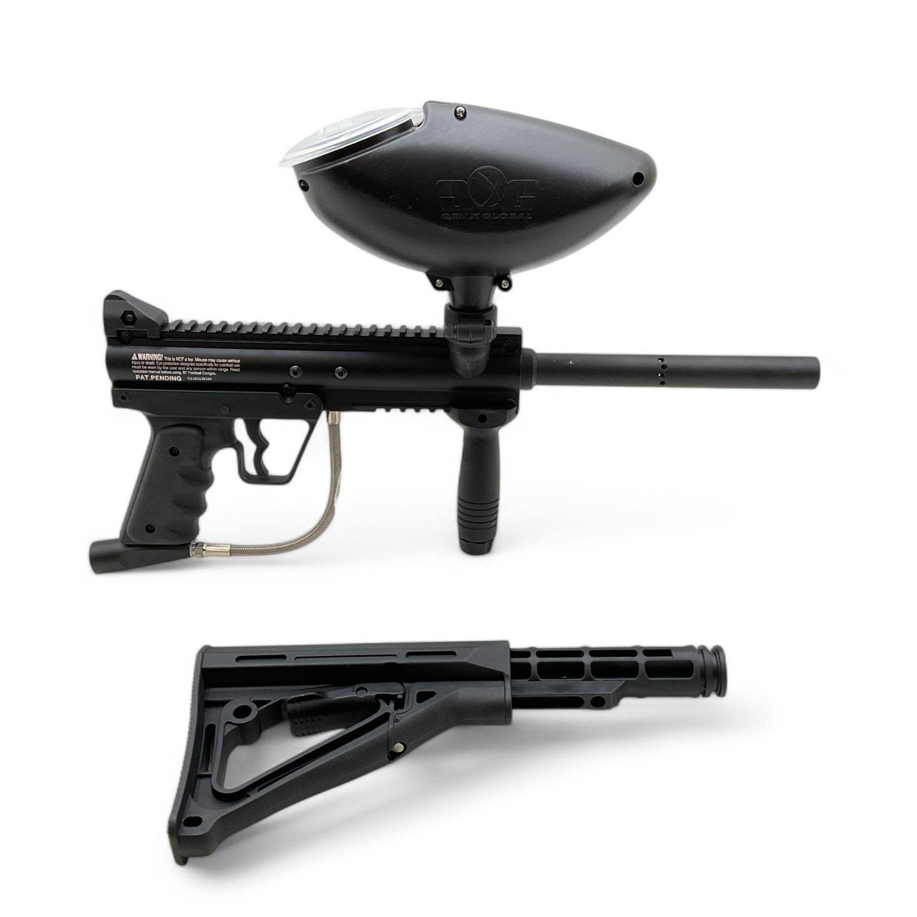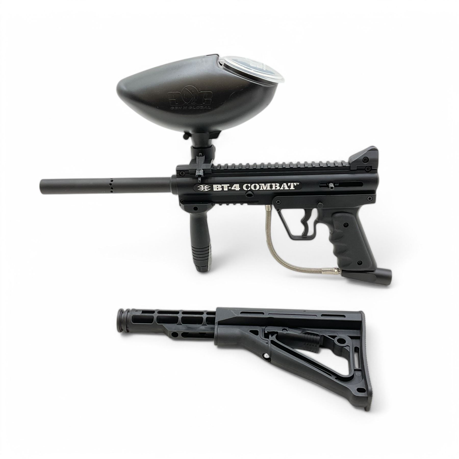 Empire BT-4 Combat CO2 Paintball Marker. Comes with vertical grip and slide-away feedport. Also includes adjustable rear stock.