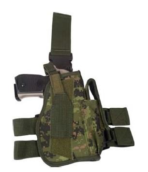Ballistic nylon construction, Drop down thigh leg holster with adjustable straps, and quick release thumb snaps