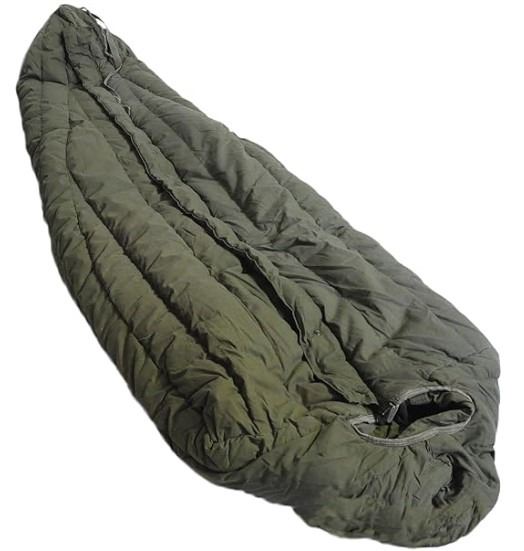These sleeping bags are made of water-repellent poplin cotton outer shell with 100% polyester filling. They feature a 64" long zipper, offset stitching at the seams and a 3" storm flap with snaps over the zipper. rated for -10°F. Mummy style bags with a draw cord hood. These bags are 93" long, 30" wide at the top and 14" at the bottom and weigh 8lbs. They were issued from the 1970's into the early 2000's.