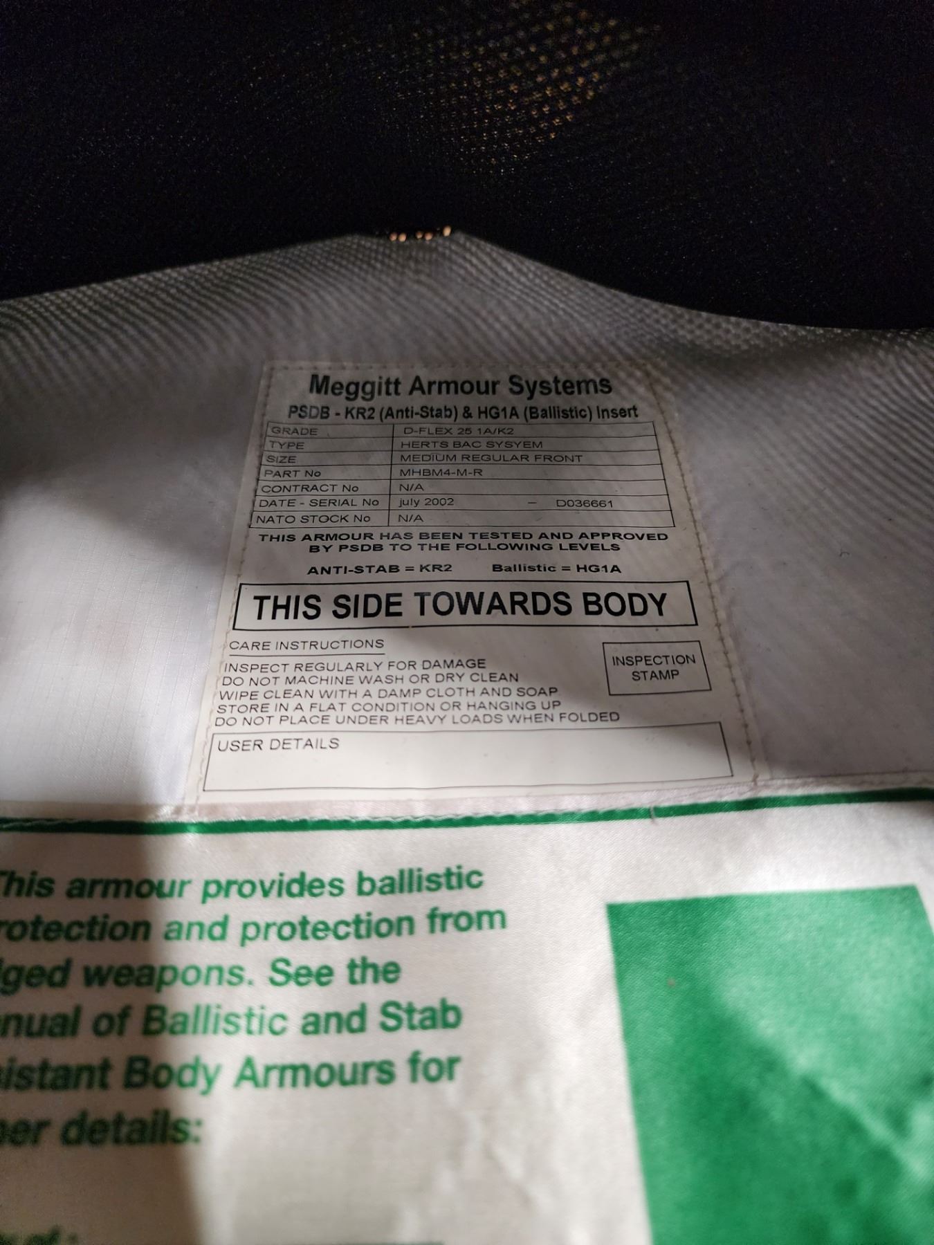 Lot 10405 1X Level 2 Ballistic+Stab KR2-HG1A Vest with Mesh Outer (Sold as Novelty Only) Size - Medium Regul