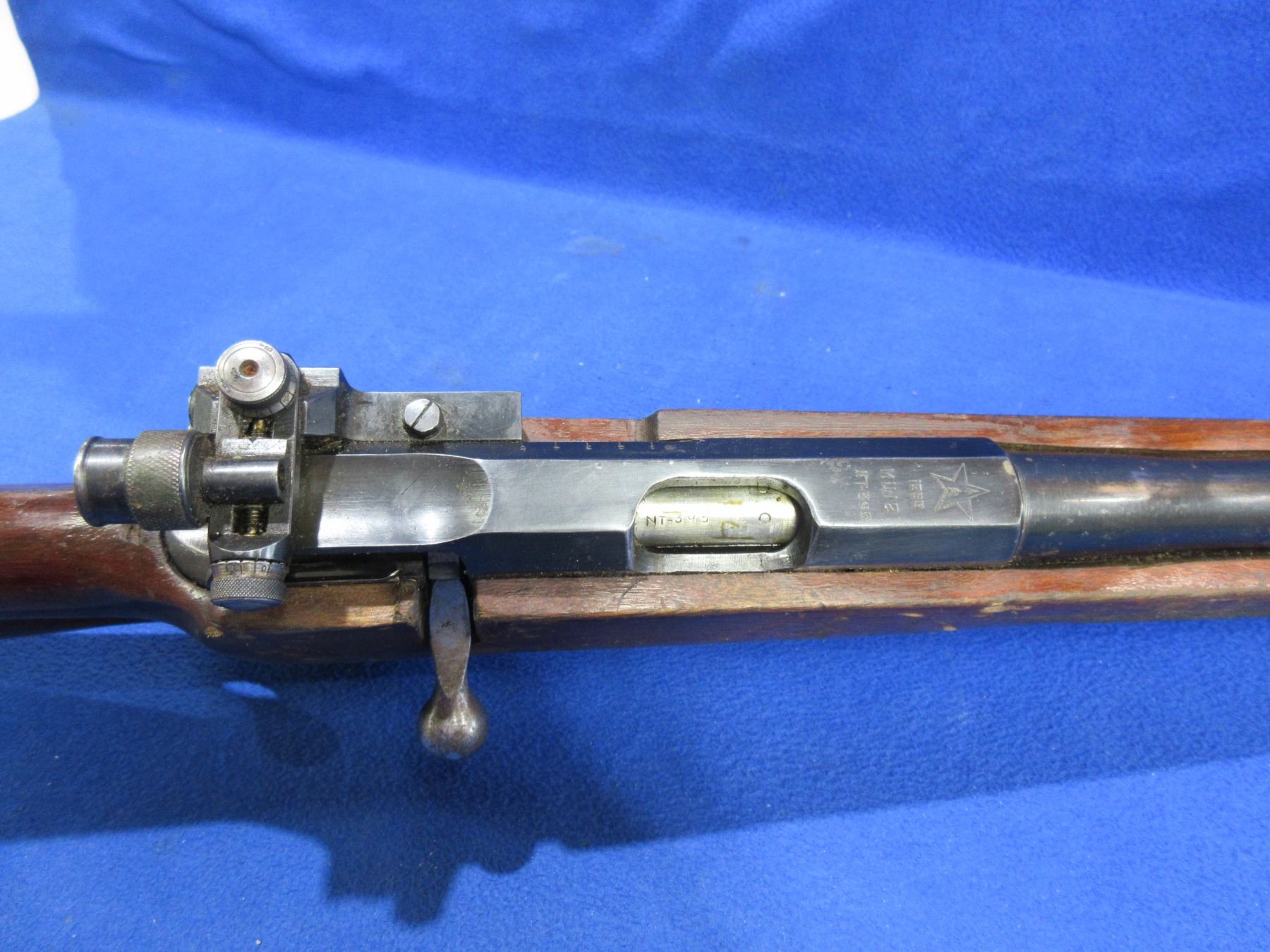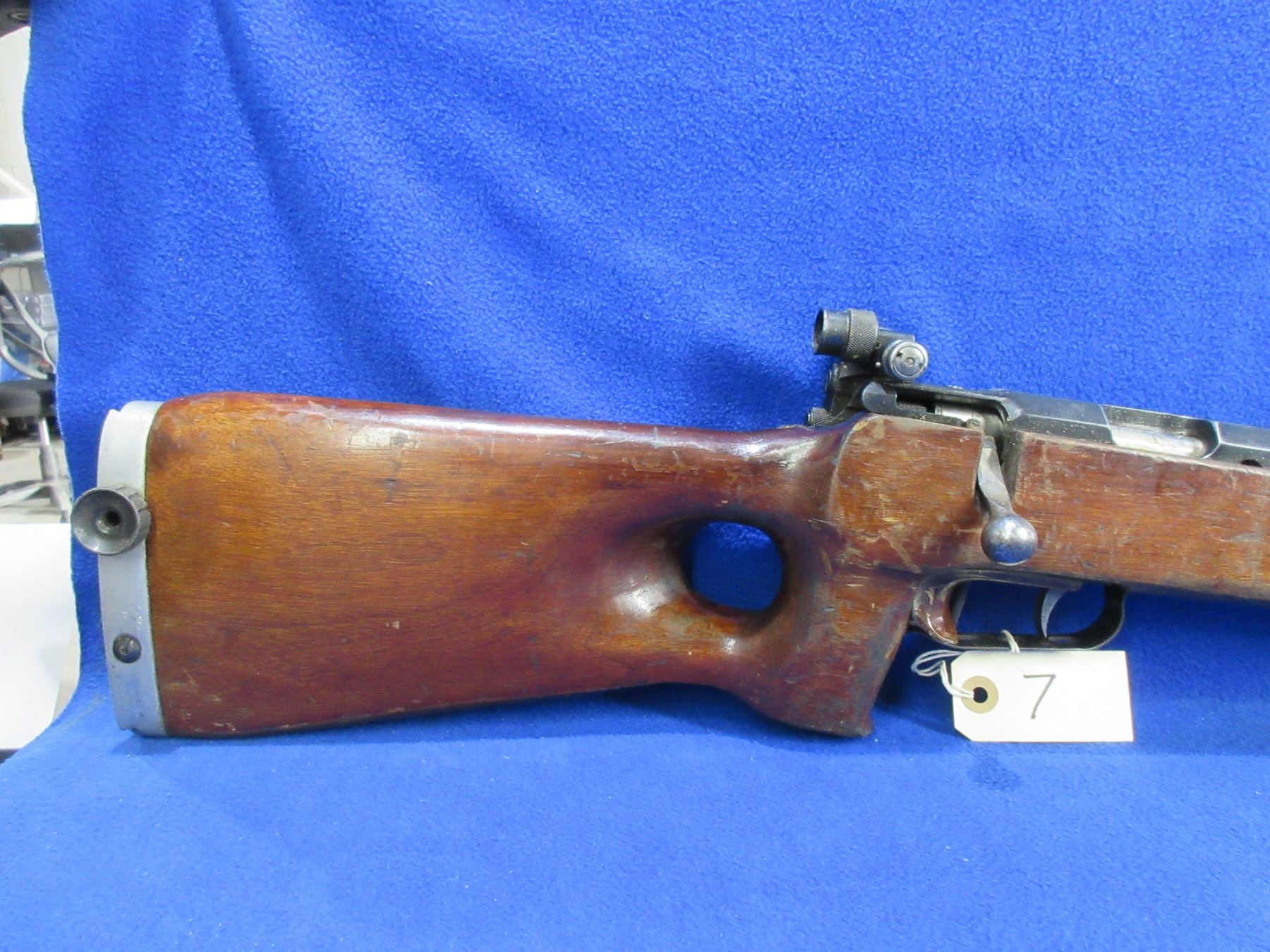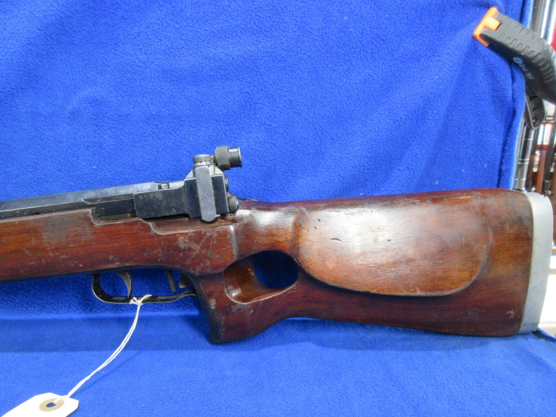 Non-Restricted - Russian TOZ Target Model MU-12 in 22 LR - Made in 1959, this very rare bolt action single shot target rifle appears to be in good to very good working order. Barrel is 29 1/2", rifling is good to very good, bluing is good with wear patches, has both peep sights, stock is good with many usage marks, adjustable recoil pad - missing pad, has double set triggers, comes with rail for palm rest. Ser #NT-395