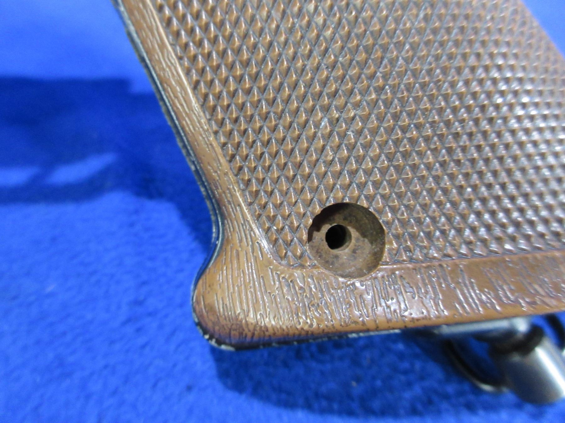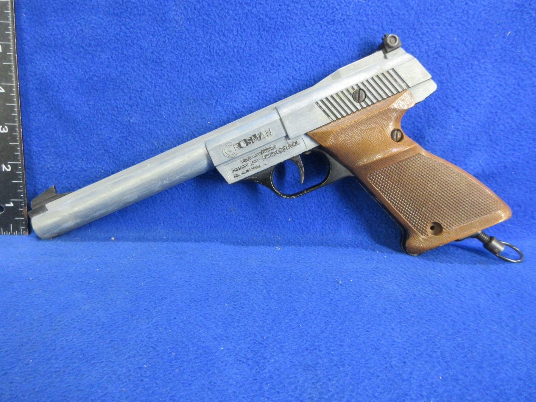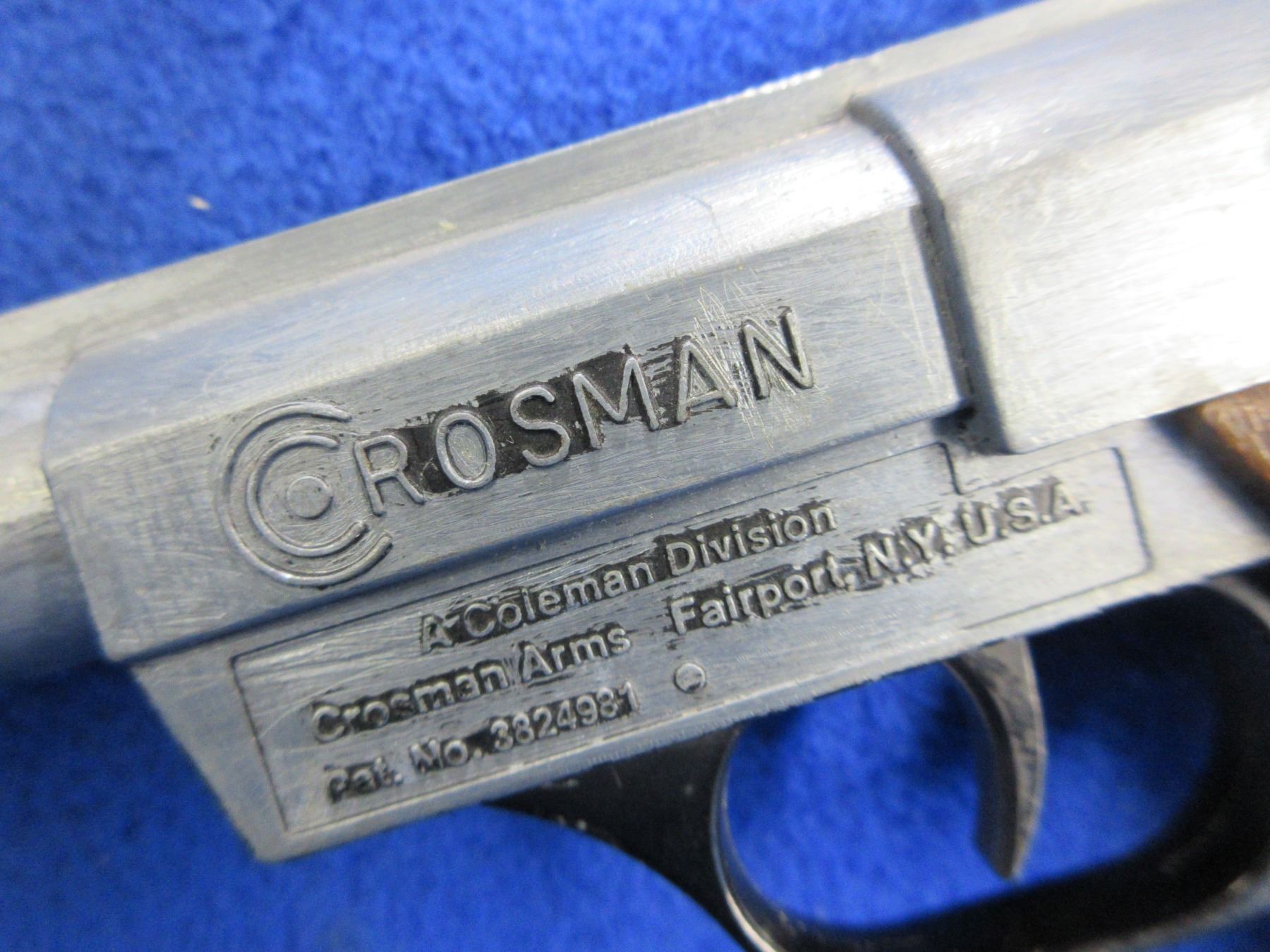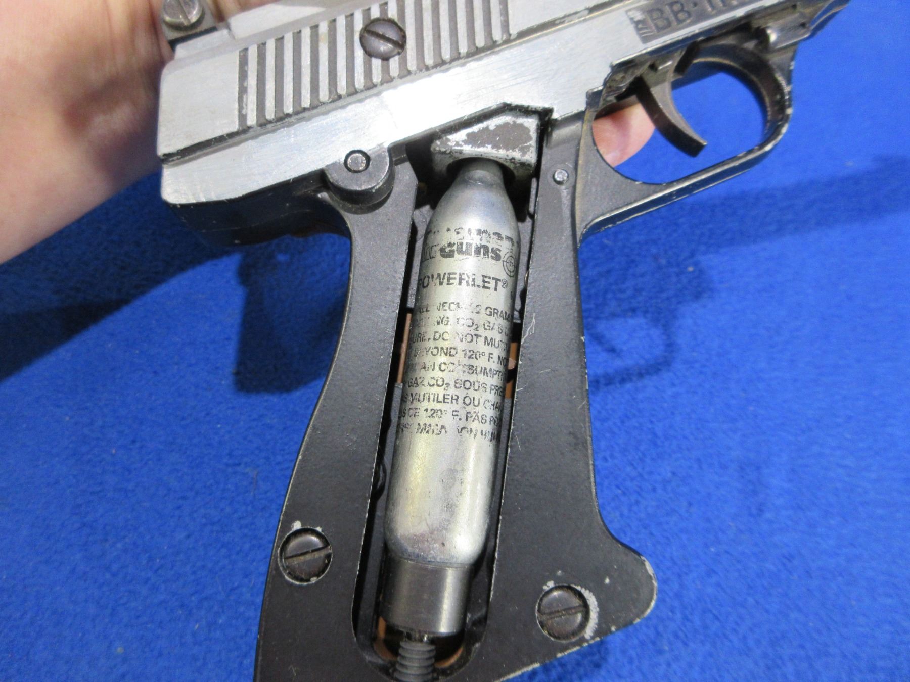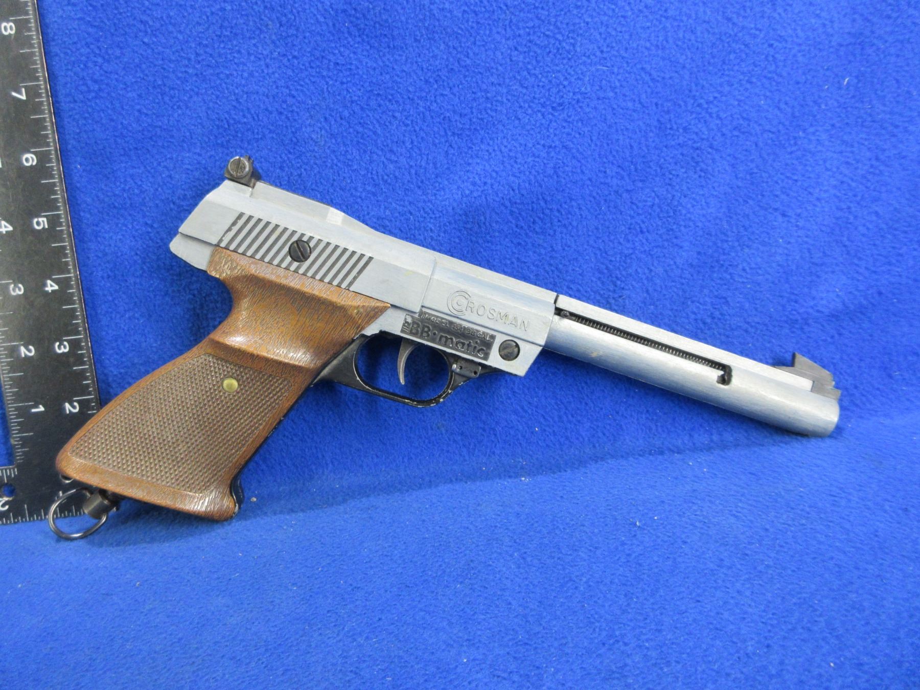 No PAL Required - Crossman 454 BB-Matic Pistol in BB Cal. - This semi-auto CO2 air pistol appears to be in good working order. 16 shot magazine, appears to have been painted silver, has front sight and adjustable rear sight, grips are good but 1 screw is missing. Ser #
