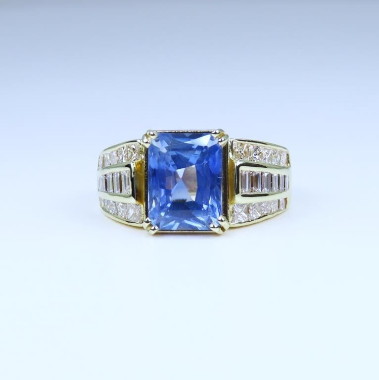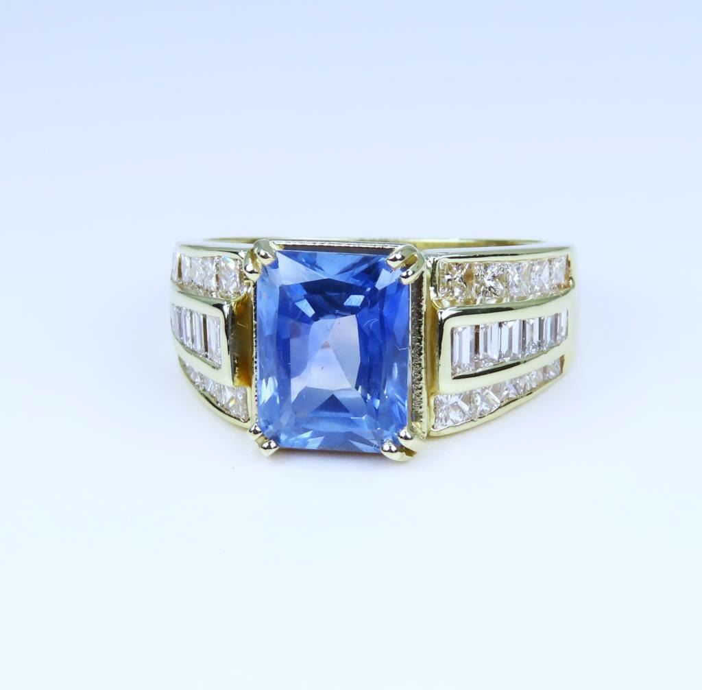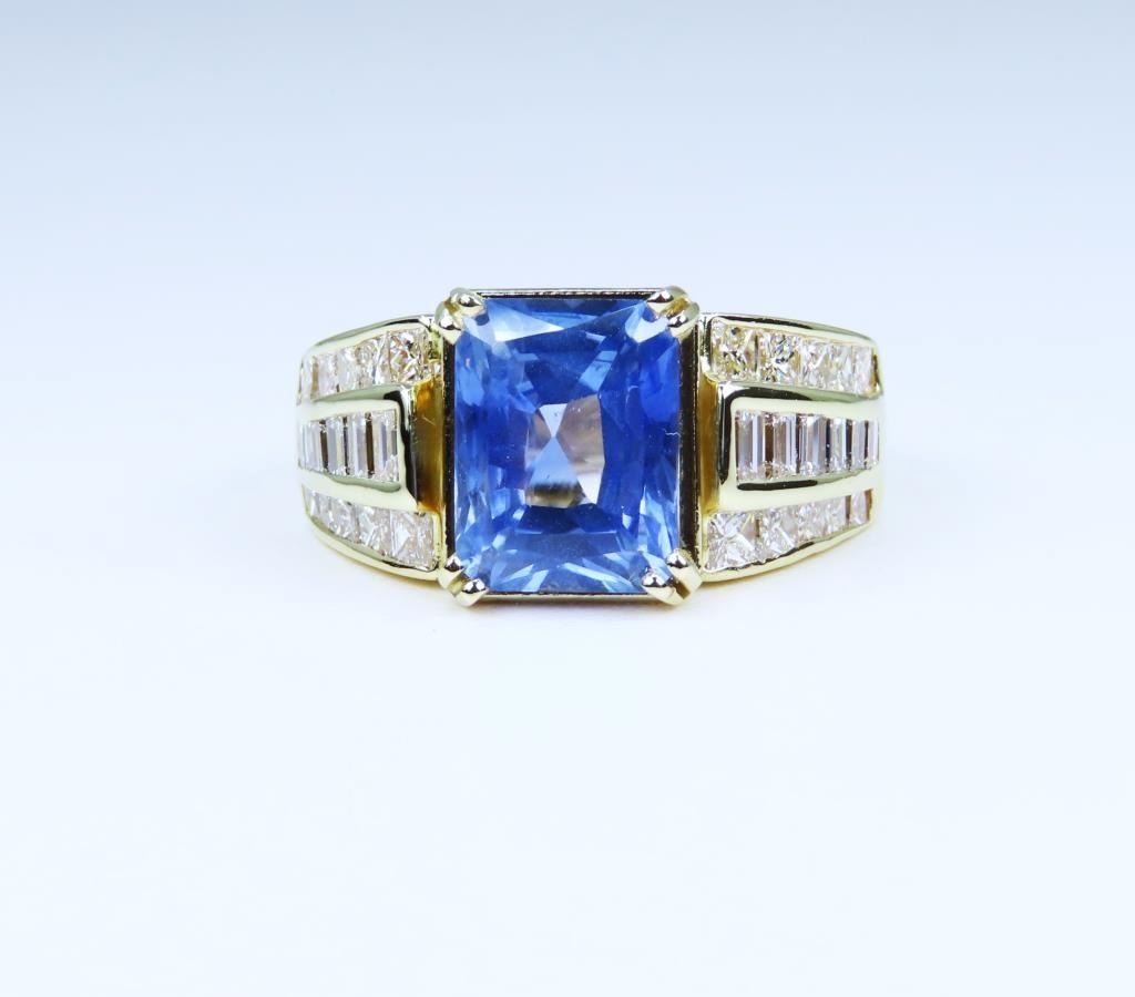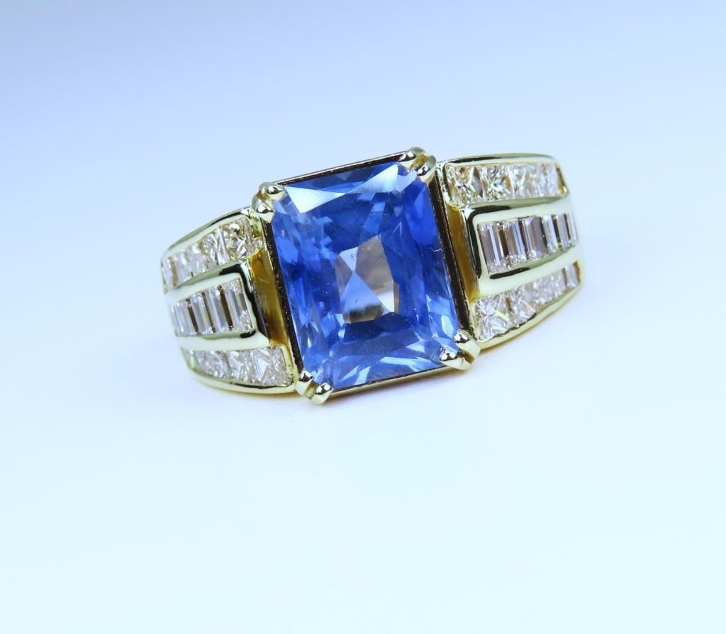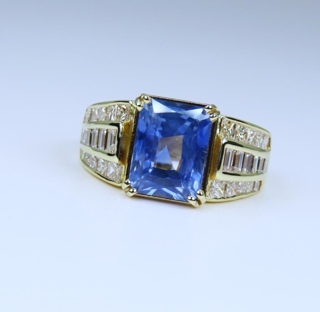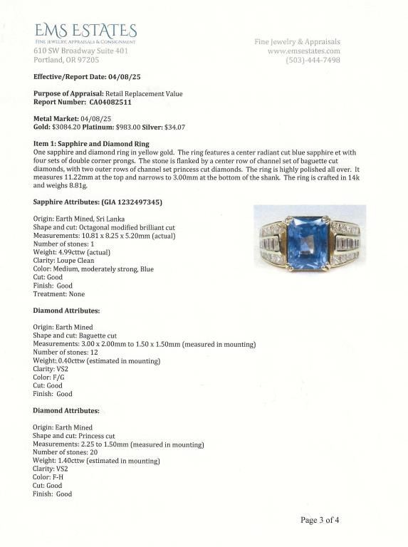 Ring featuring a G.I.A. Certified Natural, NO TREATMENT Sri Lankan Blue Sapphire weighing 4.99 carats, accented with 32 princess and baguette cut Diamonds weighing approximately 1.80 carats with F-G colors and VS clarity, set in a stunning custom setting crafted in 14 karat yellow gold weighing 9.00 grams, ring size 7. Timeless Fine Quality Luxury Piece, Excellent Investment. Full Retail Appraisal - $34,000.00.