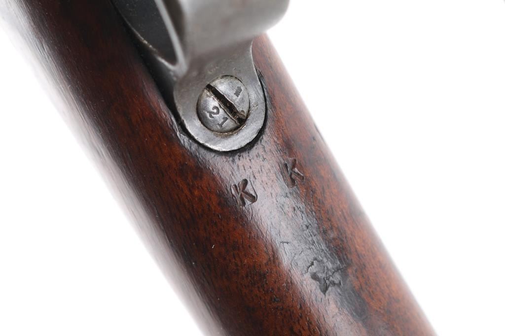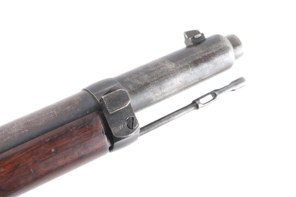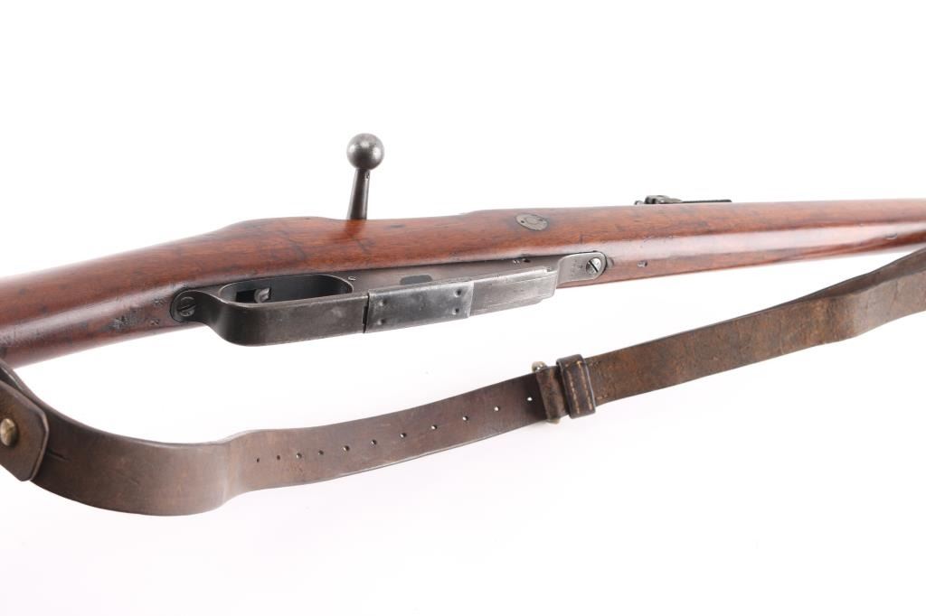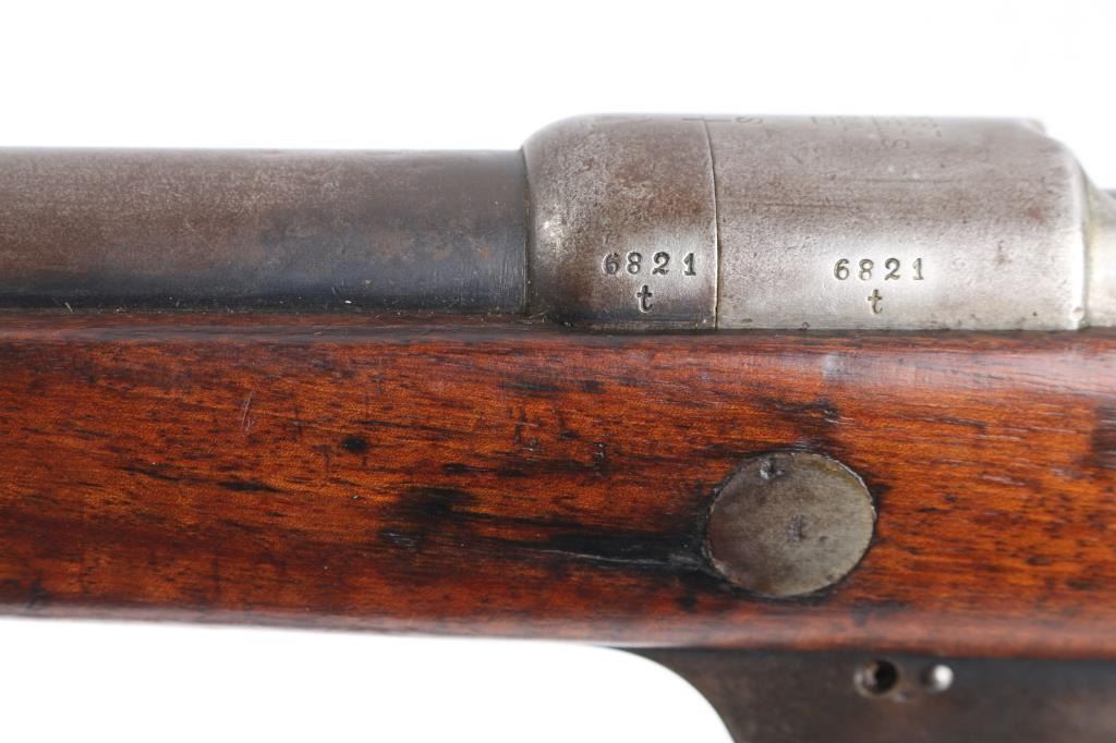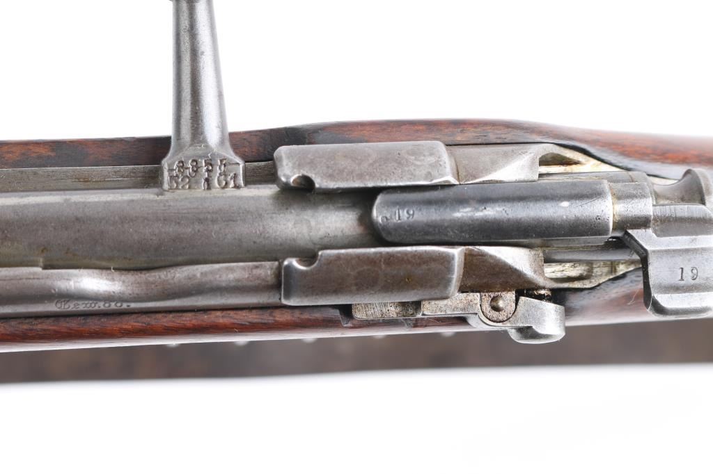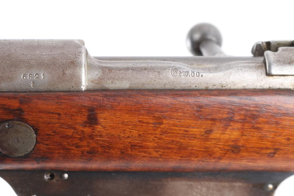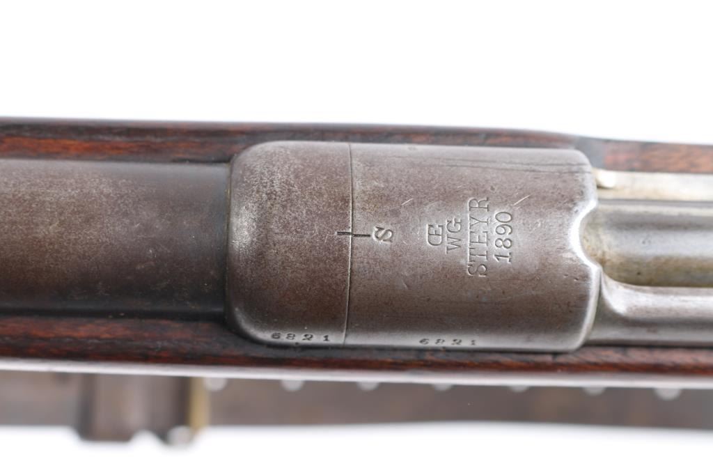Commission Rifle, 88/05 Pattern German military bolt-action service rifle chambered in 7.92x57mm, Chamber stamped CE WG Steyr 1890. Features a 29" barrel with tubular metal shroud, dovetailed inverted v front sight, flip-up ladder rear sight, cleaning rod, two barrel bands with bayonet lug on the front band, straight bolt handle, manual two-position safety, internal 5 round magazine, stripper clip guide, sling swivels, smooth trigger and full-length straight grip wood shoulder stock with smooth metal buttplate. Various Markings and imperial German proofs. Matching serial numbers on the barrel, chamber, bottom metal screws and triggerguard, bolt mismatched. Rifle exhibits approximately 10% bluing, displays a molted gray patina. Action is smooth, the bore is dark/rough with good rifling and the wood stock is very good/sound. Brown leather sling attached.Condition is NRA very Good as Antique Firearm.