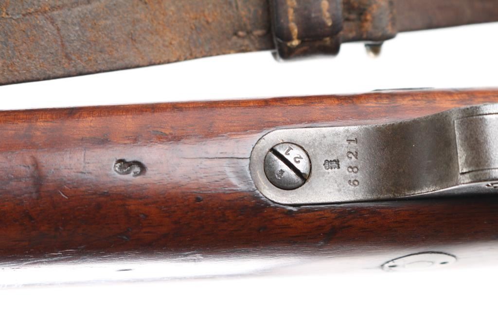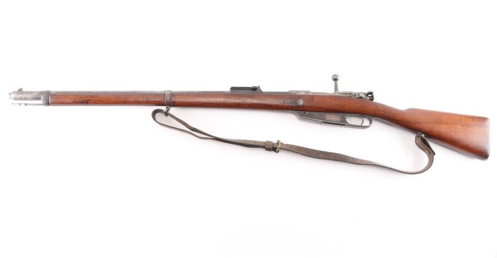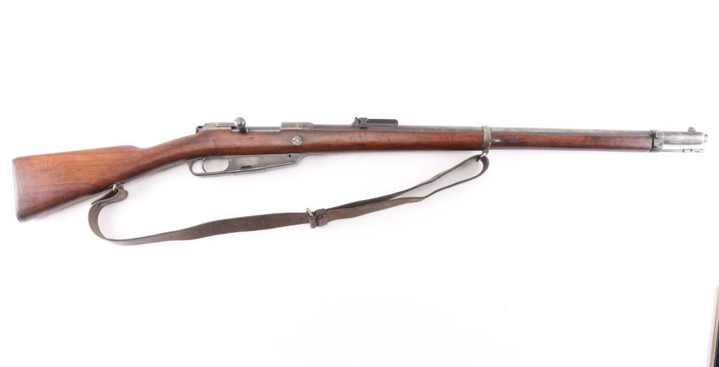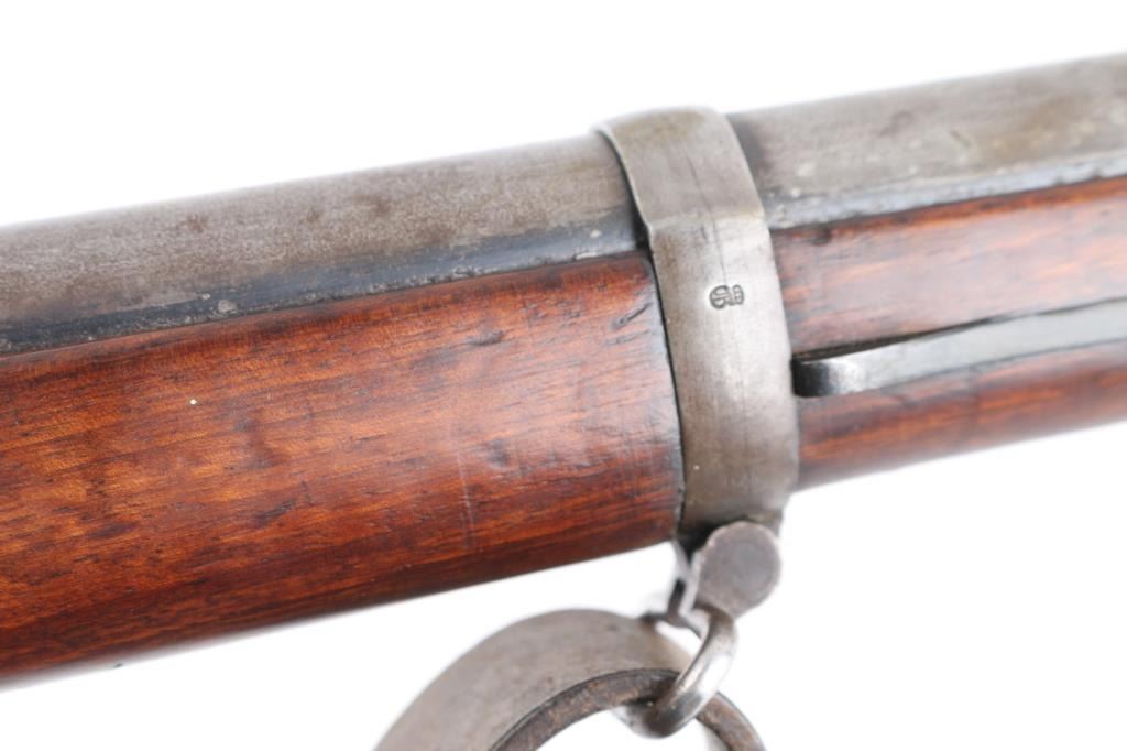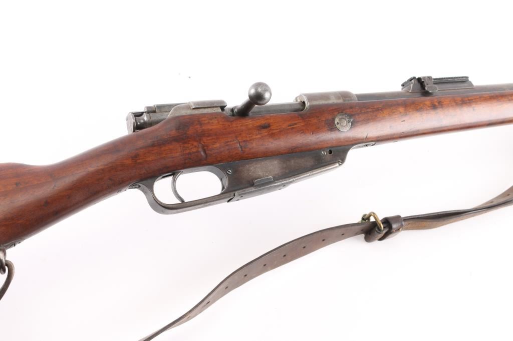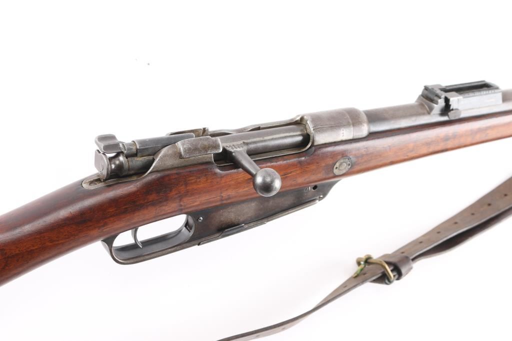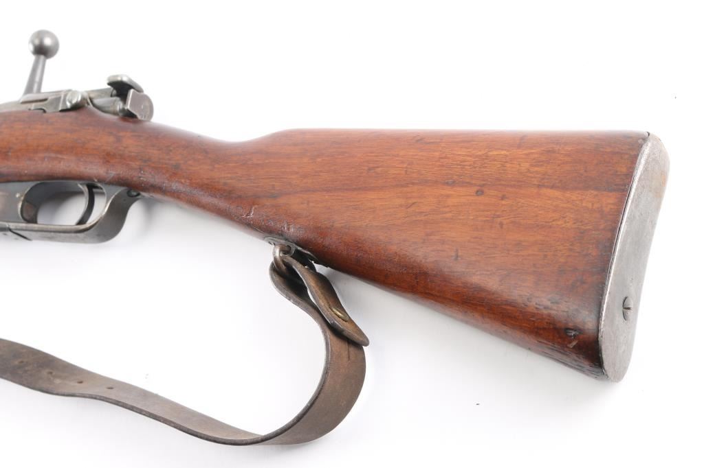 Commission Rifle, 88/05 Pattern German military bolt-action service rifle chambered in 7.92x57mm, Chamber stamped CE WG Steyr 1890. Features a 29" barrel with tubular metal shroud, dovetailed inverted v front sight, flip-up ladder rear sight, cleaning rod, two barrel bands with bayonet lug on the front band, straight bolt handle, manual two-position safety, internal 5 round magazine, stripper clip guide, sling swivels, smooth trigger and full-length straight grip wood shoulder stock with smooth metal buttplate. Various Markings and imperial German proofs. Matching serial numbers on the barrel, chamber, bottom metal screws and triggerguard, bolt mismatched. Rifle exhibits approximately 10% bluing, displays a molted gray patina. Action is smooth, the bore is dark/rough with good rifling and the wood stock is very good/sound. Brown leather sling attached.Condition is NRA very Good as Antique Firearm.