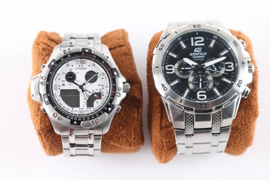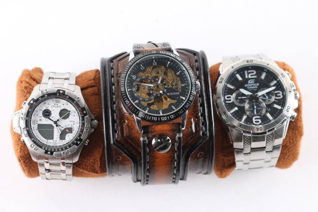 Includes: Citizen Promaster Wingman; Casio Edifice; Winner Skeleton Watch w/ leather cuff.