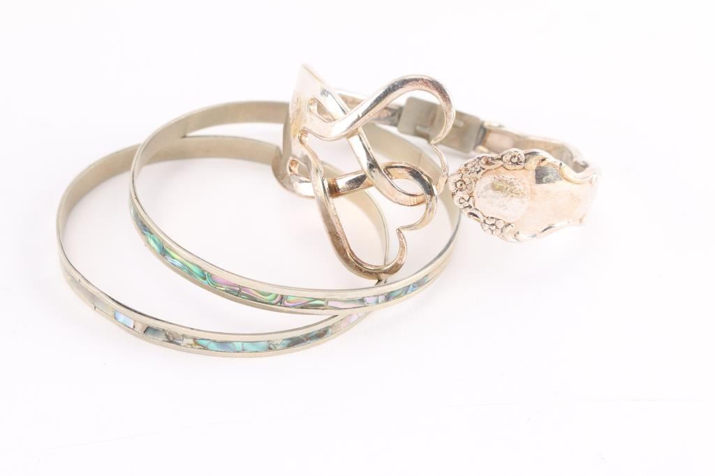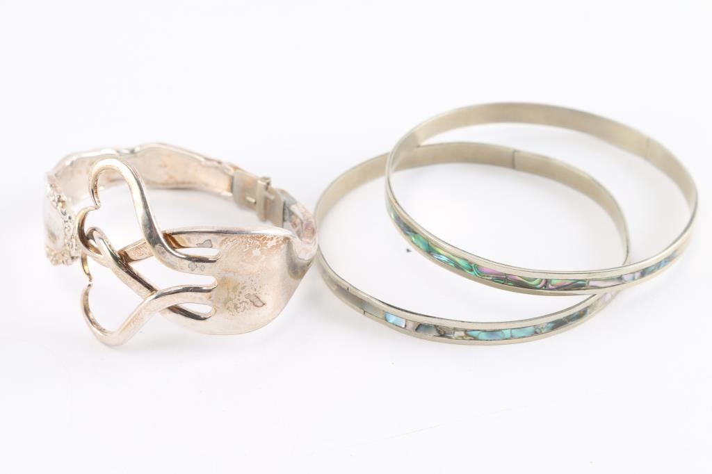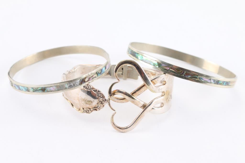 One is made from a fork into two intertwined hearts and has a hinge for easy on and off. The other two are shell inlaid bangles.