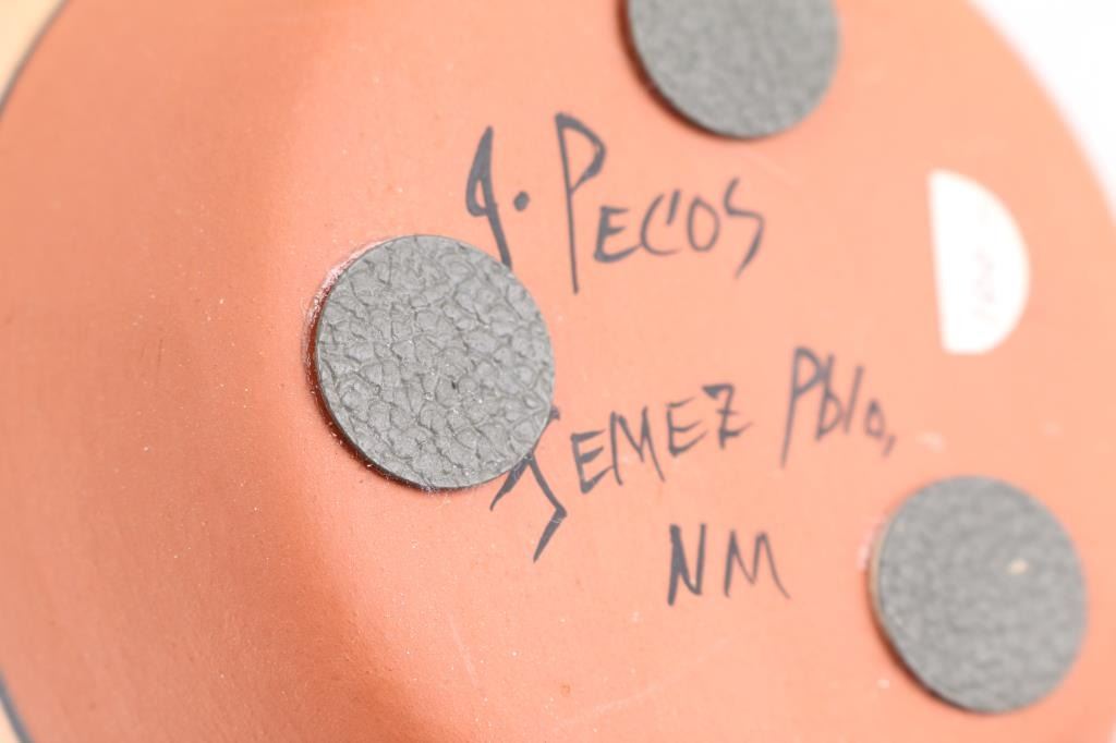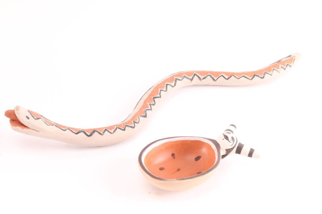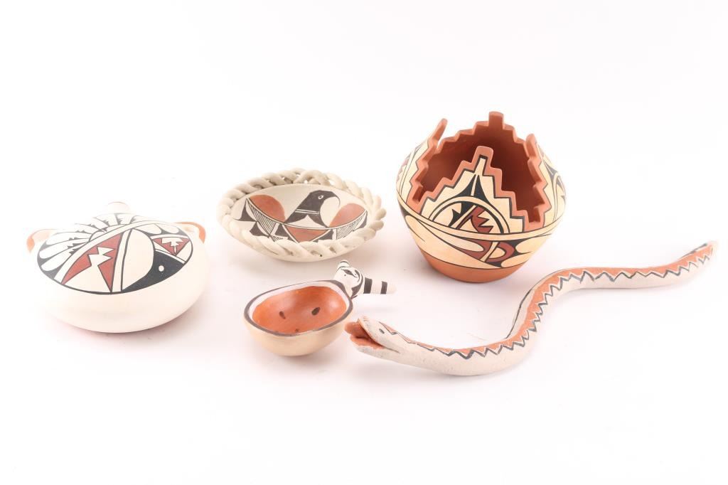 (1) Beautiful canteen signed by J. Pecos on bottom measuring 5 1/2" by 5" by 1 1/2" tall. In excellent condition. (1) Nicely painted pot by J. Pecos, signed on bottom, measuring 5" tall by 5" around. Excellent condition. (1) Snake by Josephine Arquero, Cochiti, New Mexico, signed on bottom, measuring 14" long, in good condition. (1) Shallow white dish with painted bird inside, measuring 1" tall by 5" around. (1) Clown bowl with painted watermelon in bowl. Measures 1" tall by 5" long by 2 1/4" wide.