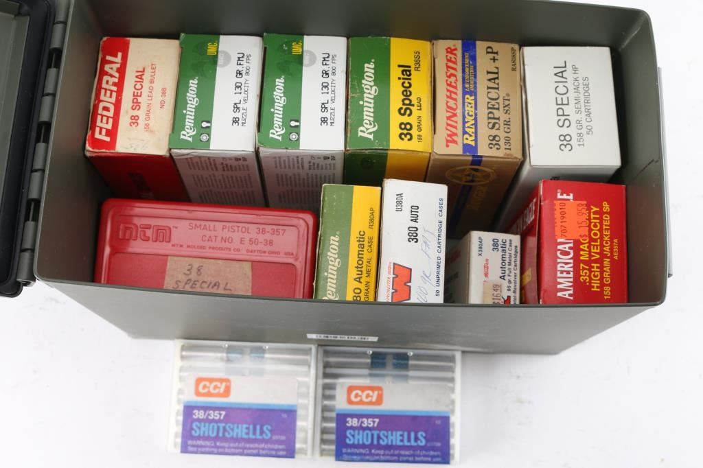 Approx. 650 rounds total. Approx. 50 rds of American Eagle 357 magnum, 158 Gr. JSP; approx. 100 rds of Remington 38 Special, 130 Gr. FMJ; approx. 150 rds of 380 ACP, Winchester & Remington FMJ; approx. 20 rds of CCI 38/357 shotshells/snake shot. & more. A couple of partial boxes included.
