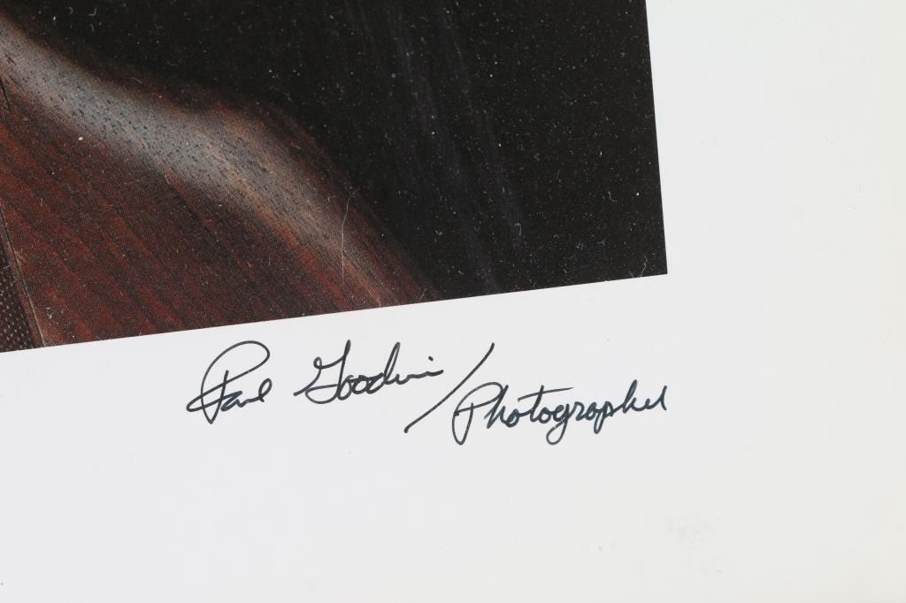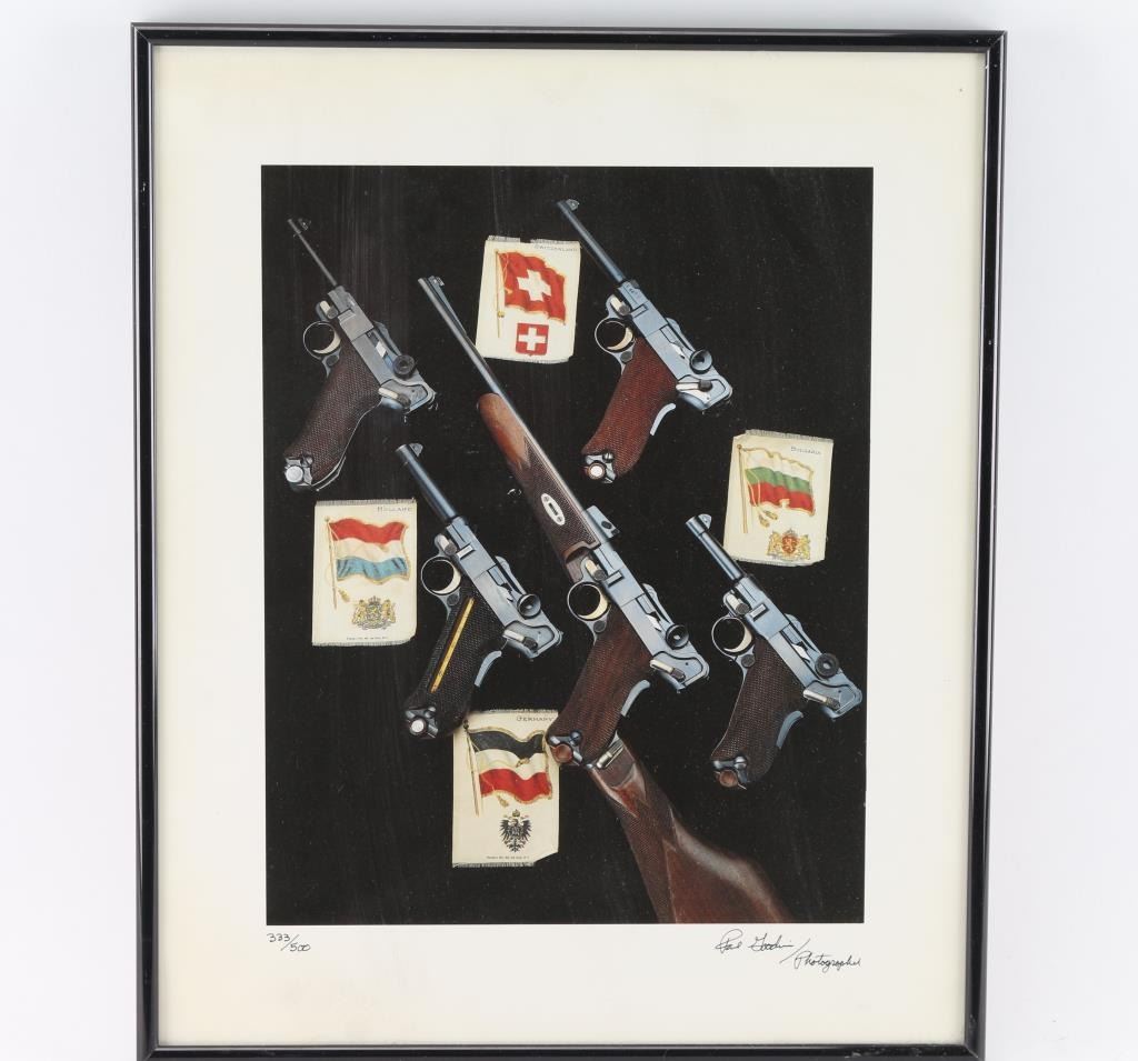 This photograph was first featured on the cover of the book Luger: The Multi-National Pistol by Charles Kenyon Jr. It features 4 Luger pistols from Germany, Holland, Bulgaria and Switzerland. Signed by Paul Goodwin, numbered 333/500. Frame measures 17" x14". Rare