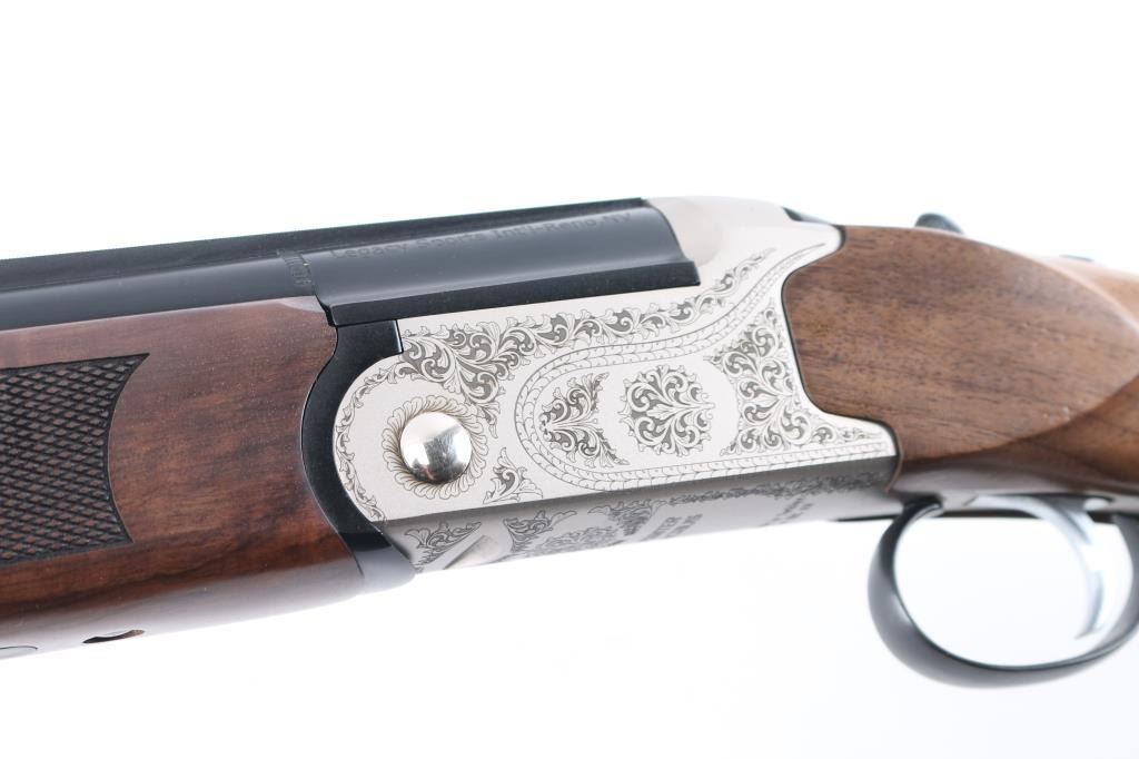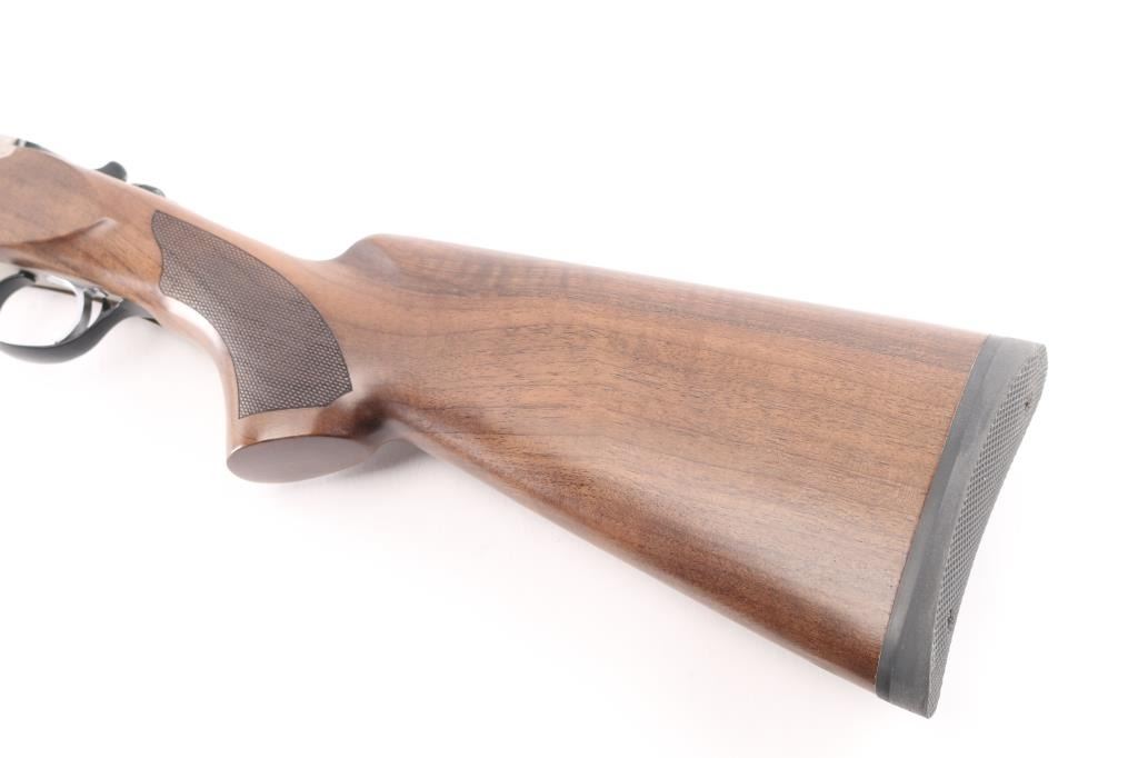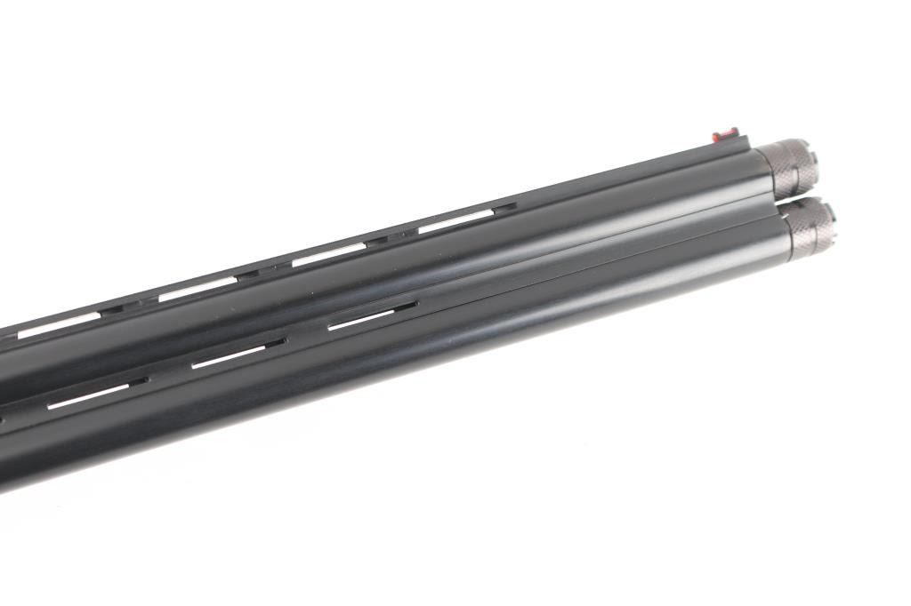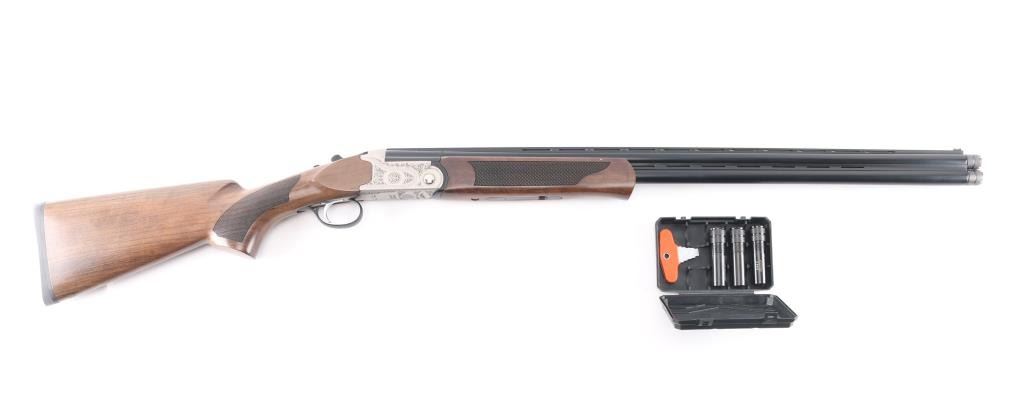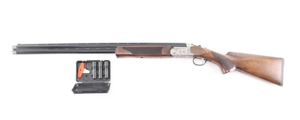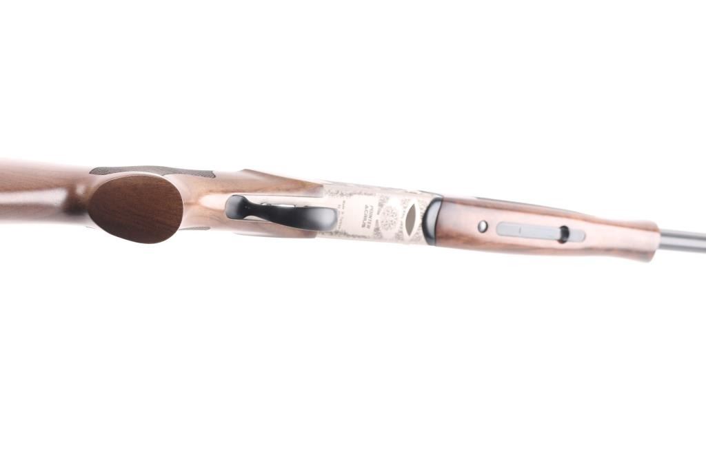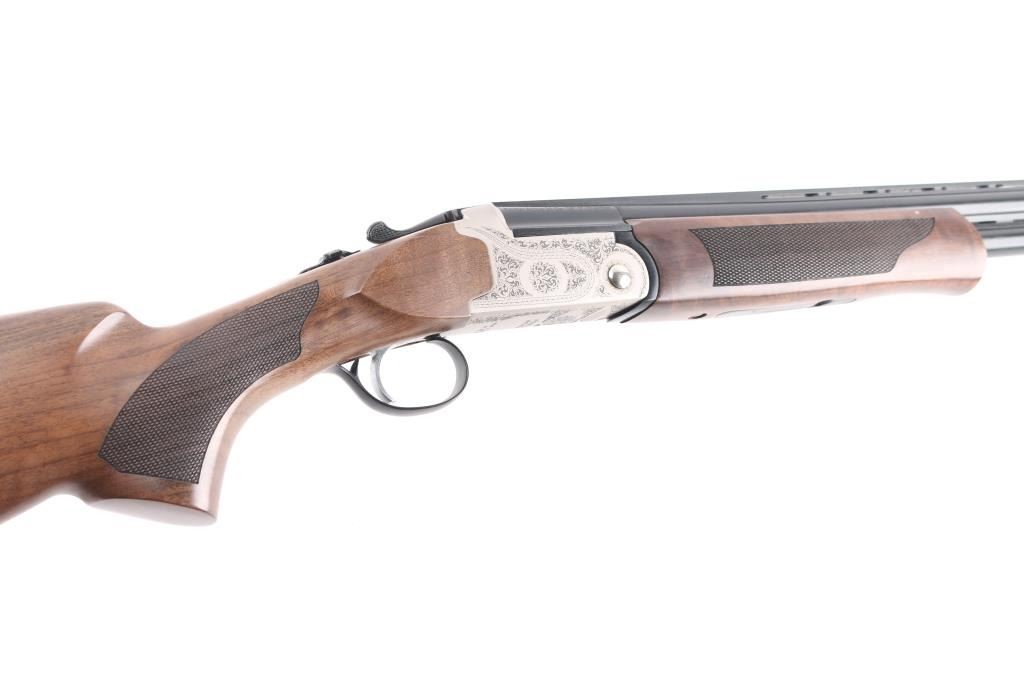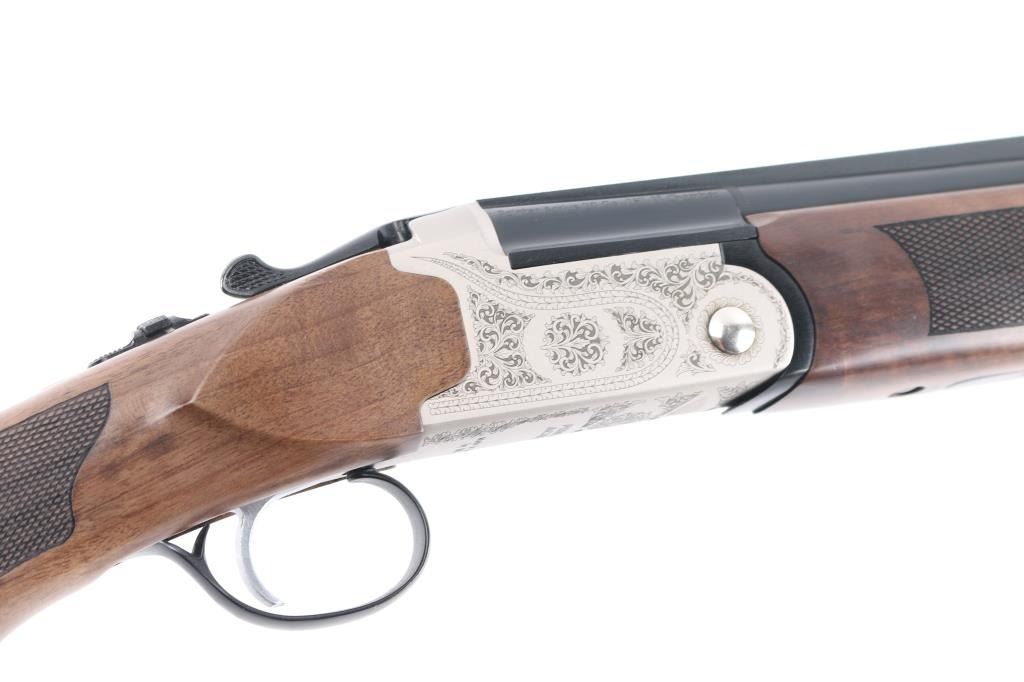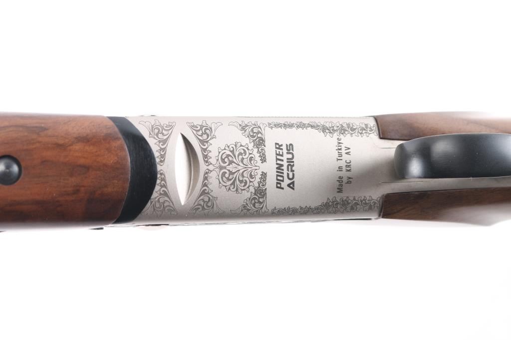 SN: 23OU-KRC21215. Turkish manufactured Pointer Acrius Over/Under Shotgun - 20 Gauge, 28" vent rib barrels, red fiber optic sight, checkered Turkish walnut stock and forend are matched with a coin finished floral laser-engraved receiver, chrome-lined accu-Choke barrels, mechanical trigger, sliding tang safety/barrel selector. 3" chambers, solid rubber recoil pad. LOP is 14". Shotgun is like new condition, bores are excellent/bright. CYL and IC chokes installed. Comes with manual and choke wrench, Full, IM and Modified chokes in case.NRA Condition-Excellent. Modern Firearm.