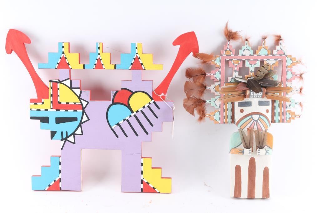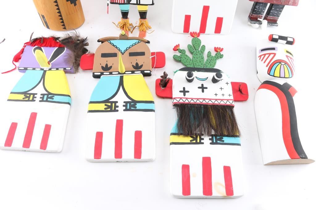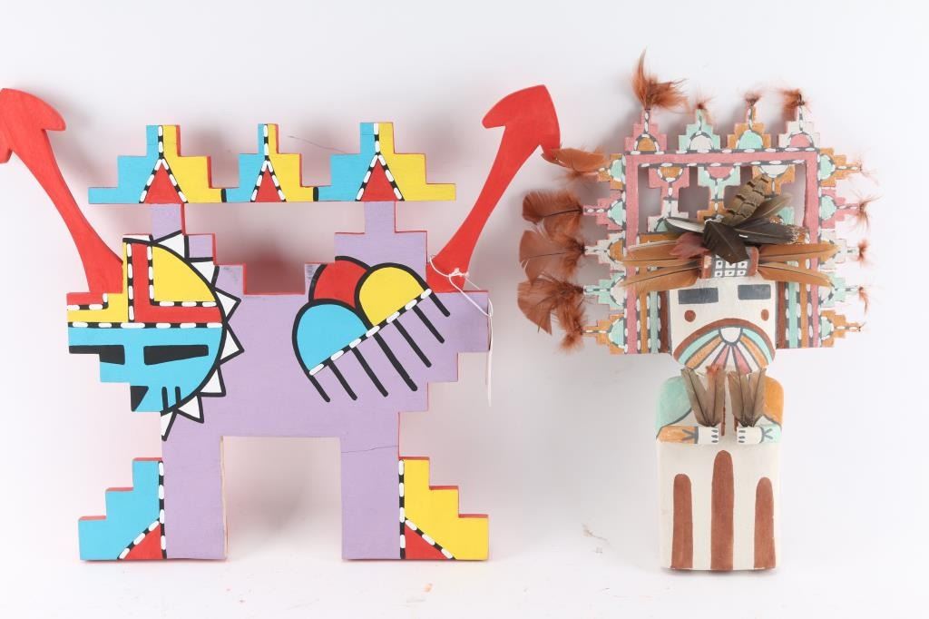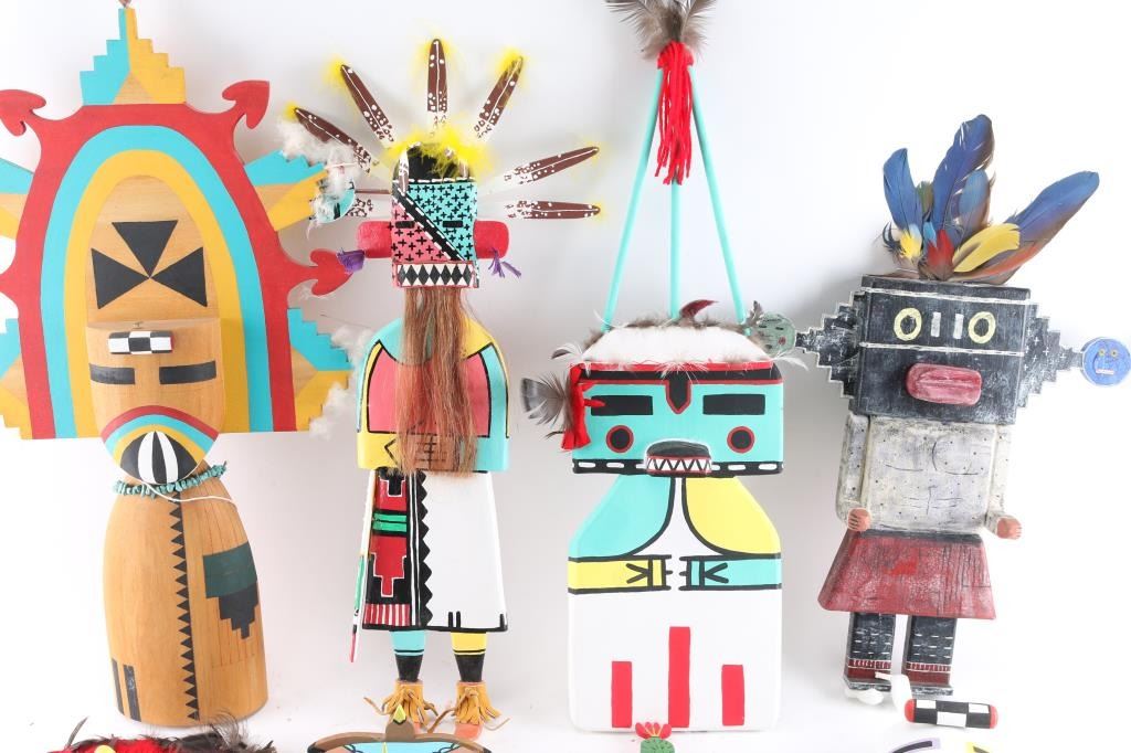 (1) Older looking flat kachina measuring 16", missing some feathers on headdress; (1) Flat kachina, makers marked and dated 09, measures 15"; (1) Flat kachina with turquoise stone necklace, measures 26"; (1) Headdress measuring 16"x18 1/2"; (1) Flat back kachina measuring 15"; (1) Flat kachina, makers marked and dated 08, measures 20 1/2", has stain at bottom and missing feather and other details; (1) Kachina-like carving measuring 20" including feathers by 20 1/2"; (1) Flat kachina with makers mark dated 09, measures 25"; (1) Hopi Whipper Milky Way kachina, by Joe Alker III, Dine artist, dated June 2011, measures 25"; (1) Flat kachina, makers marked, dated 08, measures 15", has a stain and missing some embellishments.