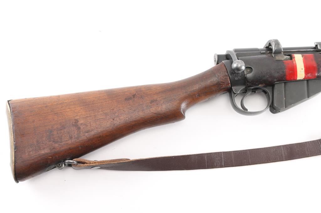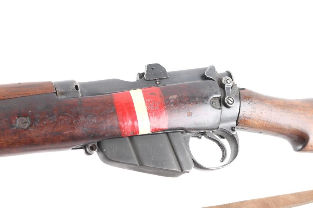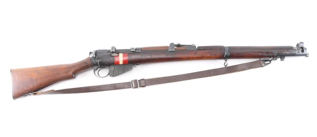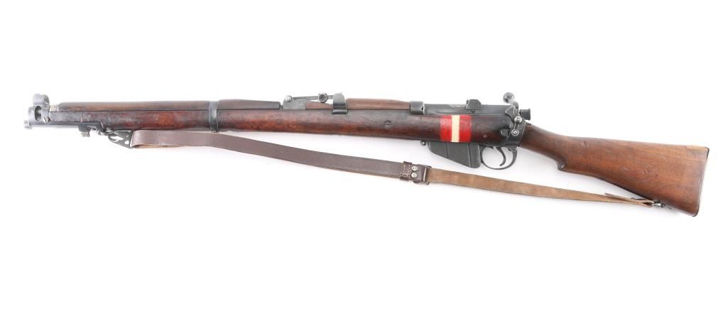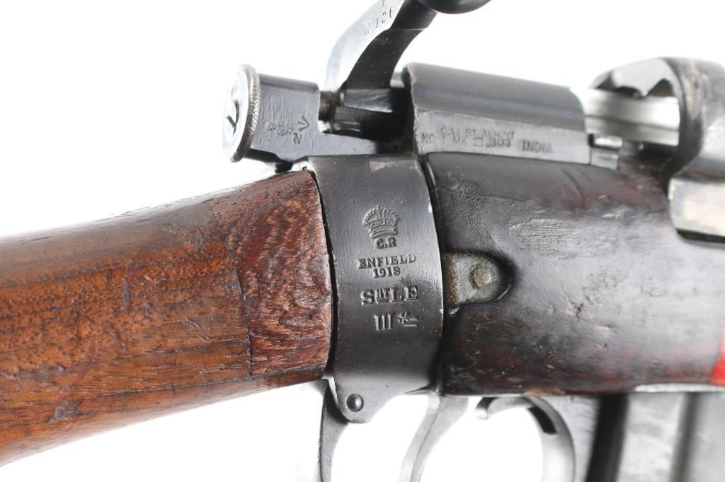 WW1 British military bolt action rifle dated 1918. Features 25" barrel, bayonet lug, protected post front sight, adjustable rear tangent sight with protective ears, 10 round detachable magazine, stripper clip guide bridge, manual safety, sling swivels, two piece wood stock with straight grip, brass buttplate with trap door storage compartment. HAs the British BRB red/white stripes painted on the stock sides above the magazine, indicates that the rifle is a drill purpose (DP) rifle, meaning it has been modified to be safe to handle for training purposes. Do not attempt to shoot it. Bore is very good condition, with strong rifling. Retains about 70% finish with handling/edge wear. Wood is good condition with scratches/dings, with wood plugged repairs, on the lower comb and the upper right butt stock were it meets the socket. Many British proofs and stock cartouches. Imported from India by C/A/I/ marked on the right receiver. Non-regulation military brown leather sling with snap hook attached. NRA Condition-Good/Non-Firing. C&R Firearm.