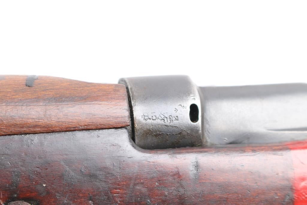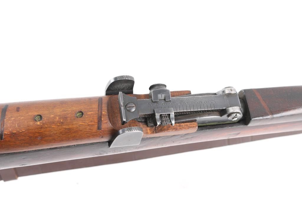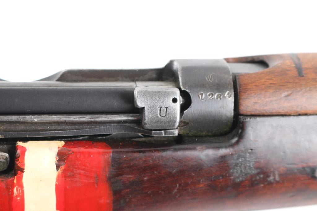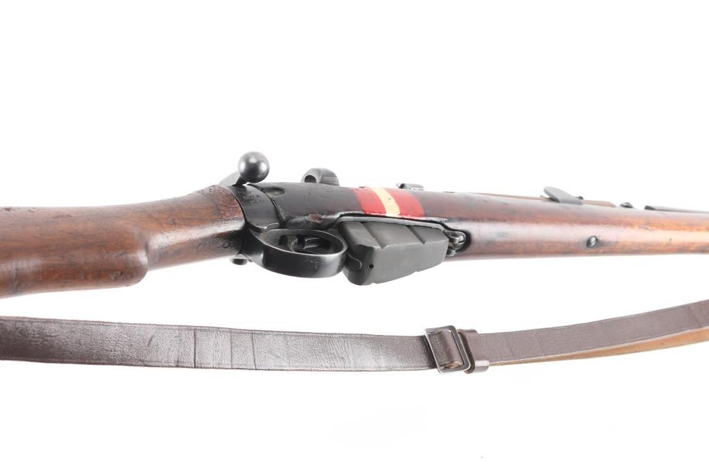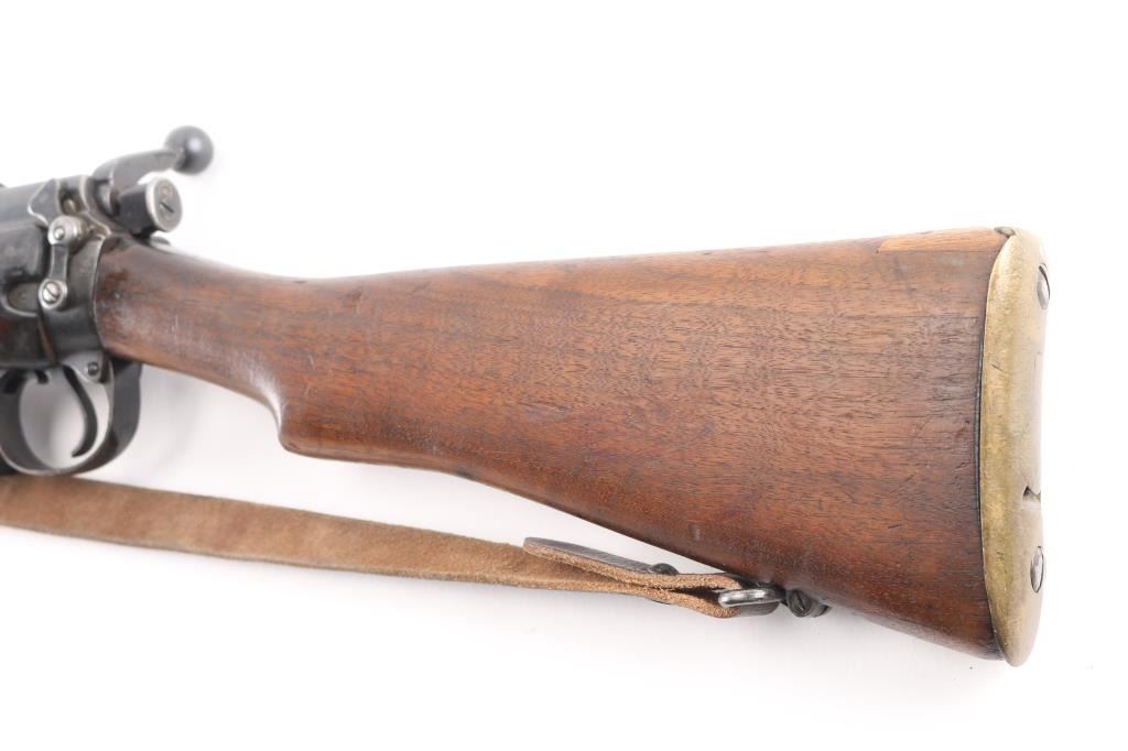 WW1 British military bolt action rifle dated 1918. Features 25" barrel, bayonet lug, protected post front sight, adjustable rear tangent sight with protective ears, 10 round detachable magazine, stripper clip guide bridge, manual safety, sling swivels, two piece wood stock with straight grip, brass buttplate with trap door storage compartment. HAs the British BRB red/white stripes painted on the stock sides above the magazine, indicates that the rifle is a drill purpose (DP) rifle, meaning it has been modified to be safe to handle for training purposes. Do not attempt to shoot it. Bore is very good condition, with strong rifling. Retains about 70% finish with handling/edge wear. Wood is good condition with scratches/dings, with wood plugged repairs, on the lower comb and the upper right butt stock were it meets the socket. Many British proofs and stock cartouches. Imported from India by C/A/I/ marked on the right receiver. Non-regulation military brown leather sling with snap hook attached. NRA Condition-Good/Non-Firing. C&R Firearm.