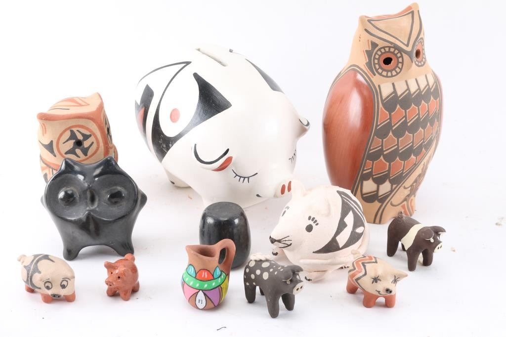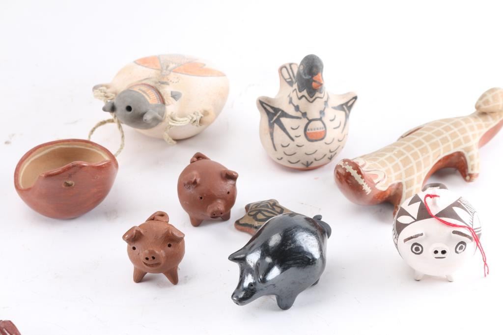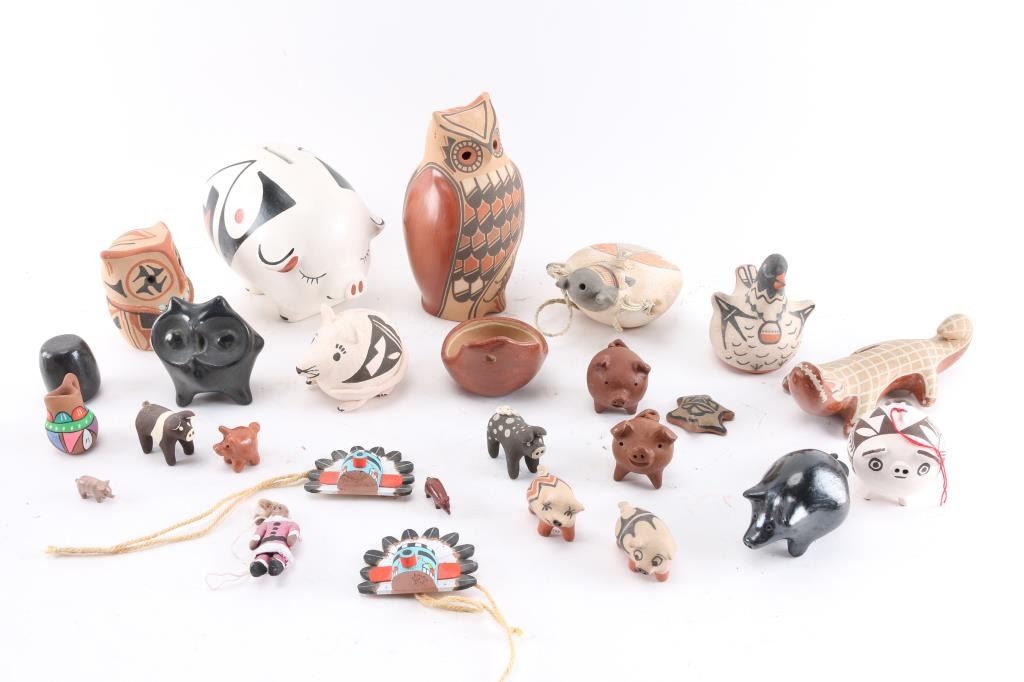 Includes 12 pigs (stone and pottery), 1 alligator, 3 owls, 1 turtle, 1 mouse, 1 bird, and others