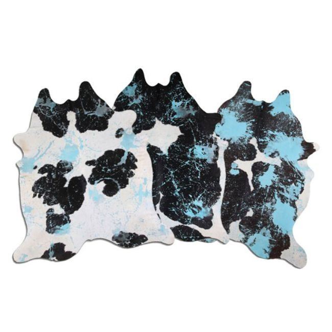 LG/XL Brazilian Aqua Splatter Distressed Black / White cowhide rugs. Measures approx. 42.5-50 square feet.**REAL COWHIDE- Color Tones & Patterns of cowhides can/will vary** Some cowhides may have scars or brand marks.