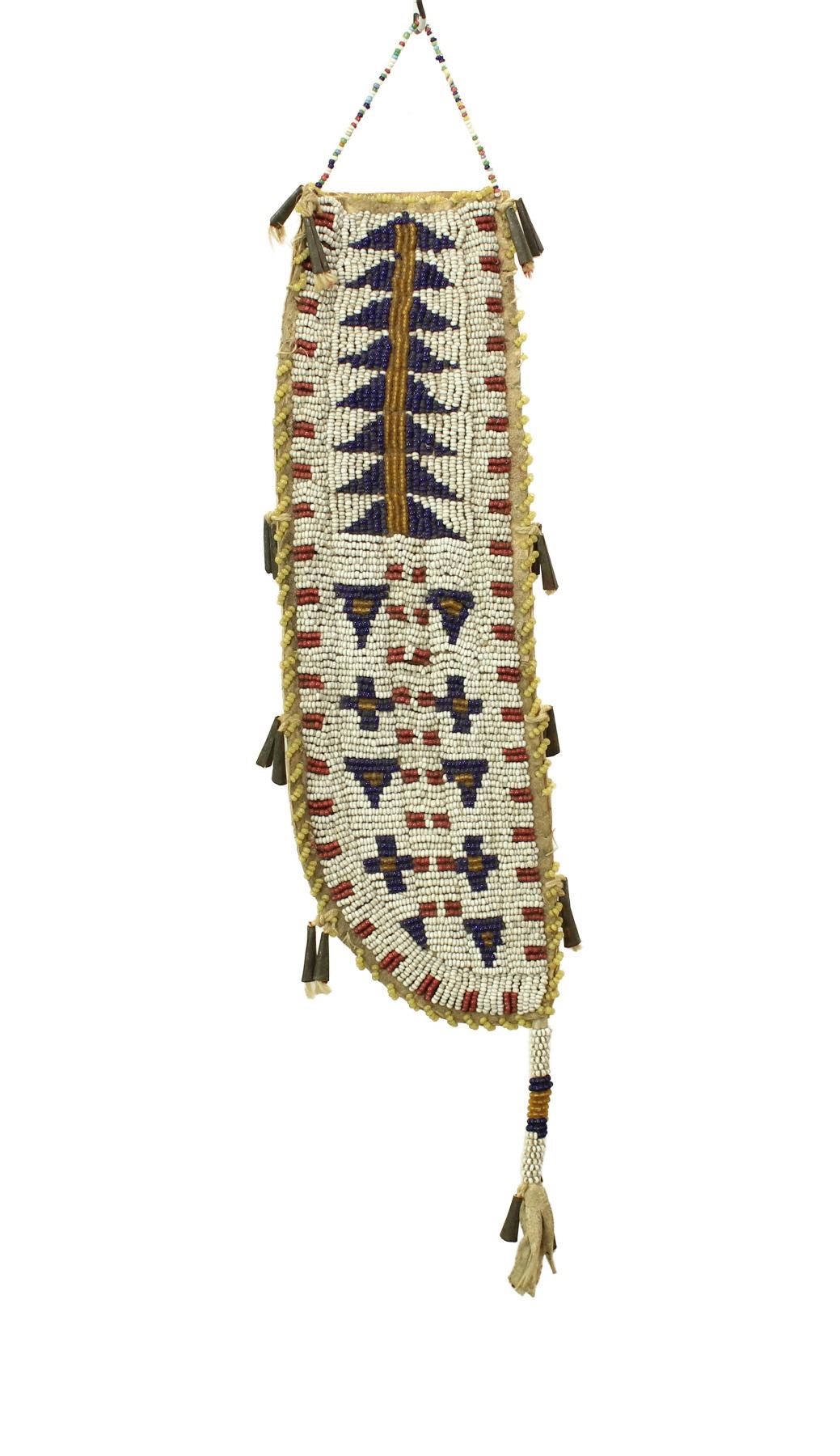 Northern Plains beaded knife sheath with mission crosses and decortive cones. Measuring 10" in length.