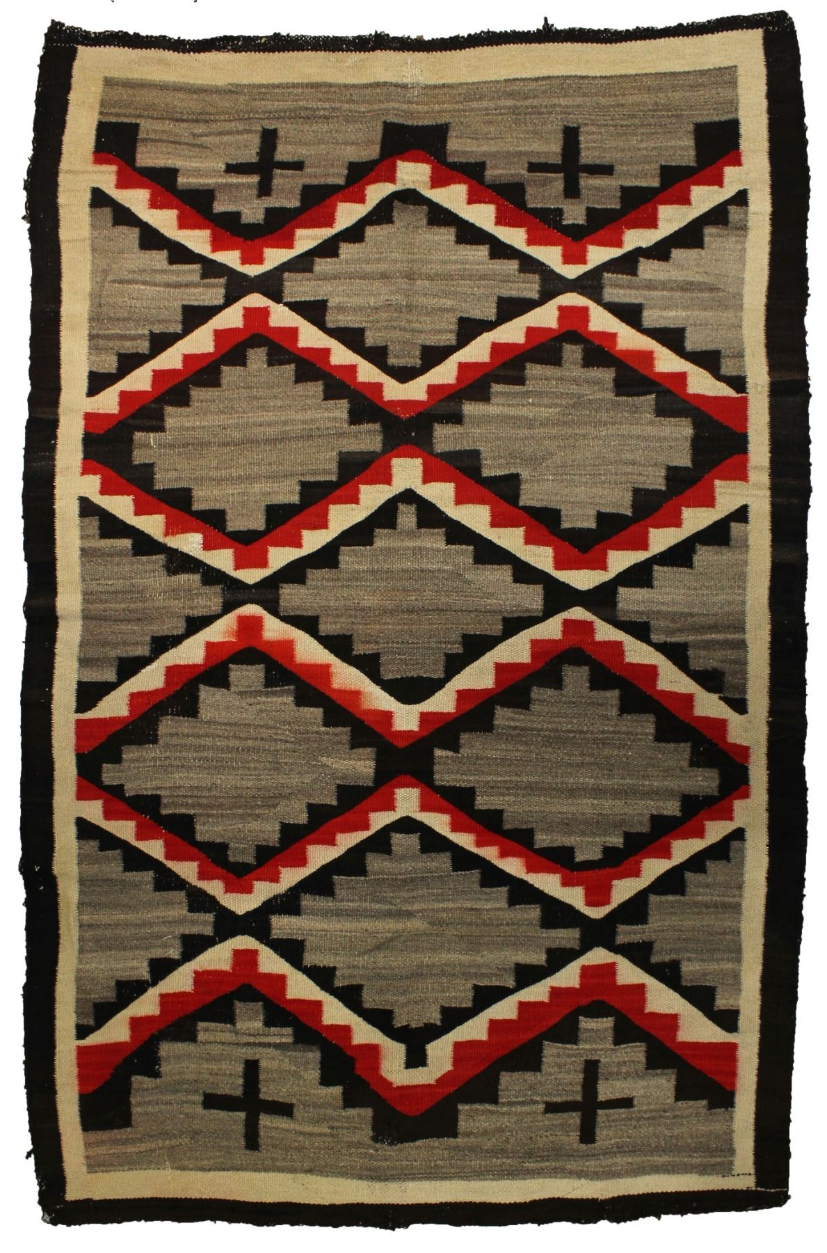 A nicely sized rug patterned with verigated diamonds and Mission Crosses, measuring 56"x 86".