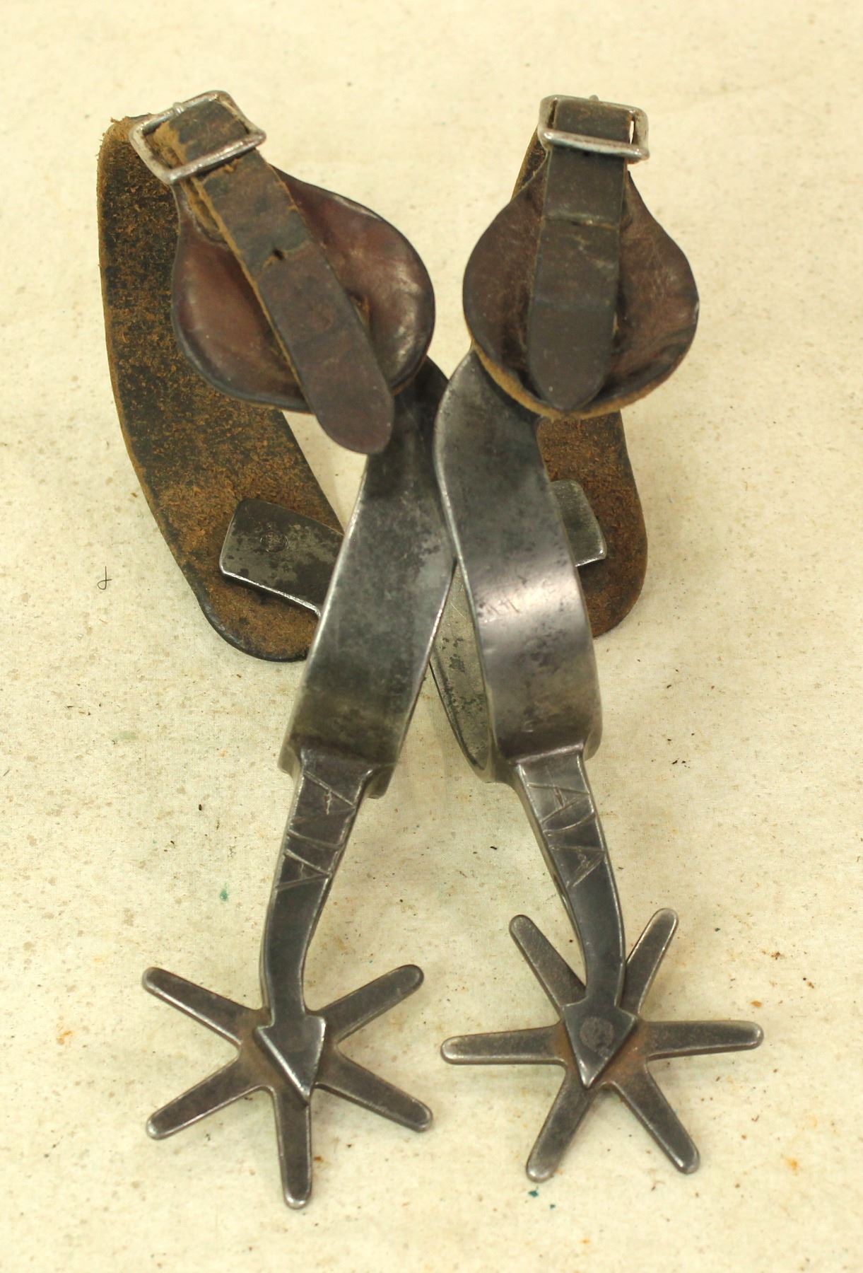 A tremendous pair of detail engraved single mounted arrow shank spurs with heart buttons, giant six point rowels, and great original straps.
