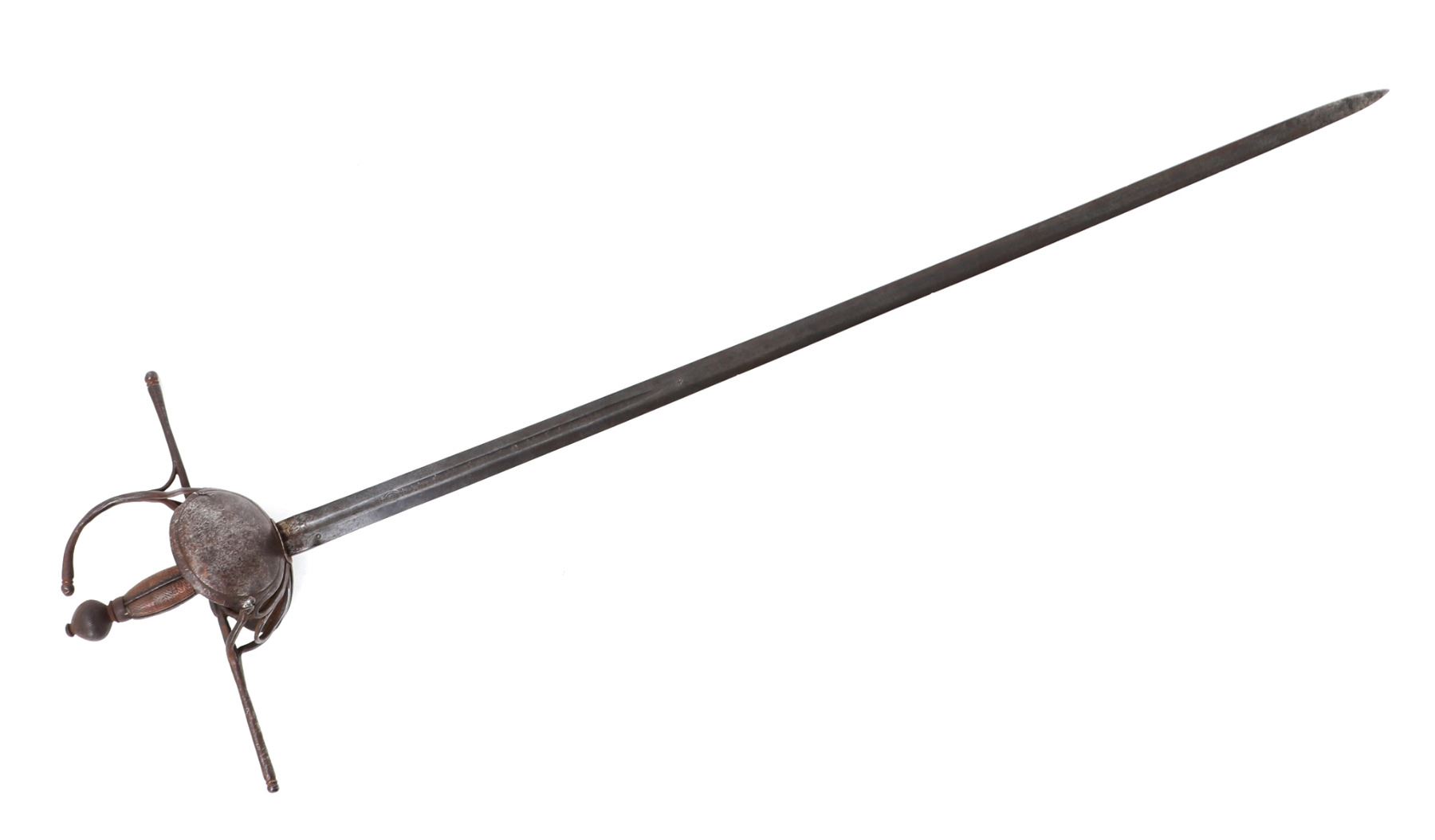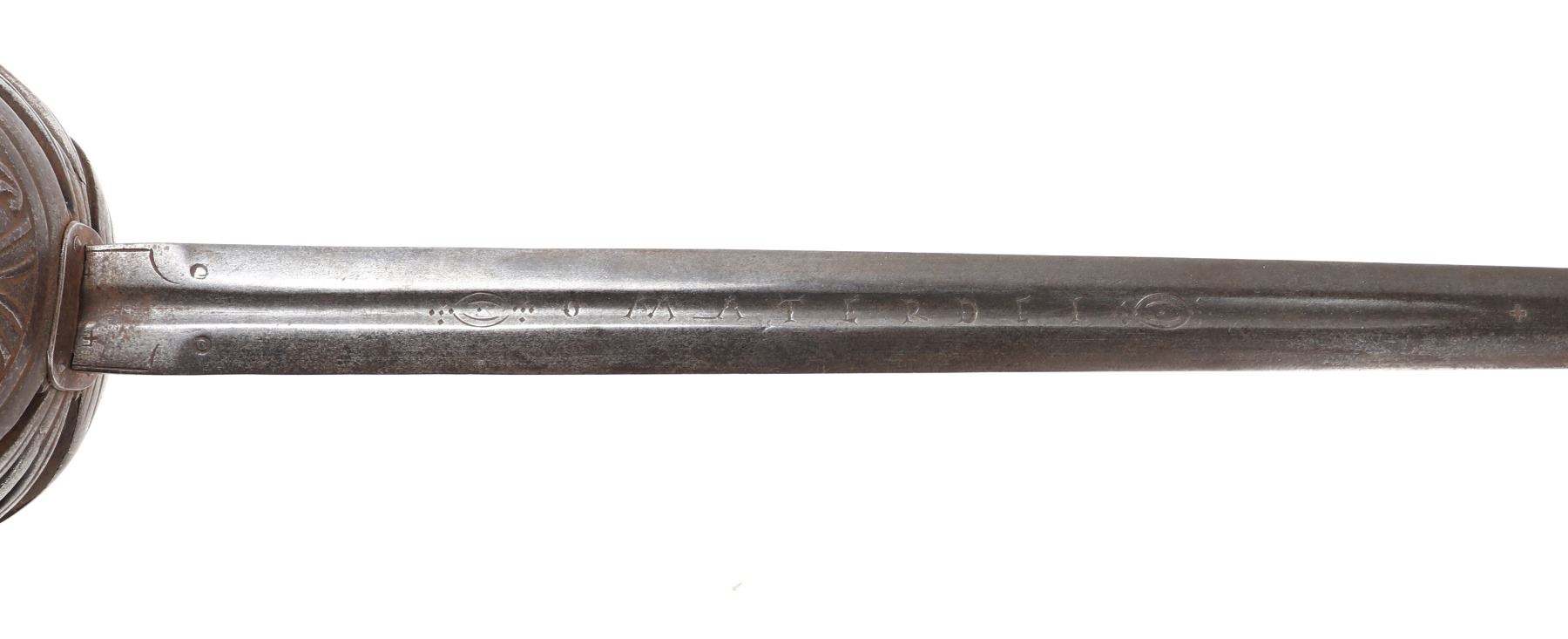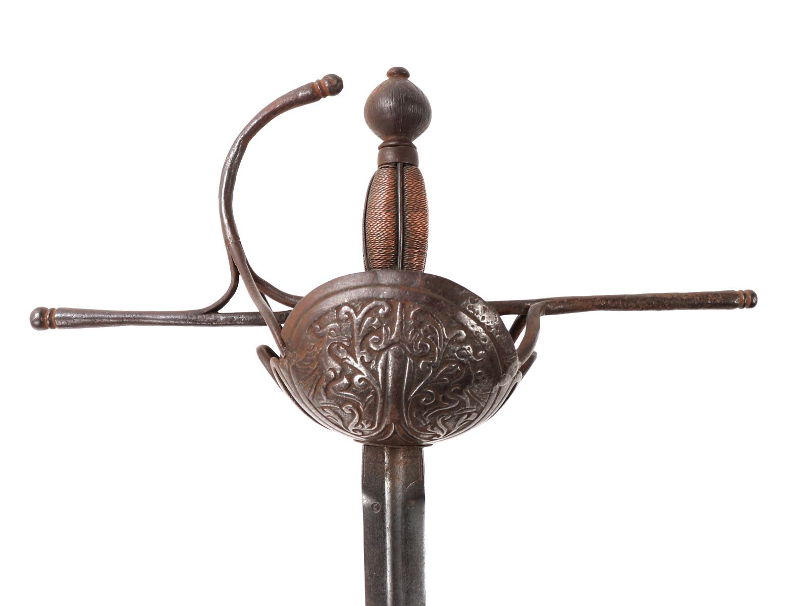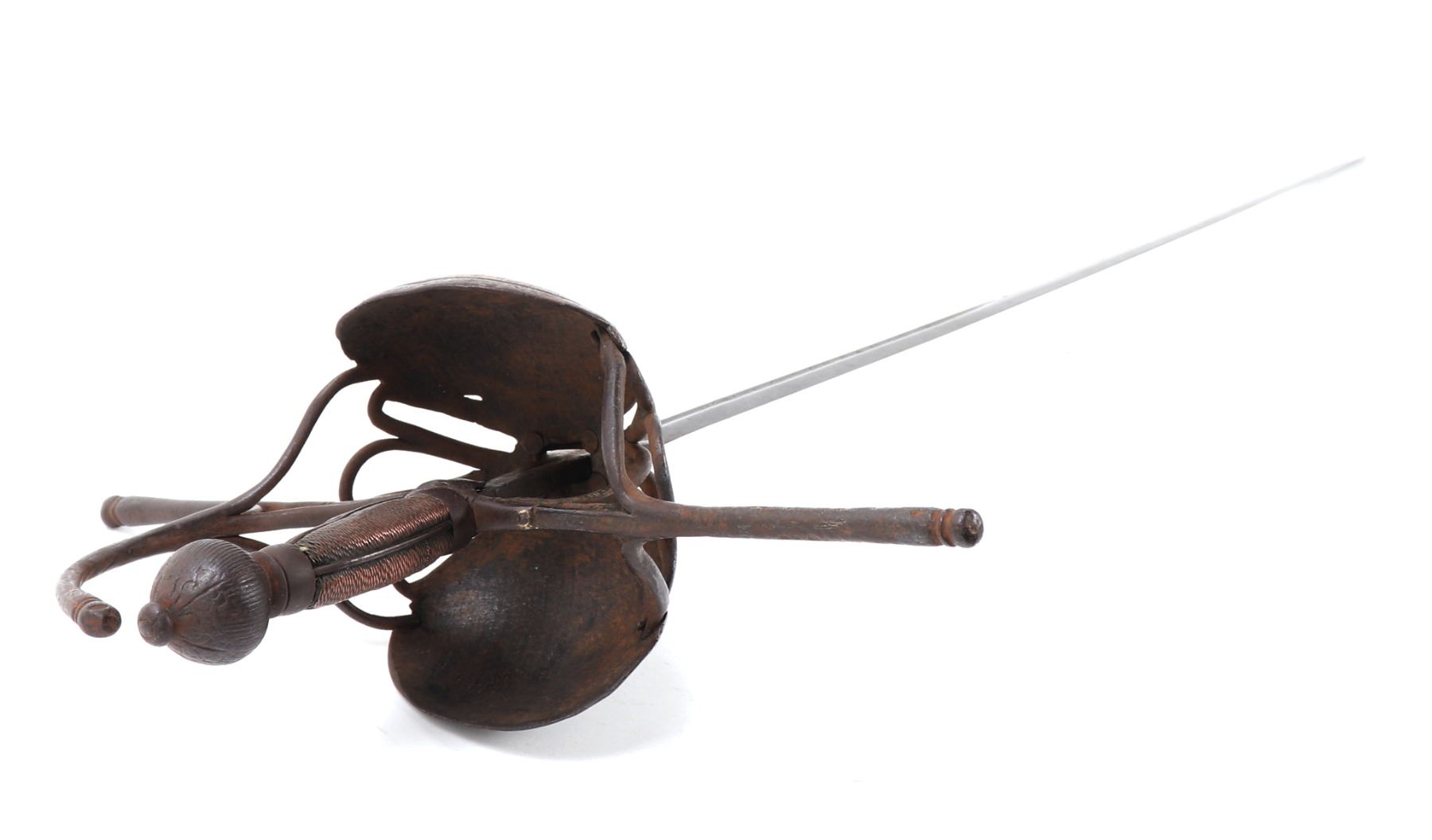 Iberian Peninsula, Spain, Spanish Colonial period 18th century cup hilt rapier. Straight double edge blade 1 1/8" wide at ricasso. Single fuller to the first portion of the blade engraved at either side with crosses and various patterns surrounding the Latin words (O mater dei memento mei) meaning (O Mother of God, remember me). Guard with a very attractive embossed bowl with pierced sides and the embossing reflecting foliate or floral motifs. Crossguard very wide straight quillion with multiple bars at either side and a single D Shaped Bar over the grip. Pommel hand peened with the grip wrapped in finely wound copper wire in four panels. Size 44 1/4", 37" to base of bowl to the tip.. Condition: Typical wear commensurate with age and use. The engraved blade clearly visible. Typical very minor looseness to bowl.. Provenance: Ex-West USA Collection