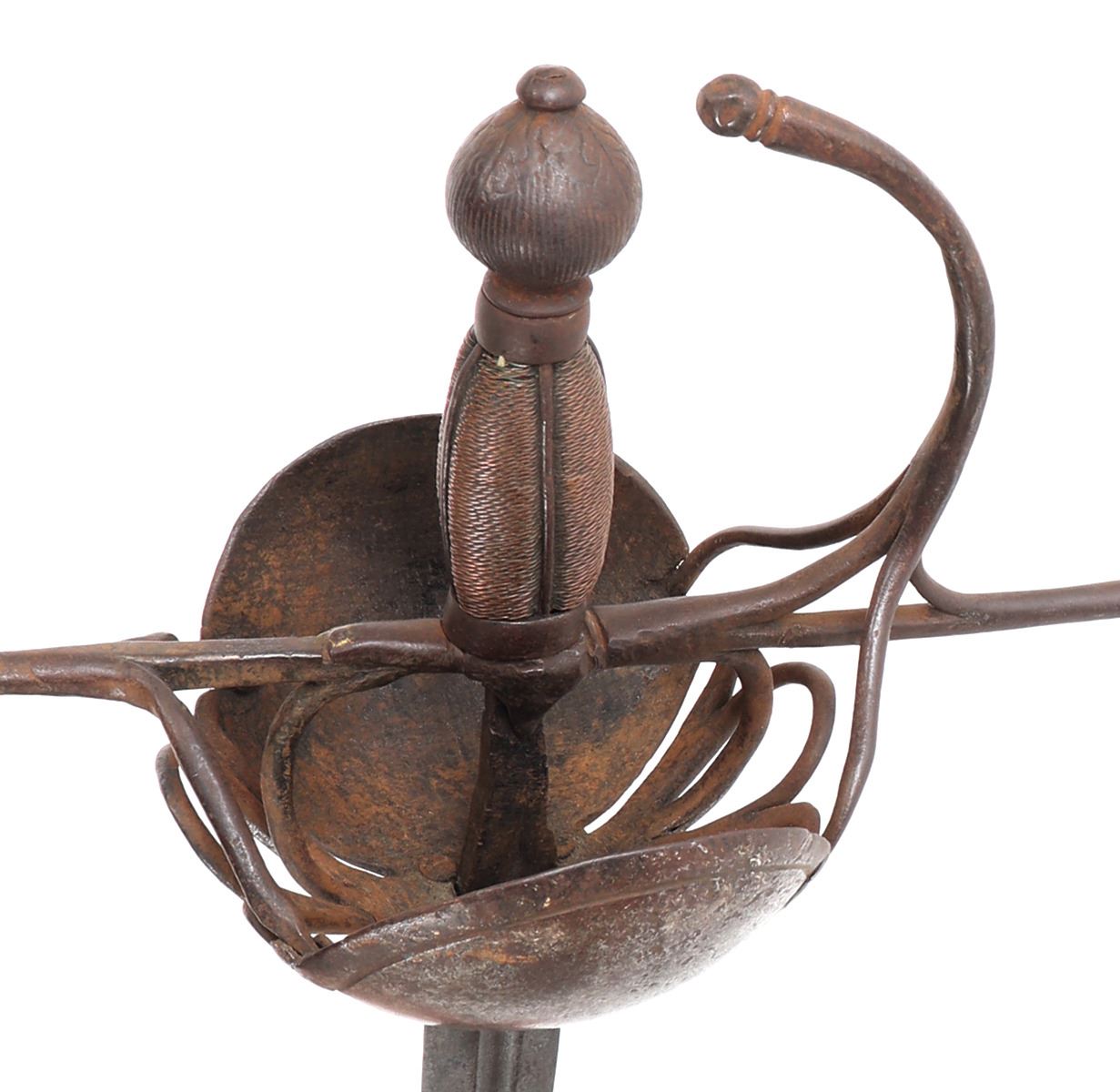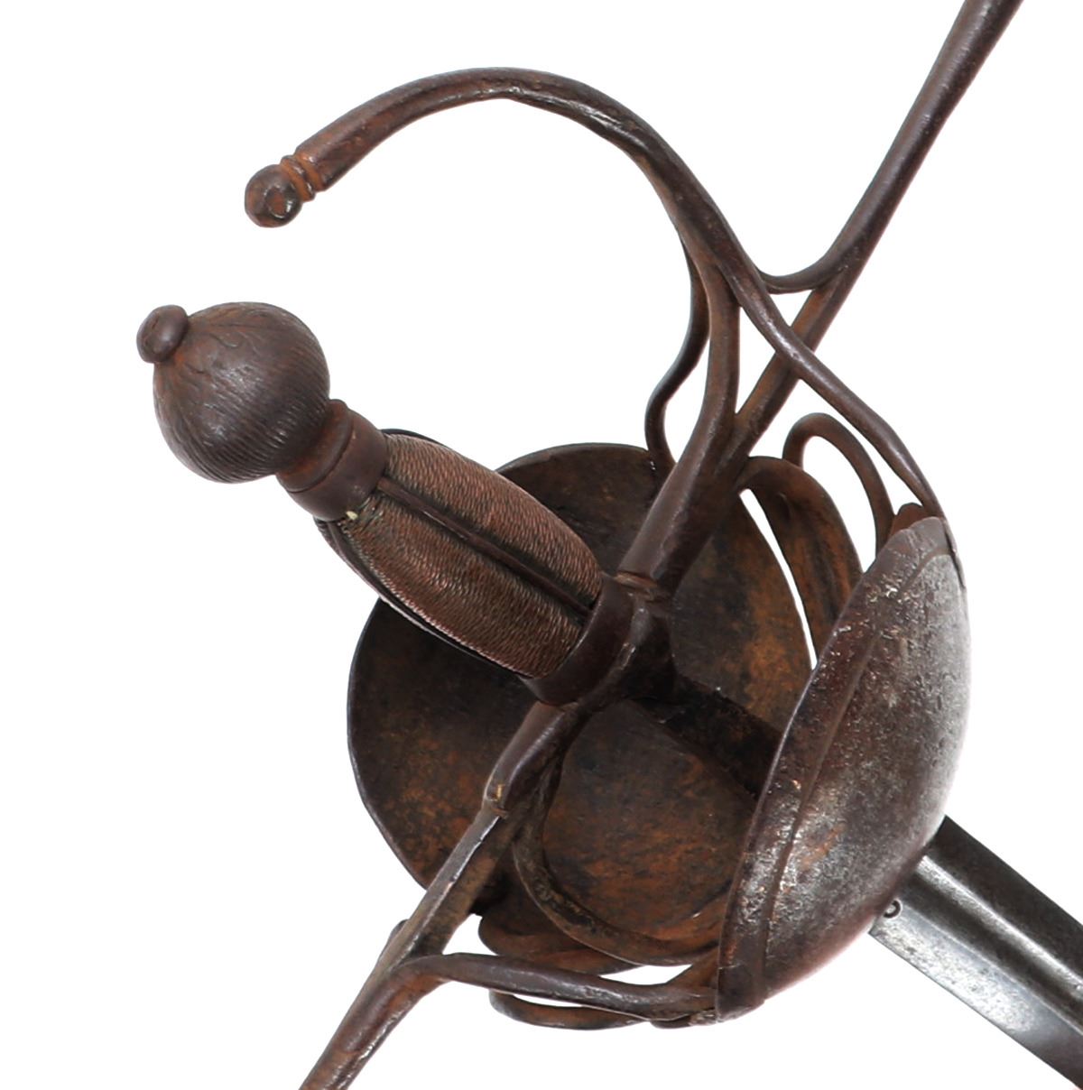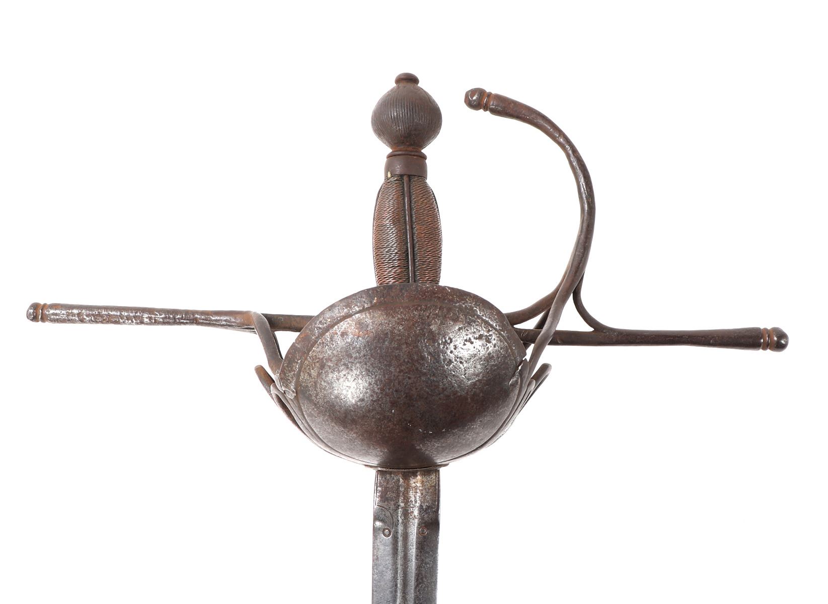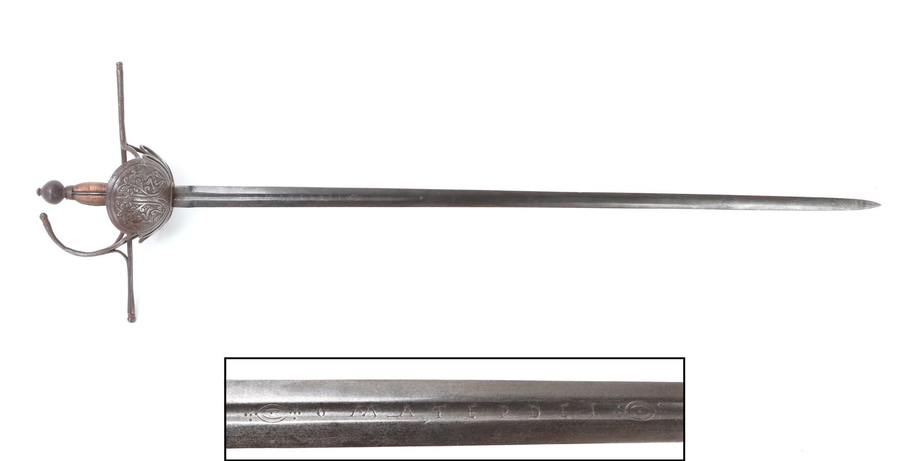 Iberian Peninsula, Spain, Spanish Colonial period 18th century cup hilt rapier. Straight double edge blade 1 1/8" wide at ricasso. Single fuller to the first portion of the blade engraved at either side with crosses and various patterns surrounding the Latin words (O mater dei memento mei) meaning (O Mother of God, remember me). Guard with a very attractive embossed bowl with pierced sides and the embossing reflecting foliate or floral motifs. Crossguard very wide straight quillion with multiple bars at either side and a single D Shaped Bar over the grip. Pommel hand peened with the grip wrapped in finely wound copper wire in four panels. Size 44 1/4", 37" to base of bowl to the tip.. Condition: Typical wear commensurate with age and use. The engraved blade clearly visible. Typical very minor looseness to bowl.. Provenance: Ex-West USA Collection