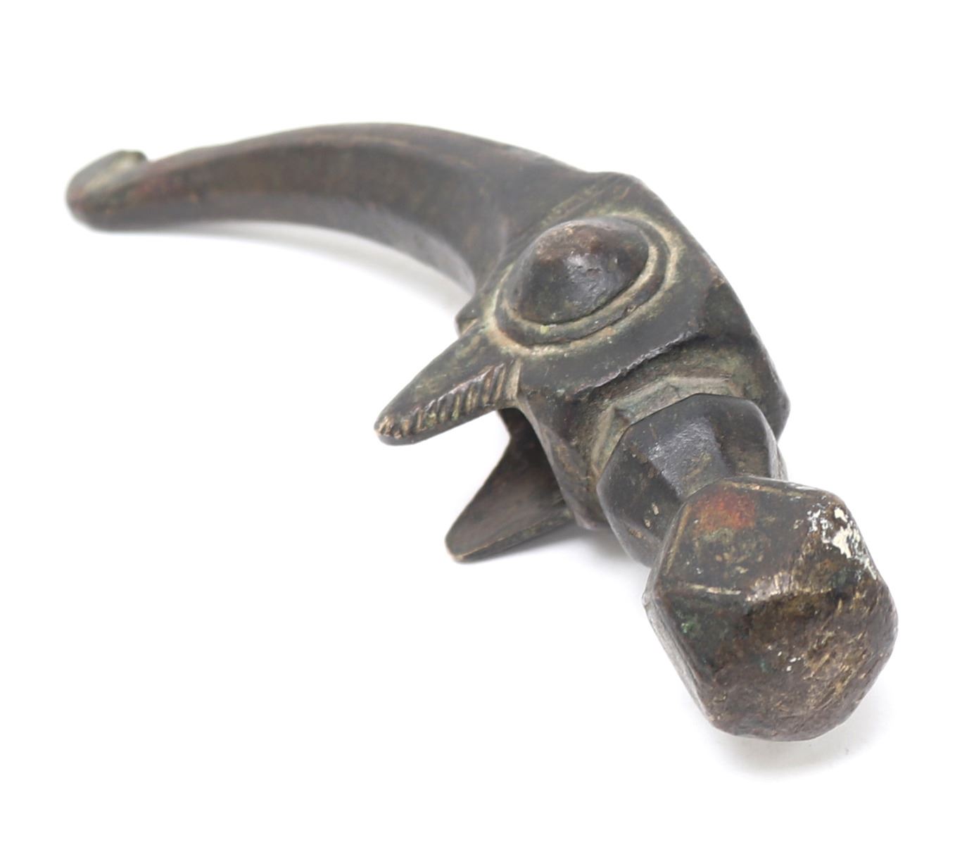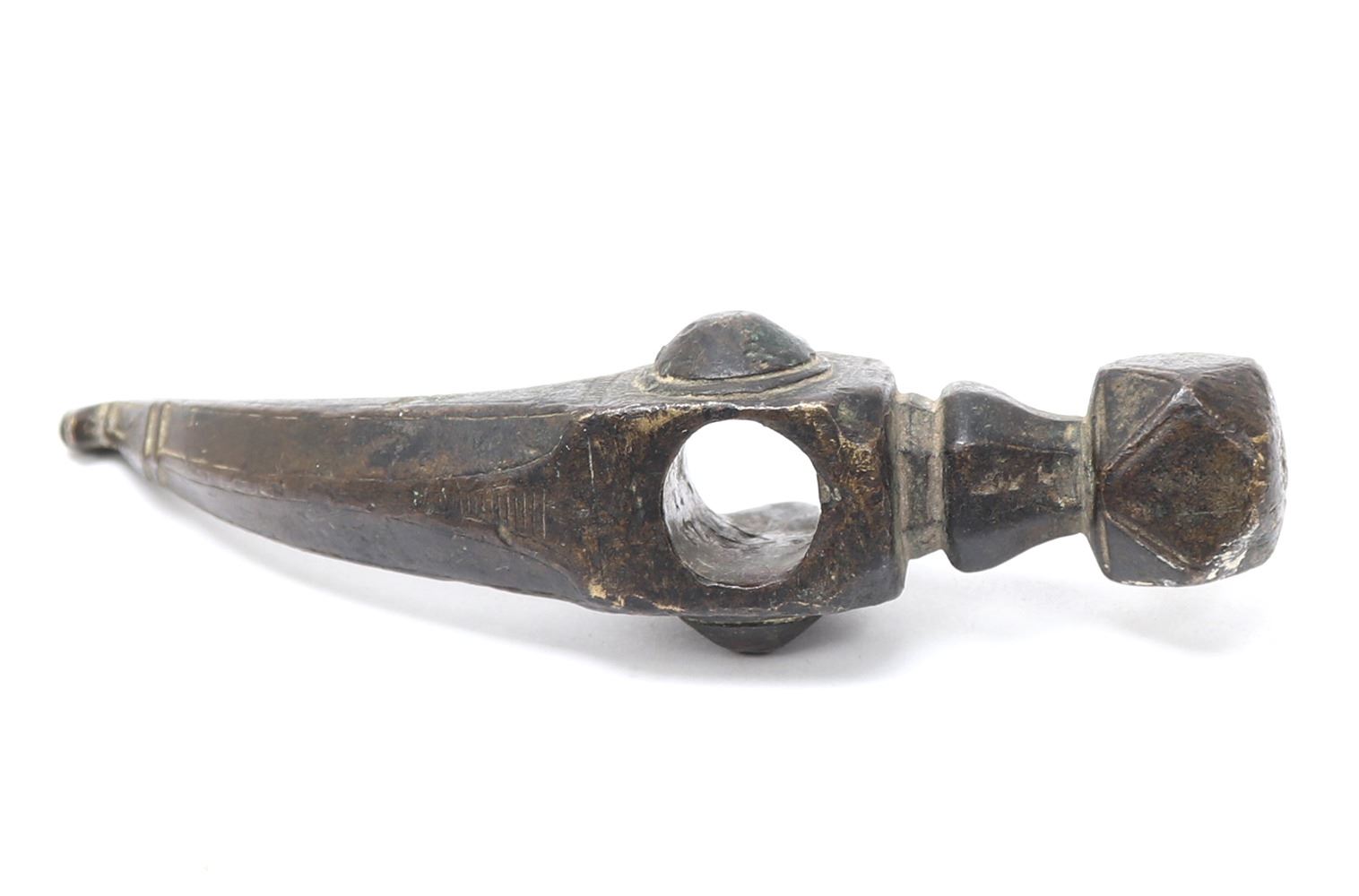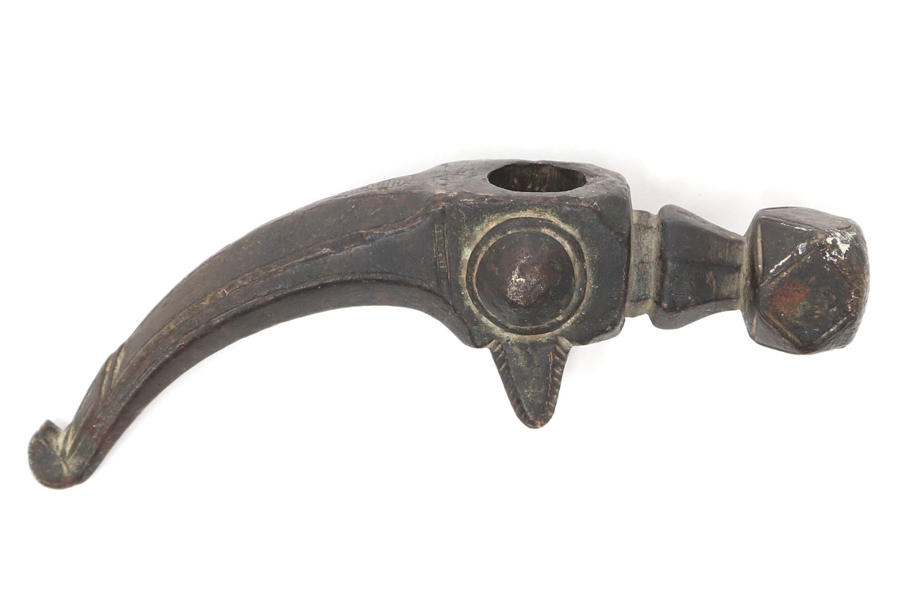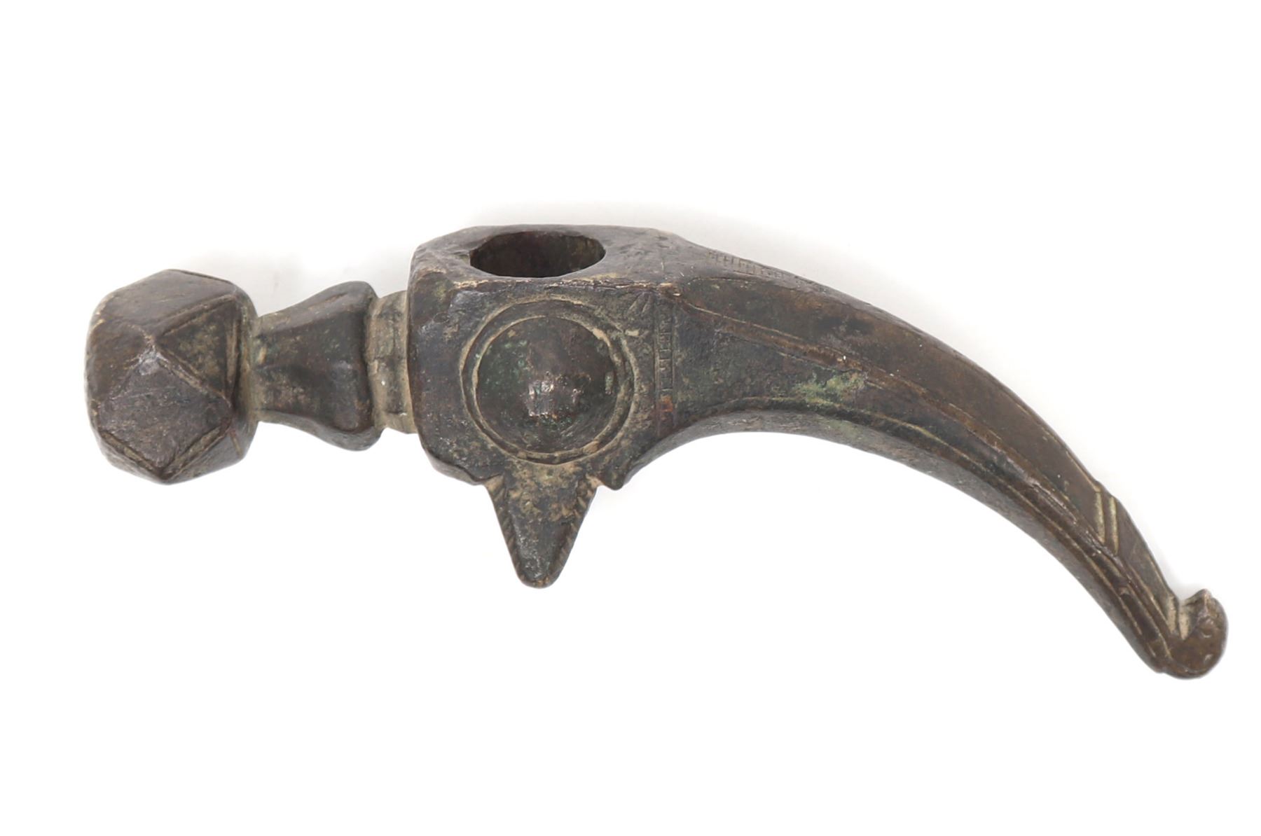 Ottoman empire, Turkish bronze Hammer of a Janissary warrior hammer probably 17th century or earlier. Well formed hammer with deep dark patination. The head a multi-faceted cube forward a tapered octagonal section. Hammer body a well carved four sided cube and a rear spike with a blunted carved tip. Possible engraved inscription or fret border before the spike at either side. Size 5 1/2" L. Provenance: Ex-USA Collection