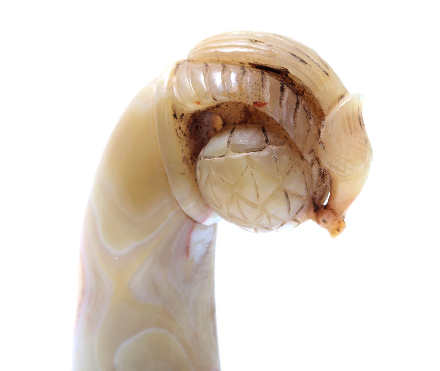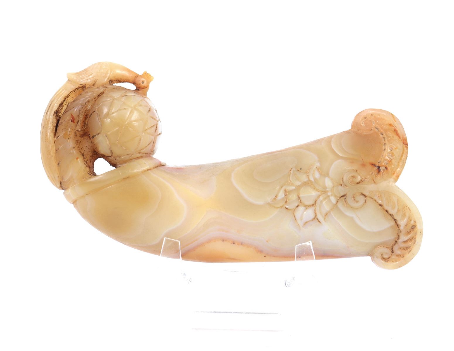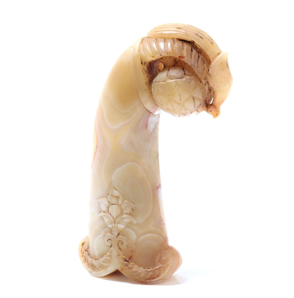 Indian possibly Mughal period hardstone agate handle in the form of an abstract fruit wrapped with a finely carved peacock. The lower section with a wonderful blossoming floral motif and varied colors of stone in high polish. Size 5" L x 1" W x 3" H, weight 302g. Condition: Ex-western USA collection, ex-Tucson, Arizona collection