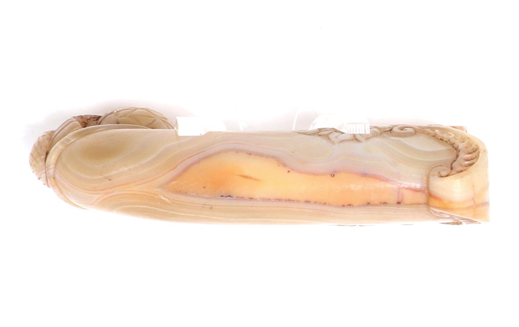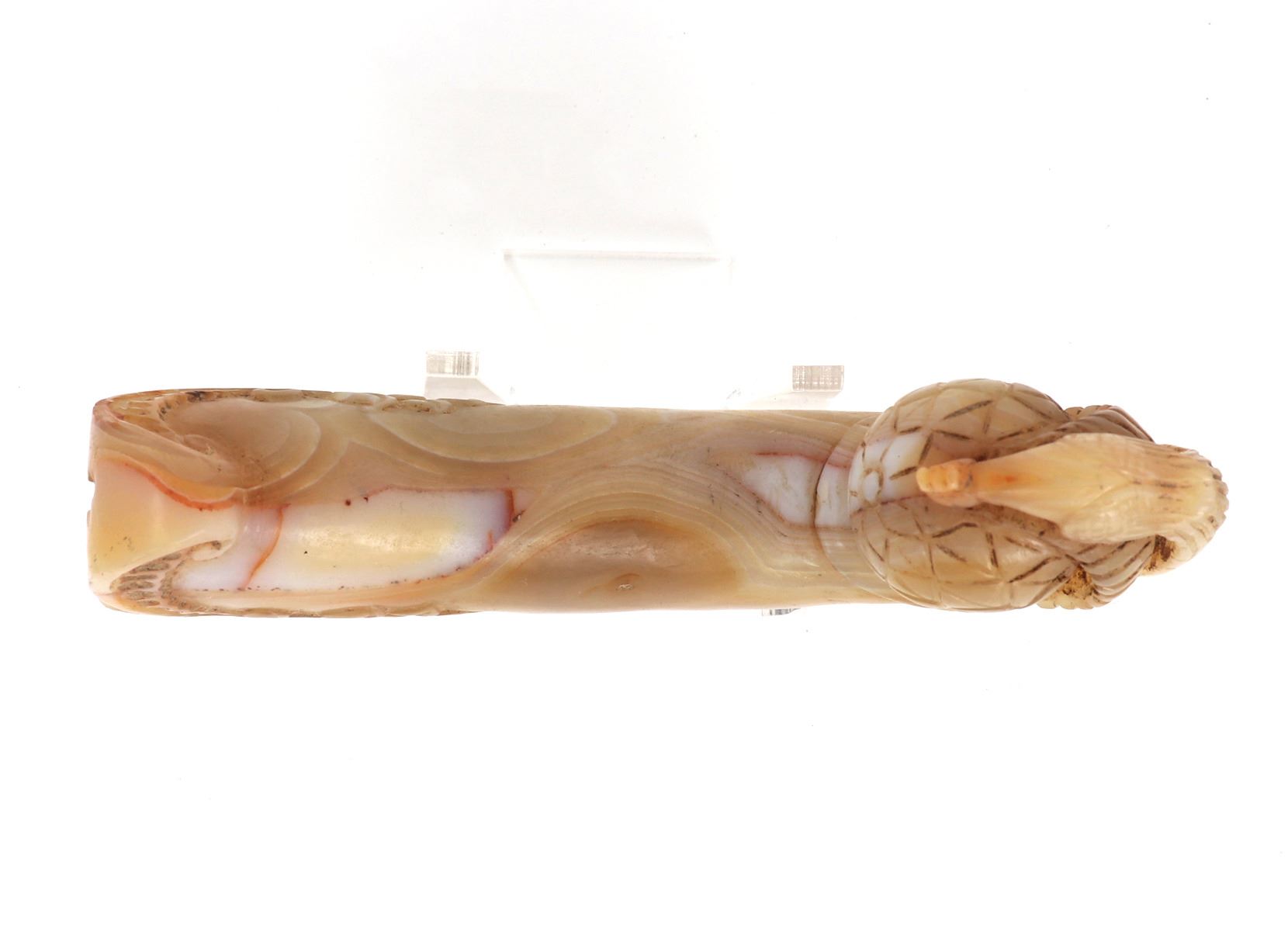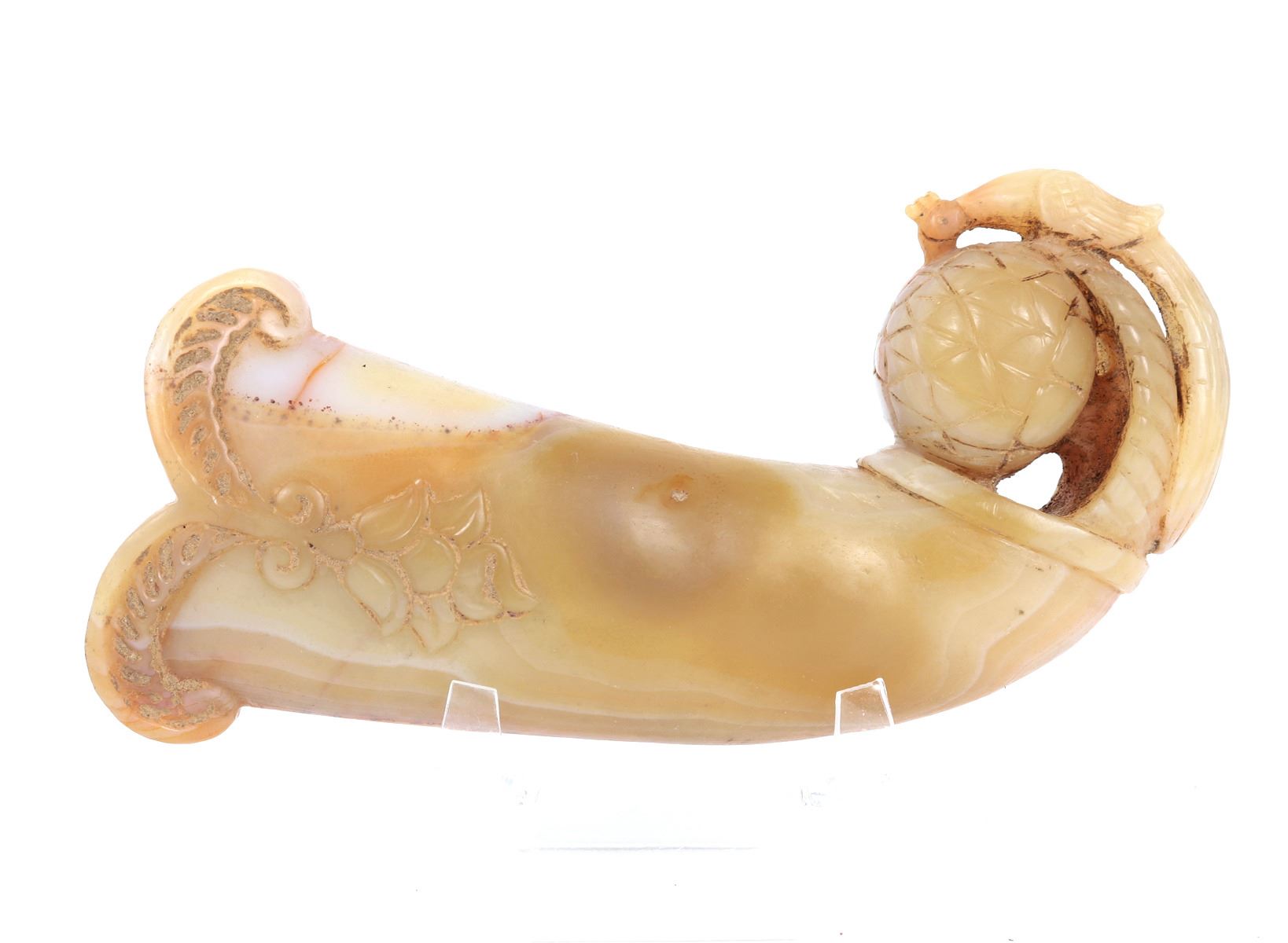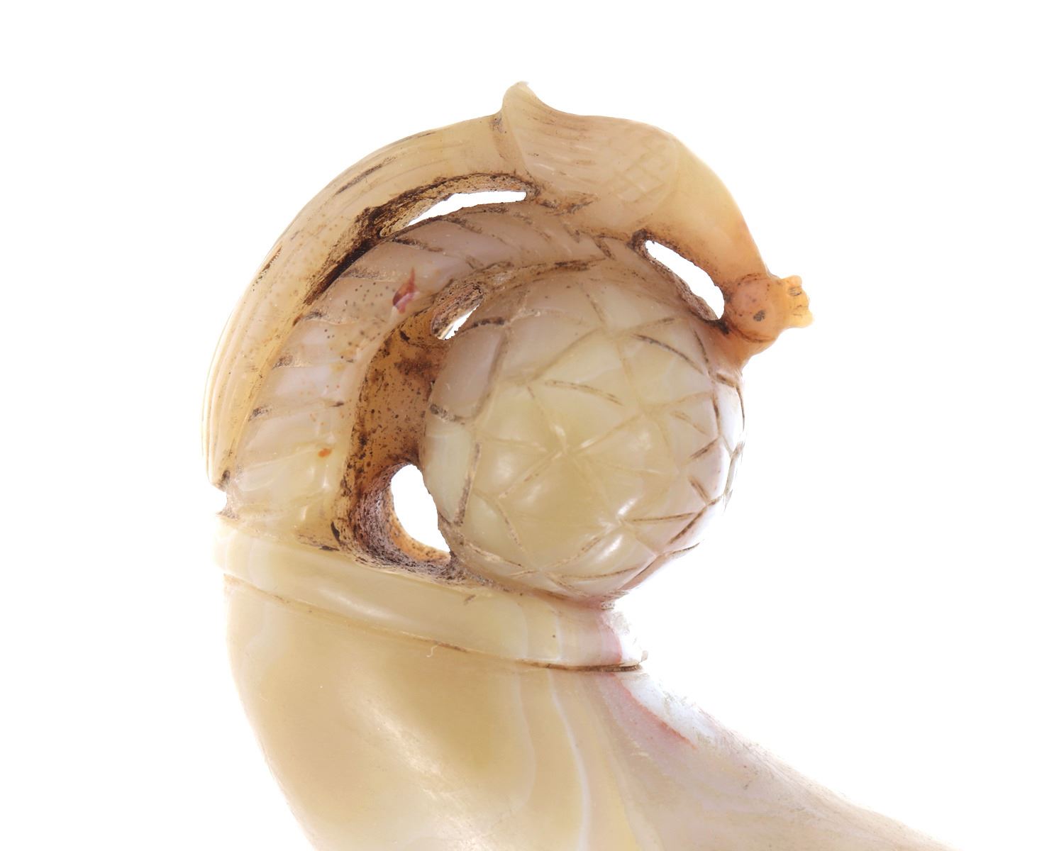 Indian possibly Mughal period hardstone agate handle in the form of an abstract fruit wrapped with a finely carved peacock. The lower section with a wonderful blossoming floral motif and varied colors of stone in high polish. Size 5" L x 1" W x 3" H, weight 302g. Condition: Ex-western USA collection, ex-Tucson, Arizona collection