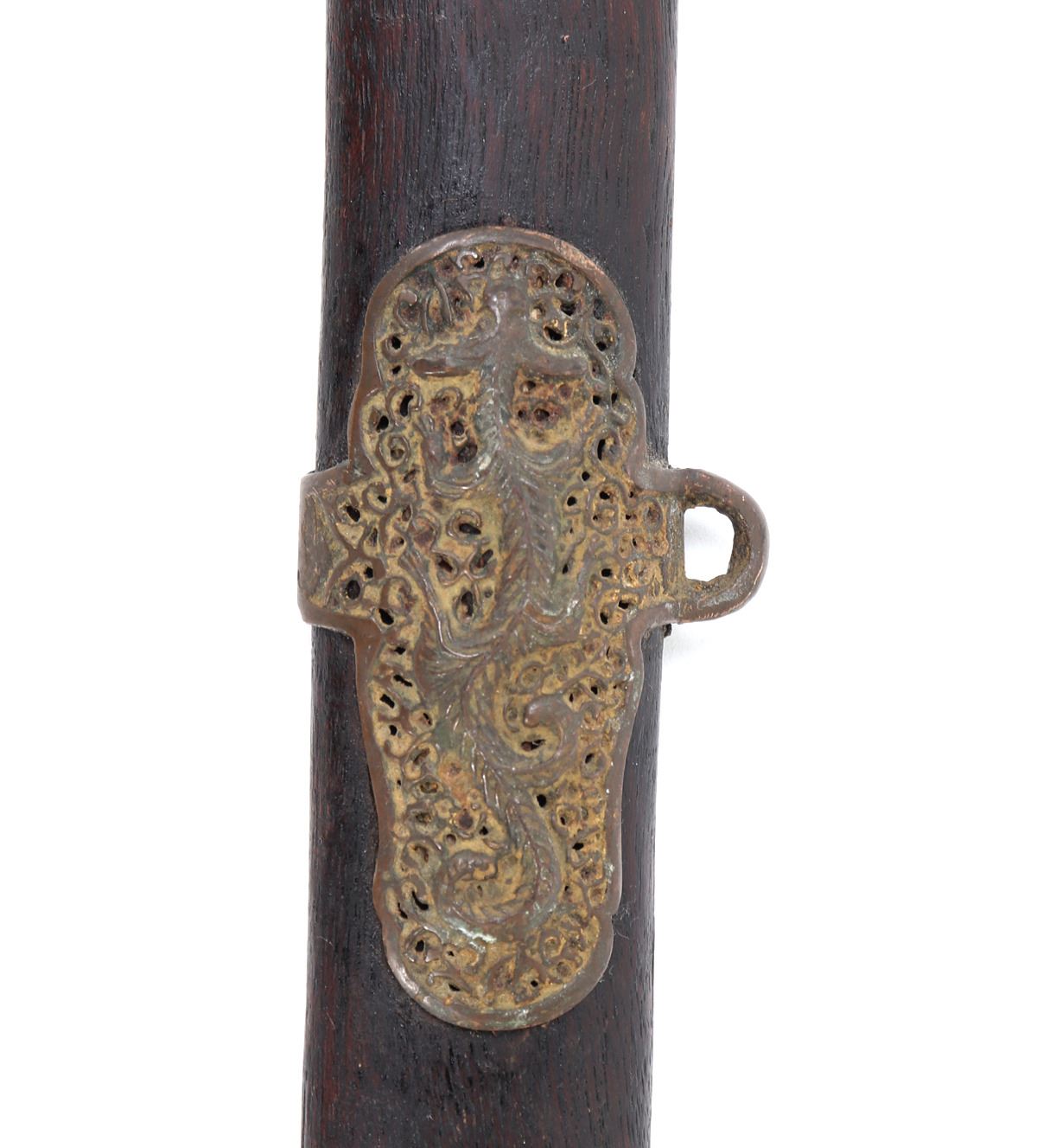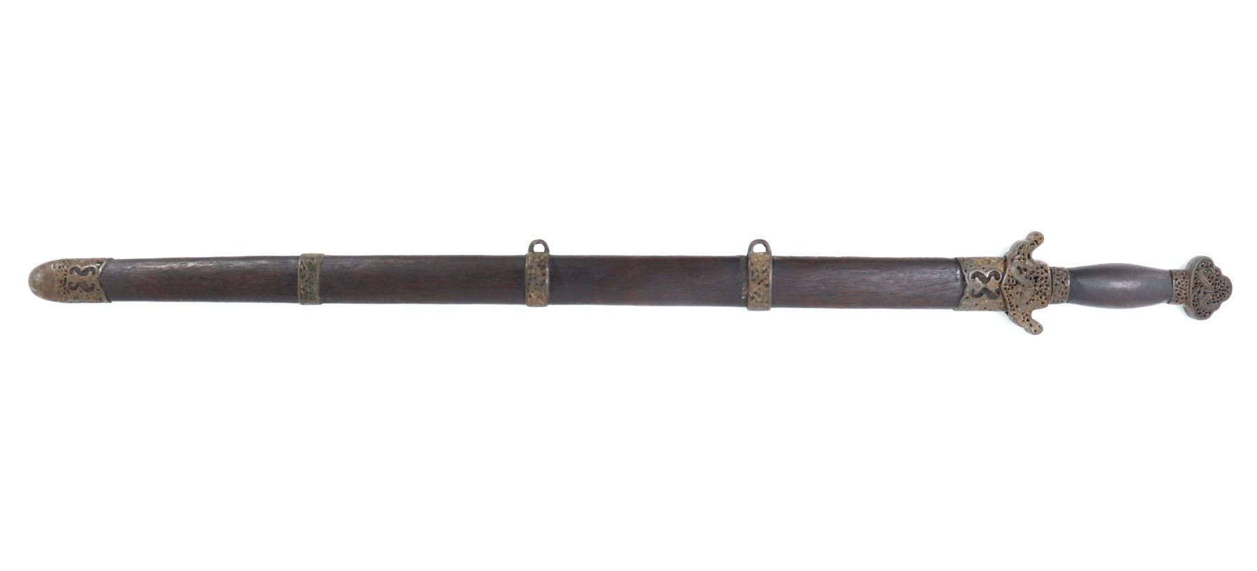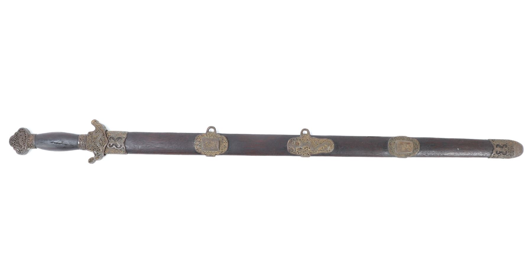 Old Chinese Jian sword and scabbard. Straight double edged blade with brass inlaid circles to either side of the fuller. Mounts in pierced brass openwork with dragons and inscribed motifs throughout. Size 36 1/8" L, Blade 28 7/8" L. Condition: good condition overall. Provenance: Ex-Southern California Estate