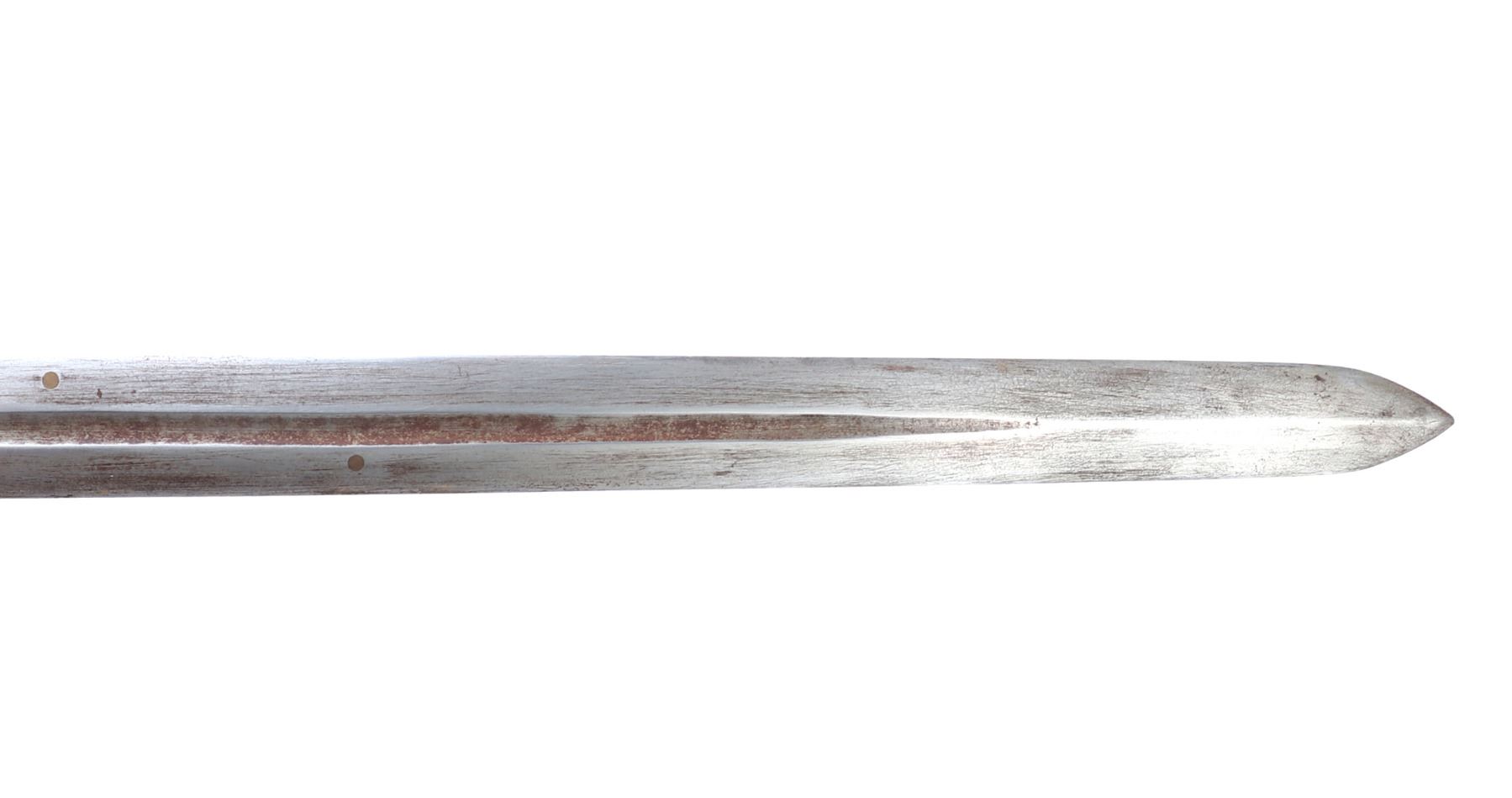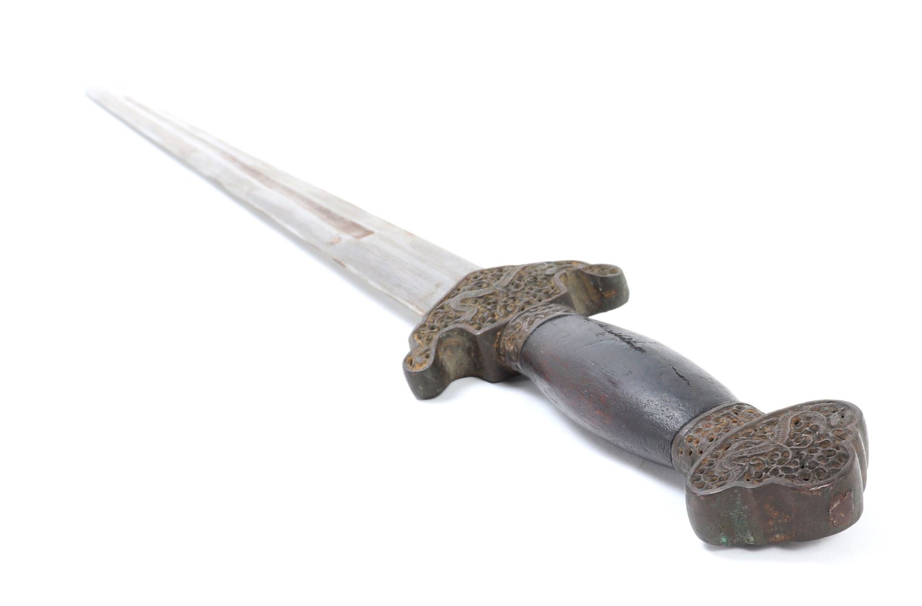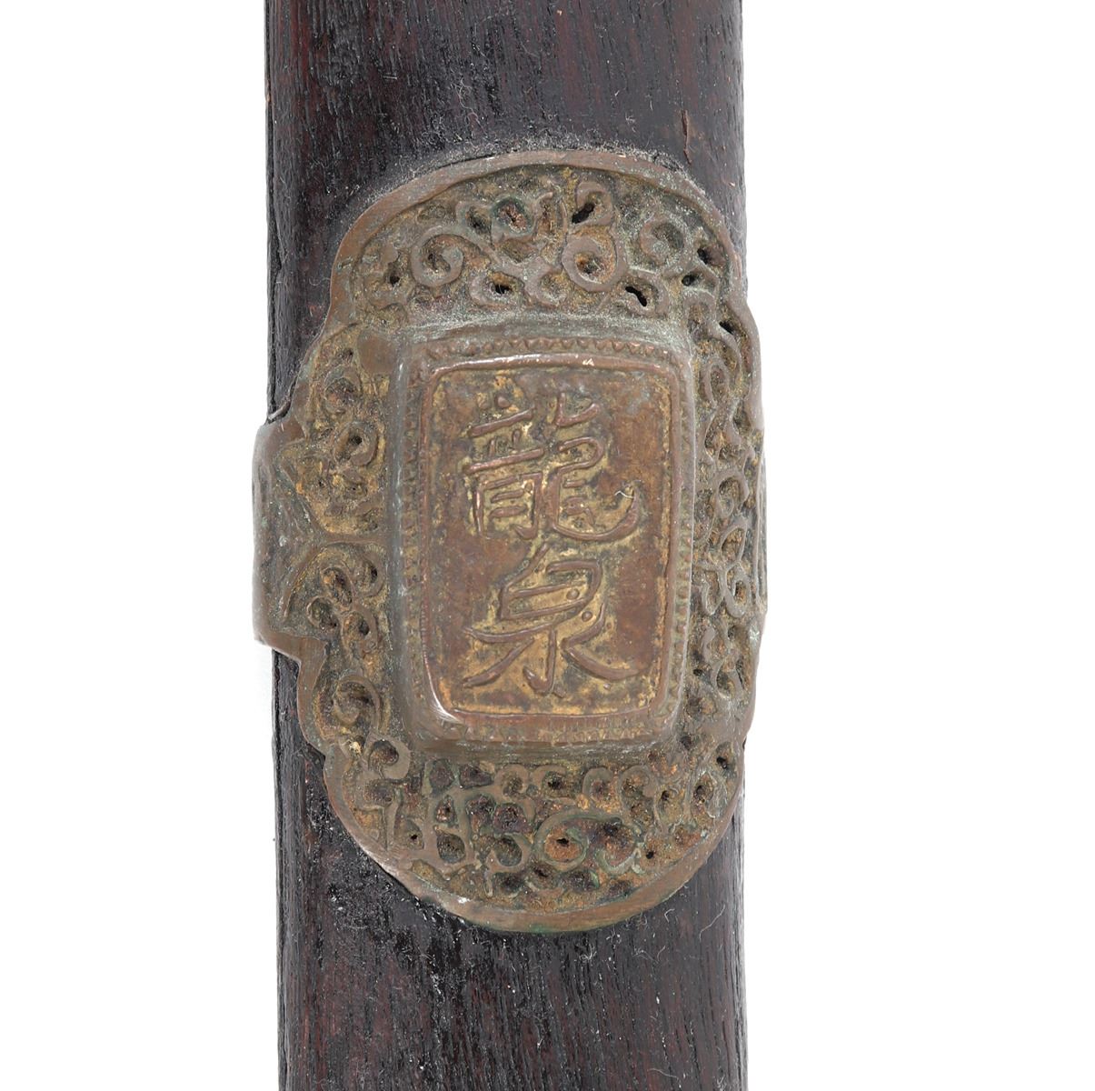 Old Chinese Jian sword and scabbard. Straight double edged blade with brass inlaid circles to either side of the fuller. Mounts in pierced brass openwork with dragons and inscribed motifs throughout. Size 36 1/8" L, Blade 28 7/8" L. Condition: good condition overall. Provenance: Ex-Southern California Estate