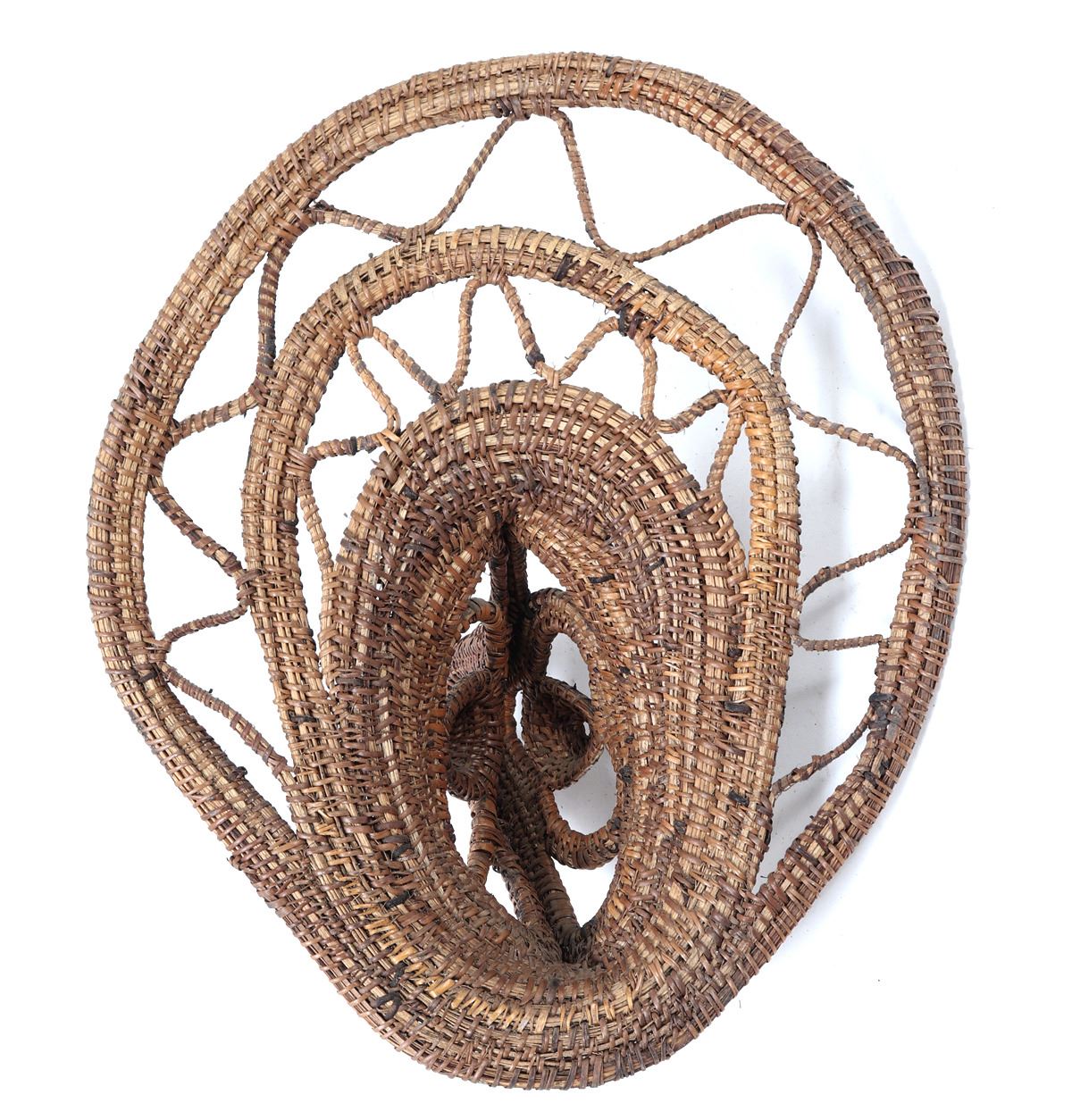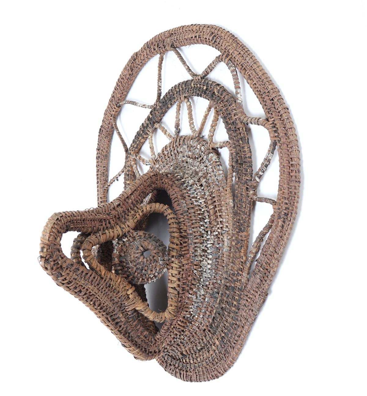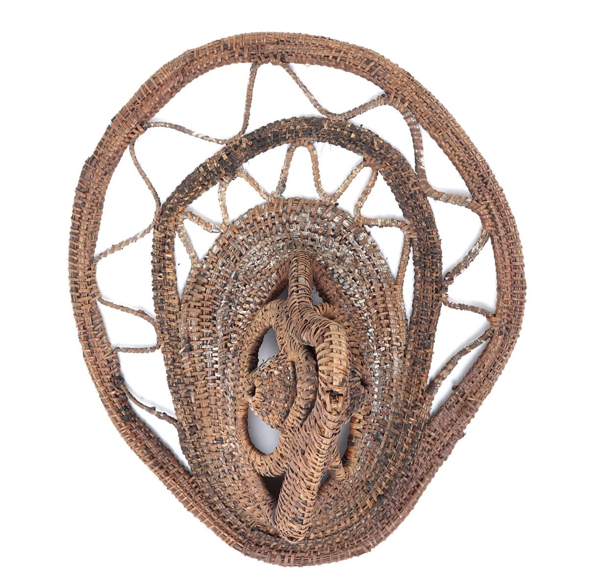 Late 20th century. Abelam people, Papua New Guinea. Hand woven and shaped wood and fiber Yam mask. Wonderfully accented and detailed with orange, black and white pigment throughout. Pointed avian style face with a double halo design. Masks such as these were used in ceremonies to honor yams, which are considered and often treated like living ancestors or prestige objects. Size 15 1/8" L. Condition: Good condition with some soiling.. Provenance: Collected prior to 2008, ex-Lacy Gallery (Vanna & Lee Lacy collection), Los Angeles CA. Lacy Gallery was founded upon six decades of collecting ethnographic and fine art. Lee Lacy was a distinguished Hollywood producer of iconic TV series and commercials.