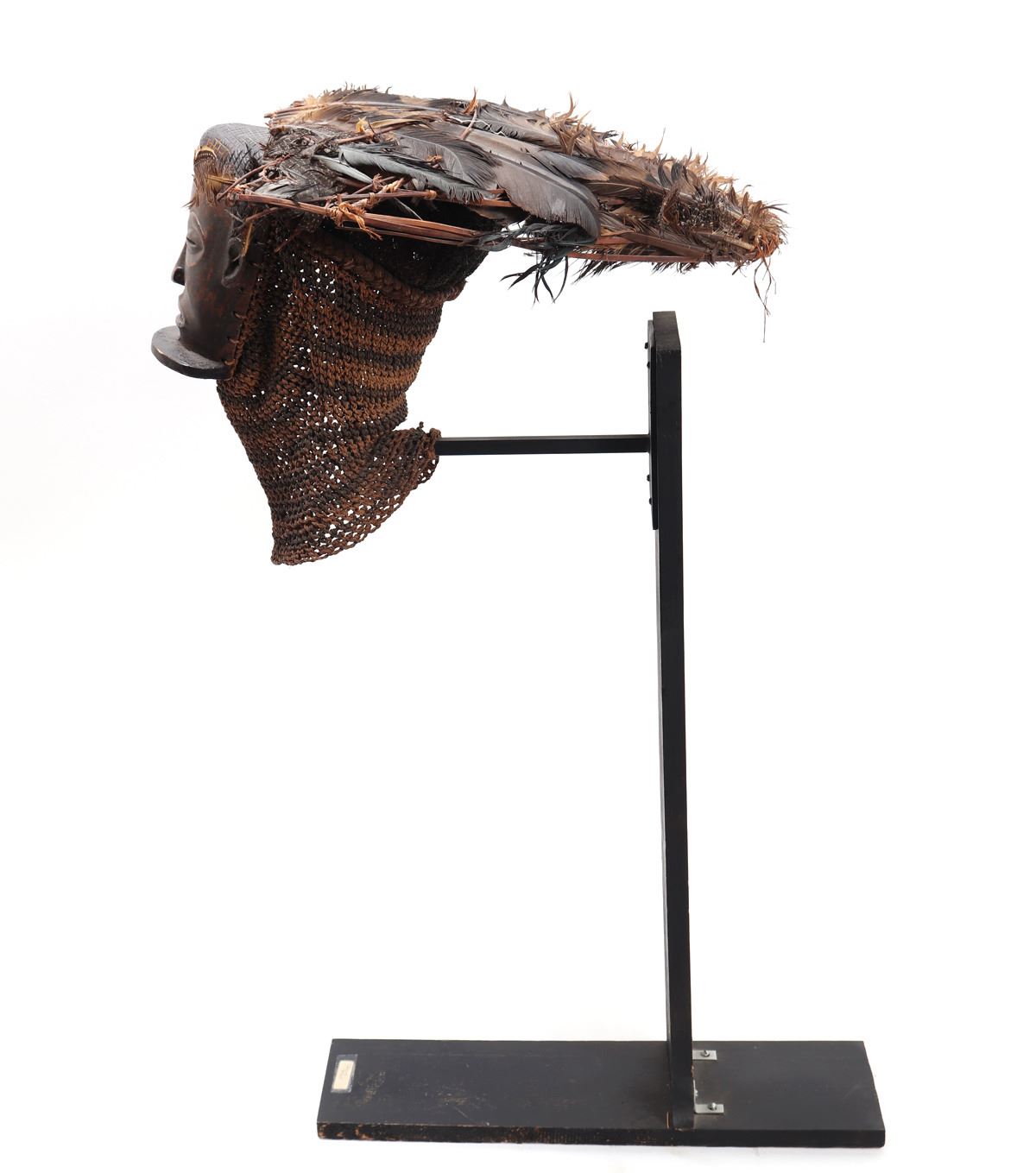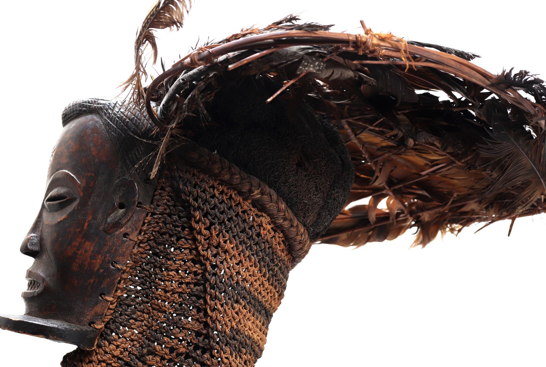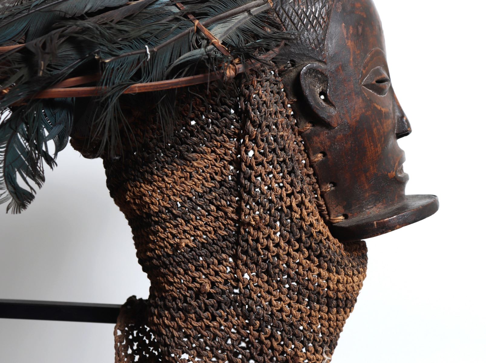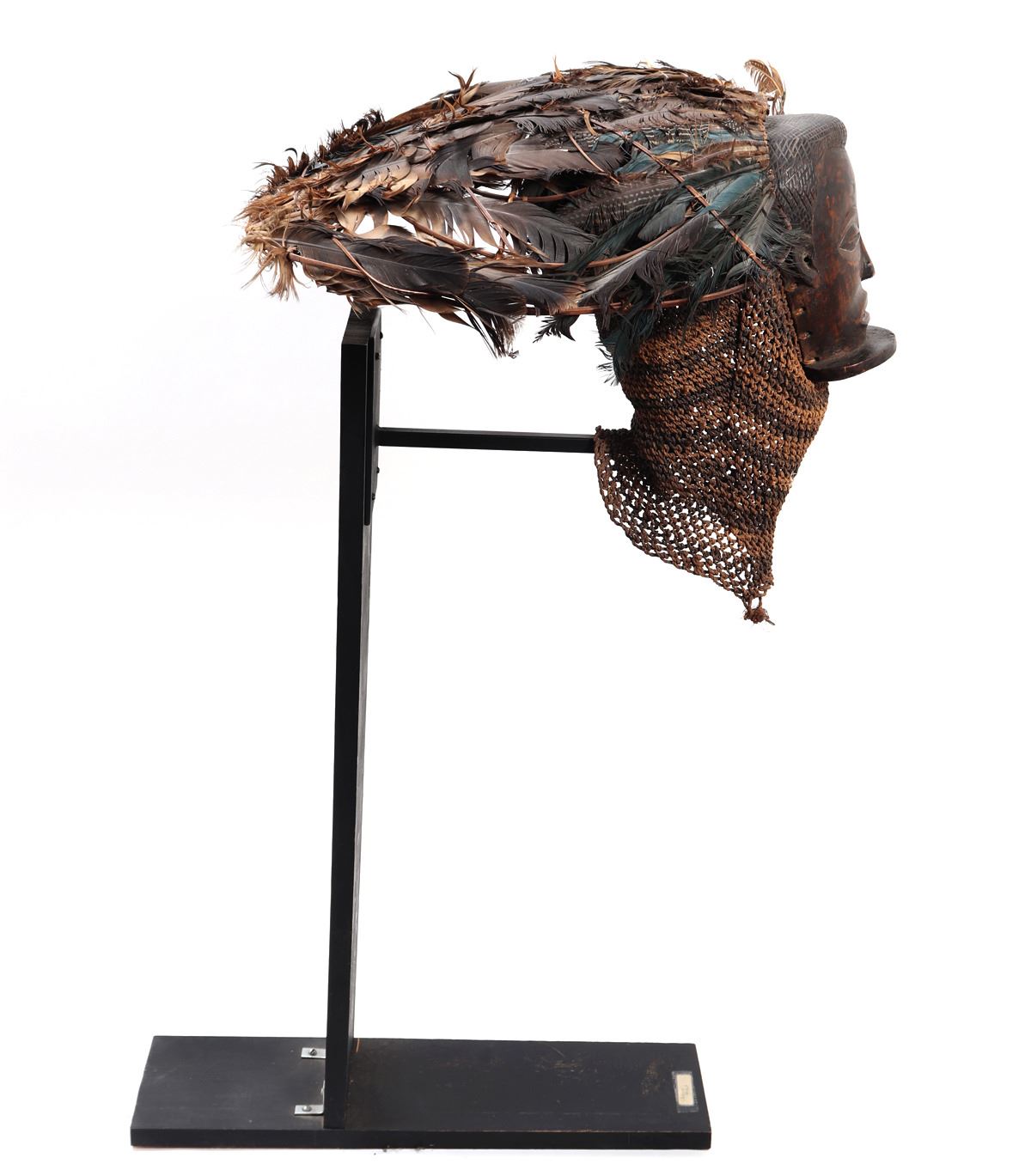 Chokwe Angola, wonderful wood carved helmet mask. Wooden face is accentuated by a skillful use of natural pigments, braided woven fiber under the chin, with a handsome feathered headdress. Such masks were typically used in rituals to honor ancestors and maintain social order. Size 15" H x 17 1/2" W, 36 1/2" H with stand. Condition: Wonderful natural patina throughout from age and use.. Provenance: ex-Galerie Jean-Jacques Duiko