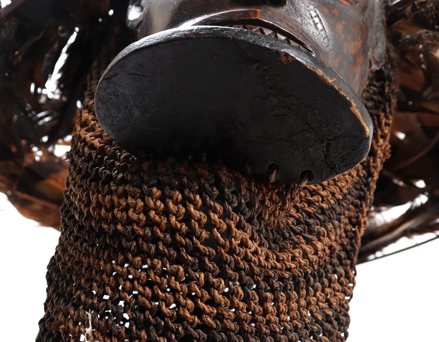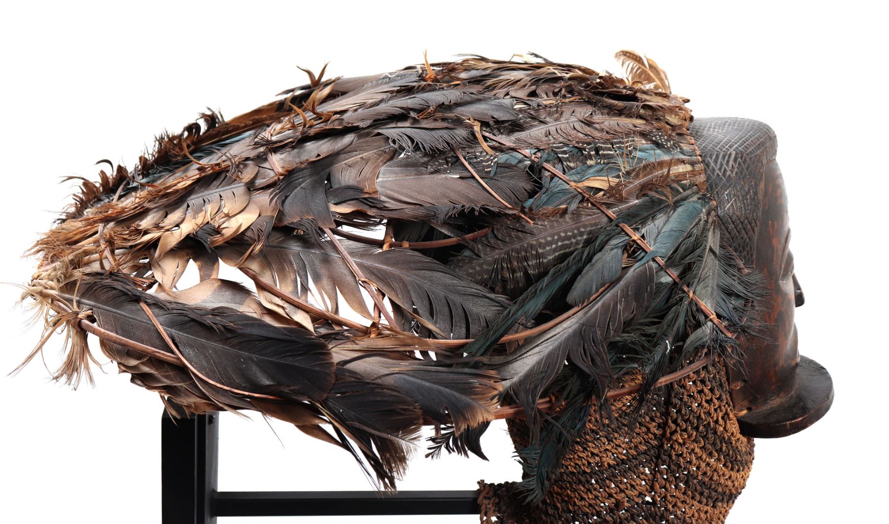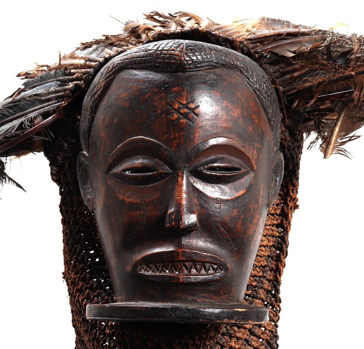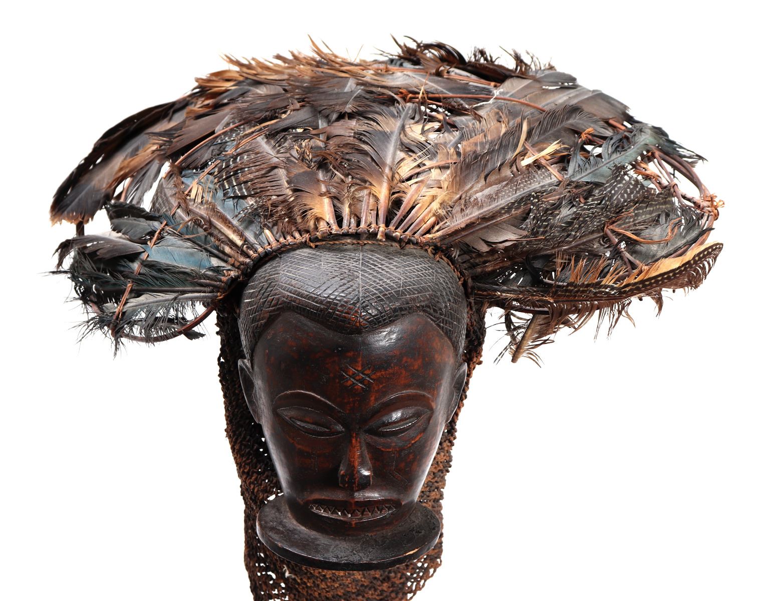 Chokwe Angola, wonderful wood carved helmet mask. Wooden face is accentuated by a skillful use of natural pigments, braided woven fiber under the chin, with a handsome feathered headdress. Such masks were typically used in rituals to honor ancestors and maintain social order. Size 15" H x 17 1/2" W, 36 1/2" H with stand. Condition: Wonderful natural patina throughout from age and use.. Provenance: ex-Galerie Jean-Jacques Duiko