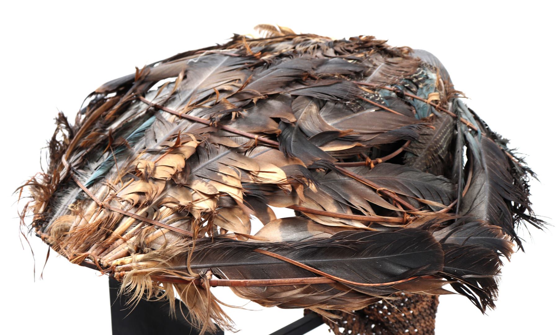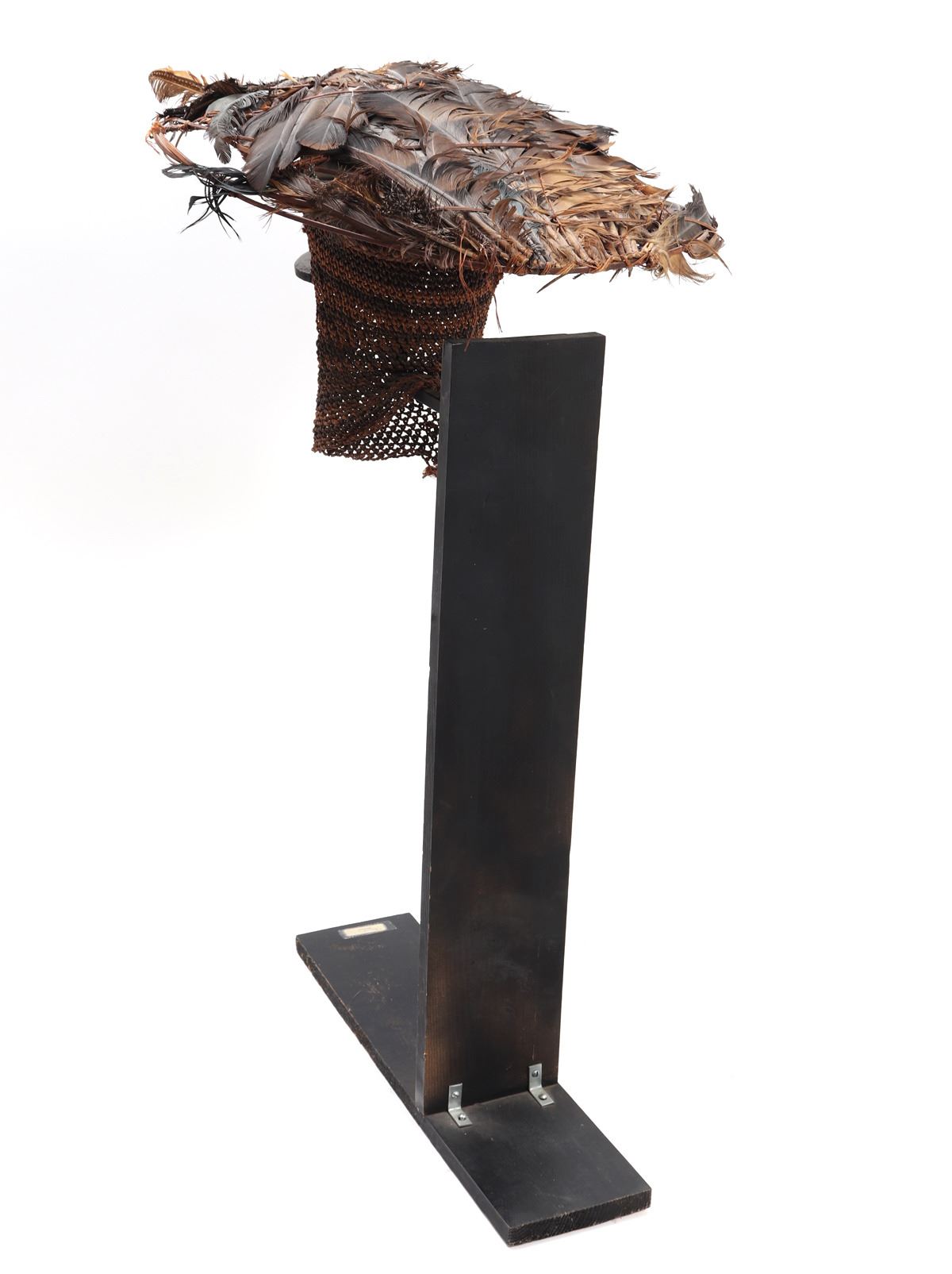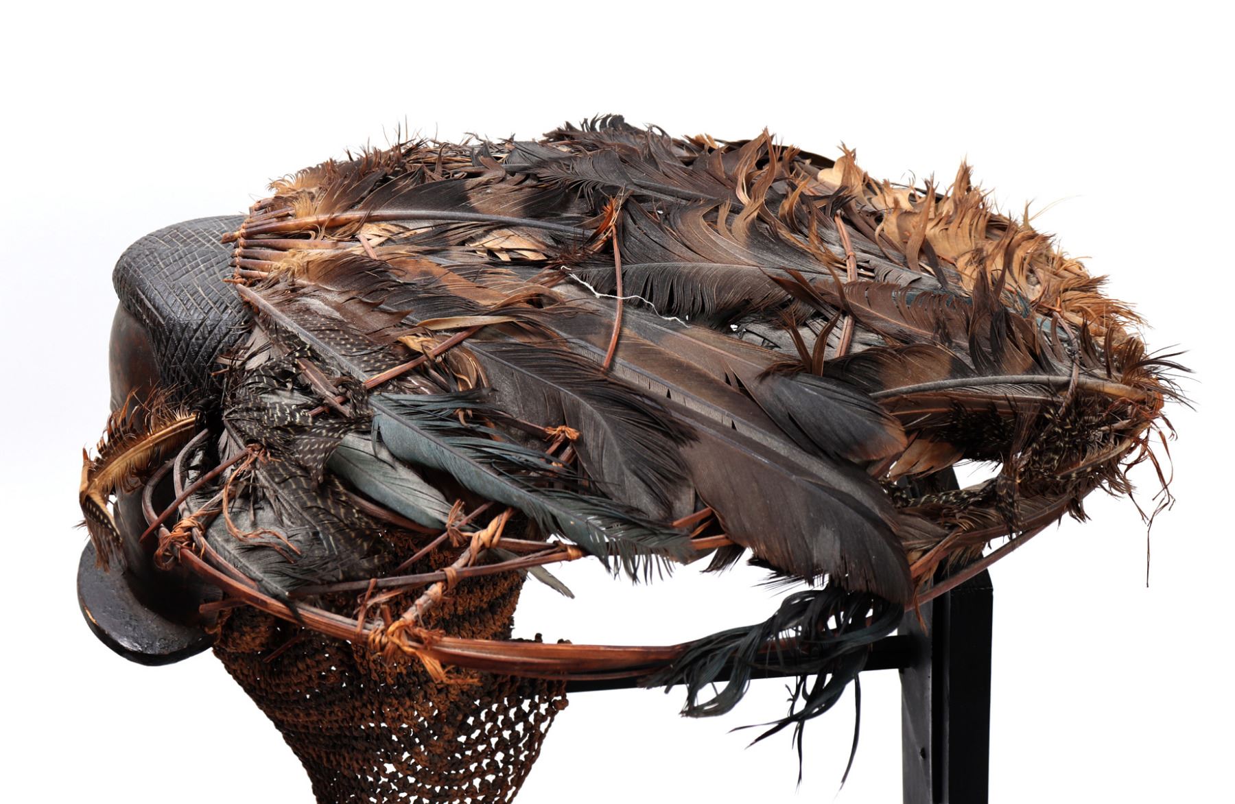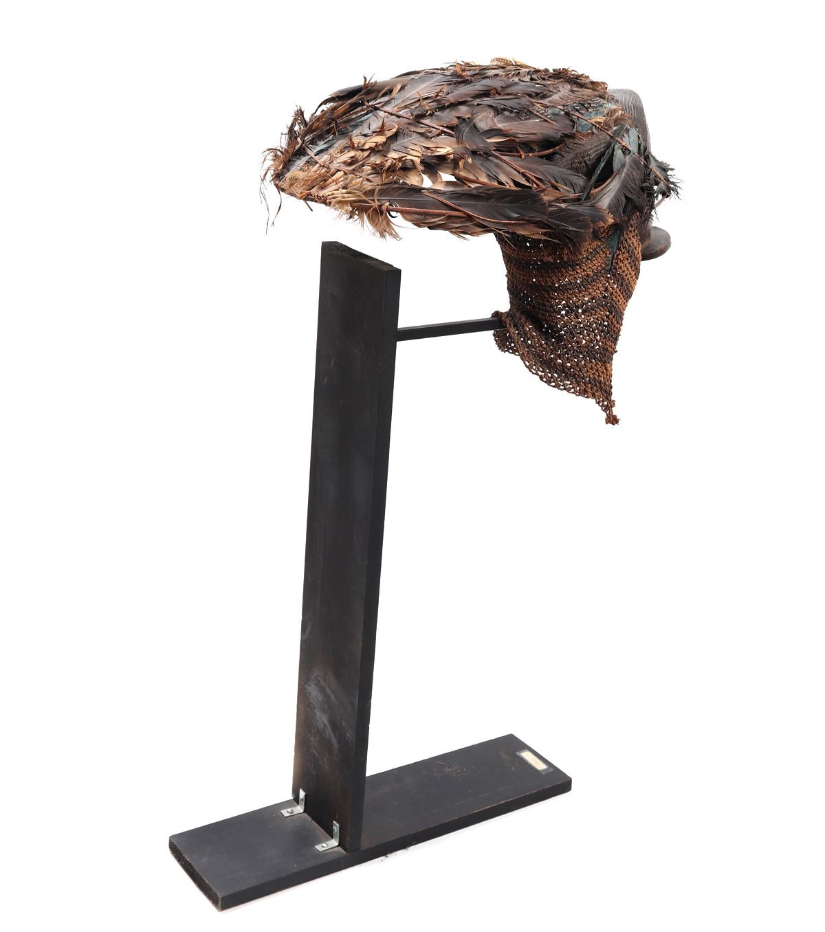 Chokwe Angola, wonderful wood carved helmet mask. Wooden face is accentuated by a skillful use of natural pigments, braided woven fiber under the chin, with a handsome feathered headdress. Such masks were typically used in rituals to honor ancestors and maintain social order. Size 15" H x 17 1/2" W, 36 1/2" H with stand. Condition: Wonderful natural patina throughout from age and use.. Provenance: ex-Galerie Jean-Jacques Duiko