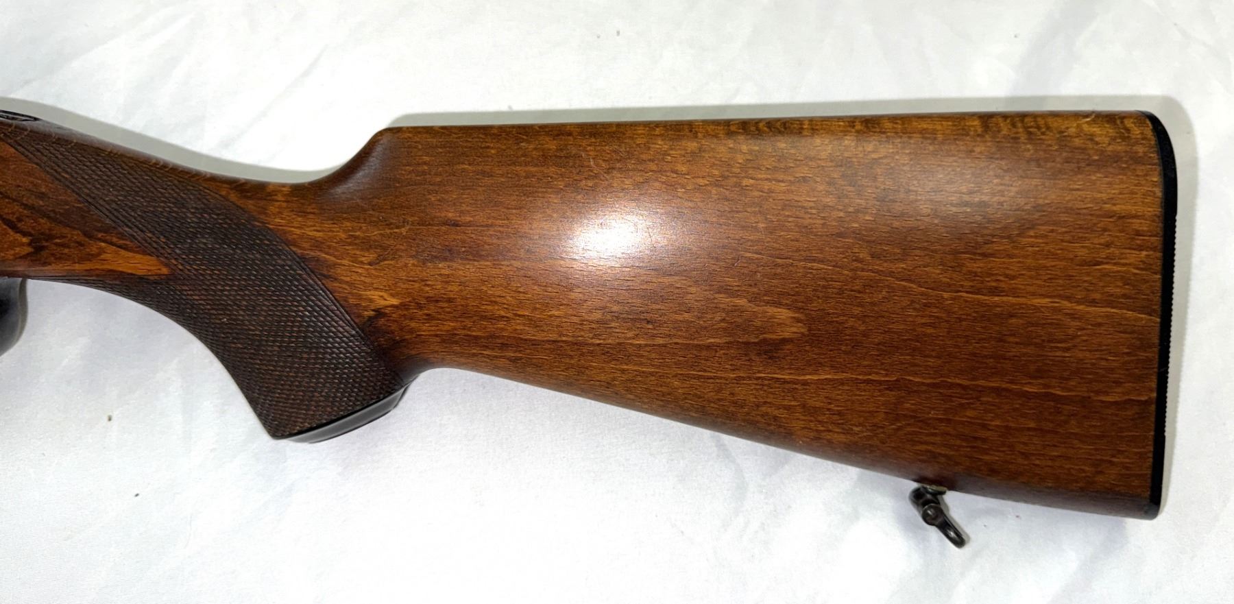 One piece nicely checkered wood stock, checkered pistol grip, original hard plastic