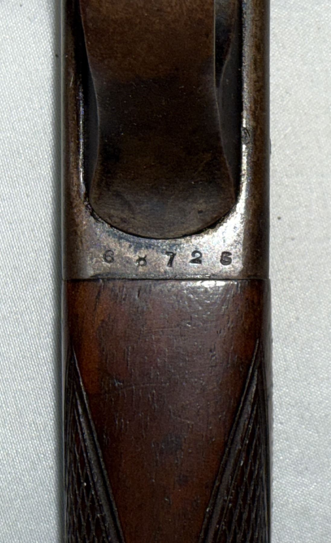 Rear Stock with checkered pistol grip. Steel buttplate. Silver ID plate.