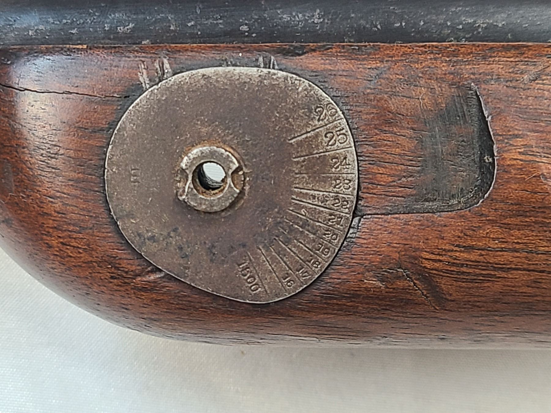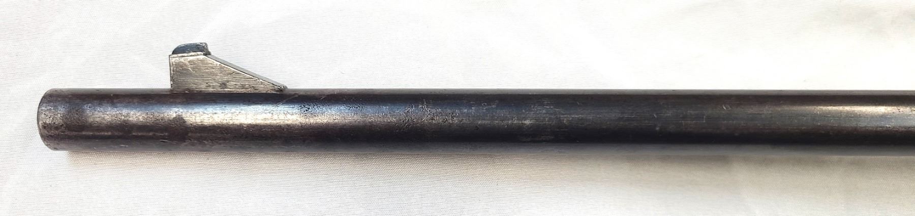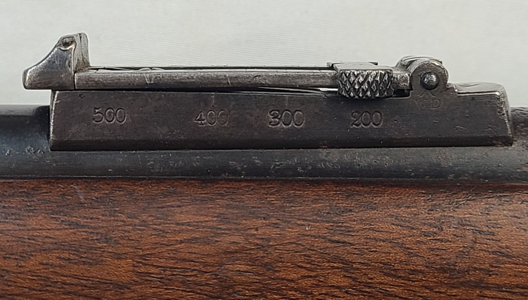 30-inch barrel with ramp fore sight, folding ladder rear sight, the receiver side wall