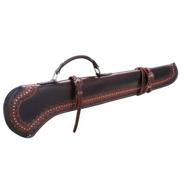 Showman ® 34" Barbed wire tooled gun scabbard with copper buckles. This gun scabbard features smooth dark leather accented with a barbed wire tooled border and copper studded trim and features a rolled leather handle for easy carry. Measures 34" long.