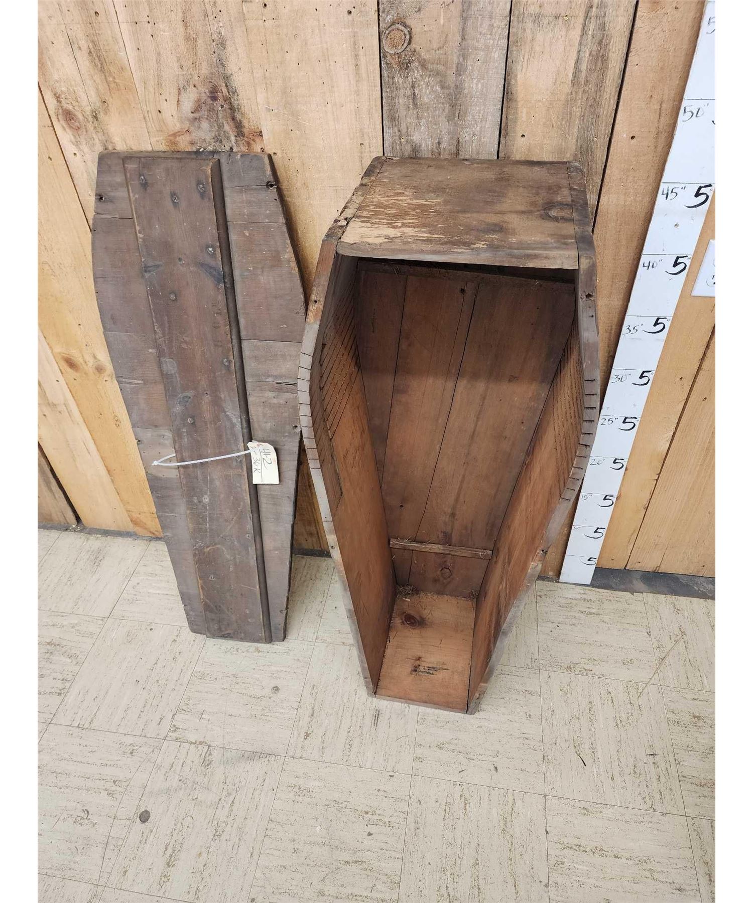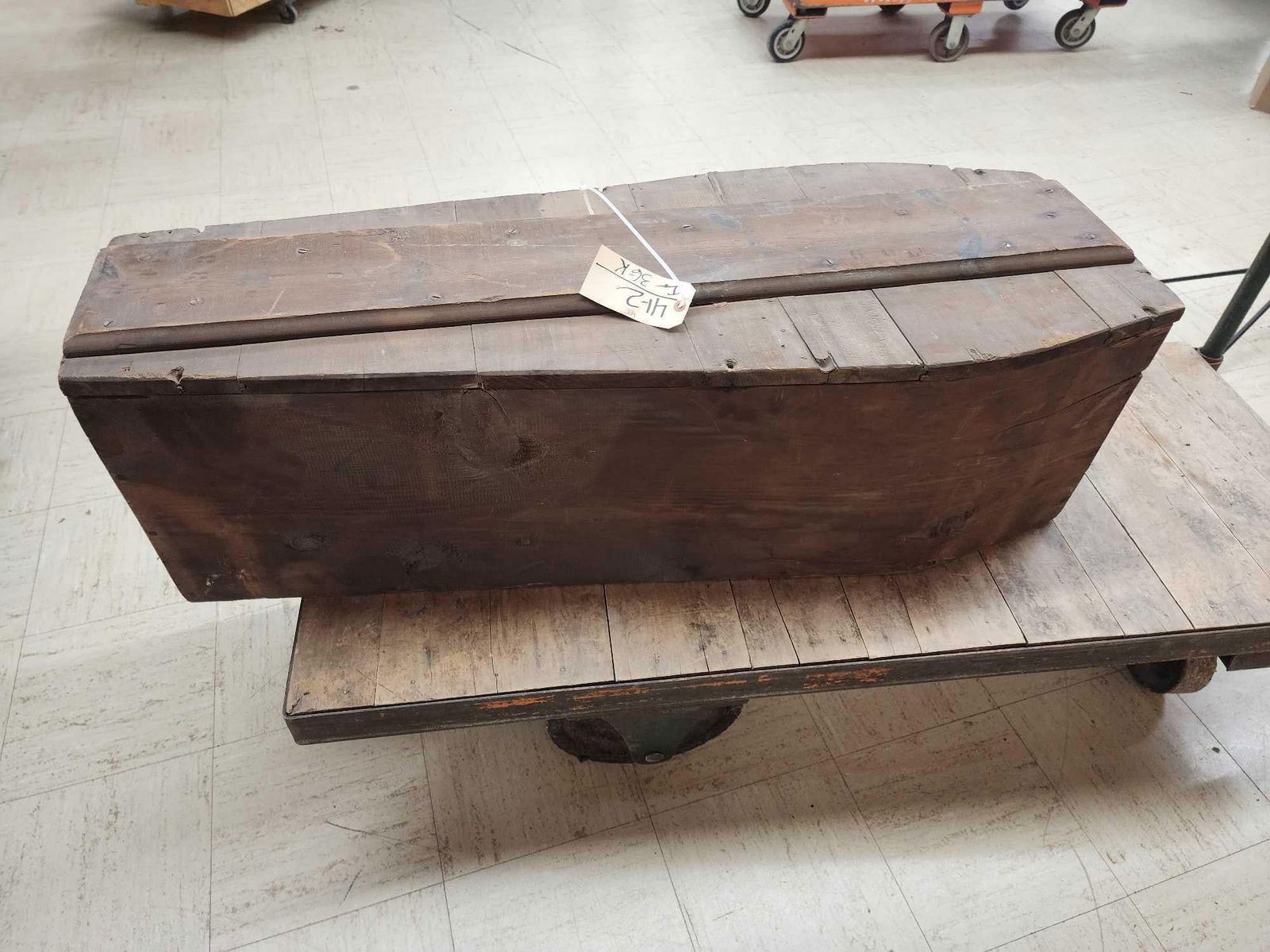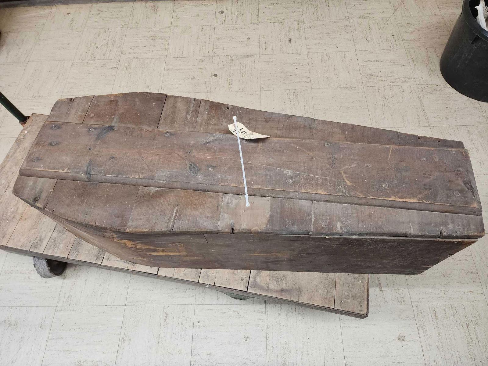 41.2 This appears to be made from reclaimed wood or possibly a transport / shipping Casket note the print on the lid either way it's a great antique Oddities Curiosity piece about 47" long x 11" on the narrow end 18" on the wide end x 15" deep