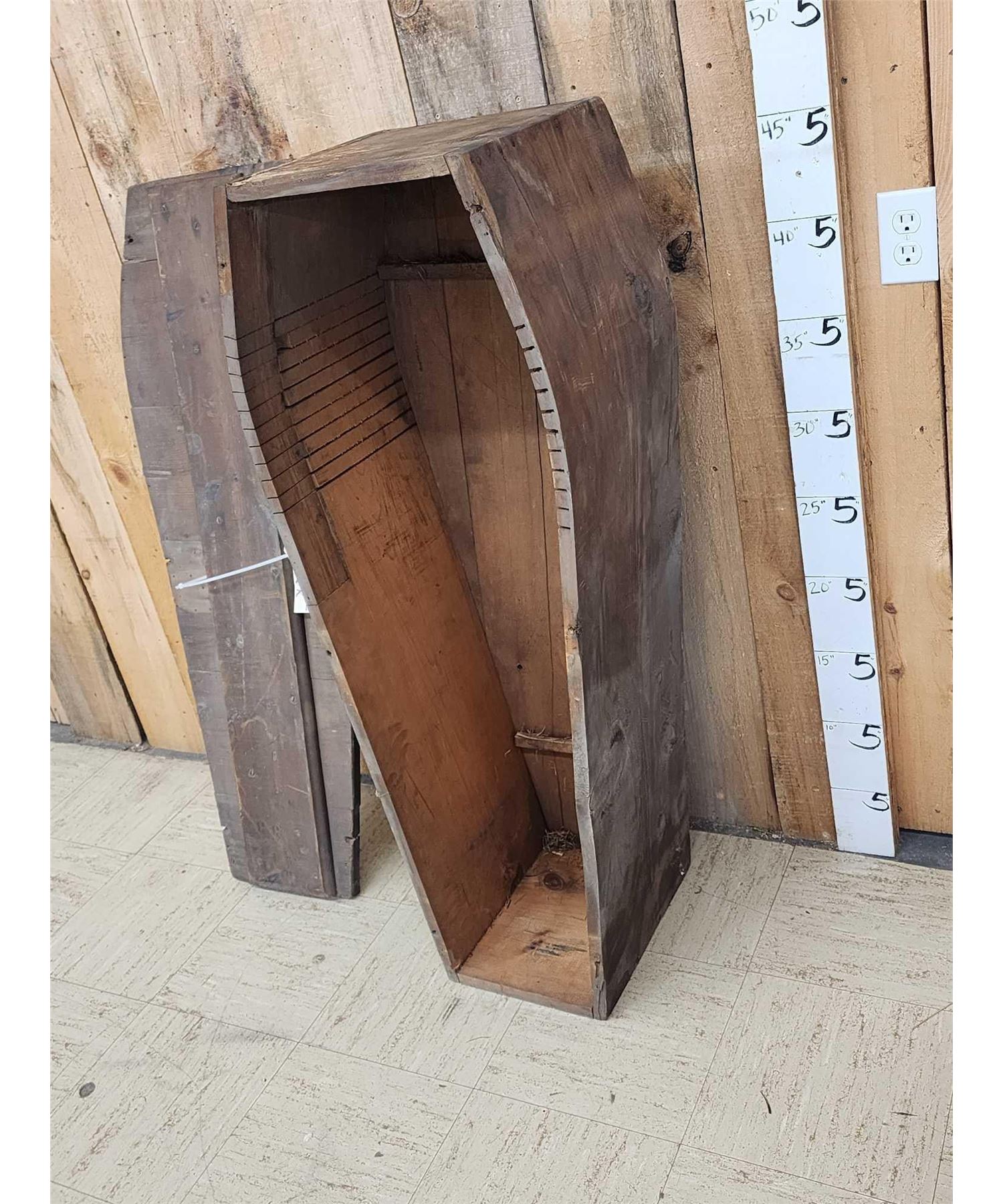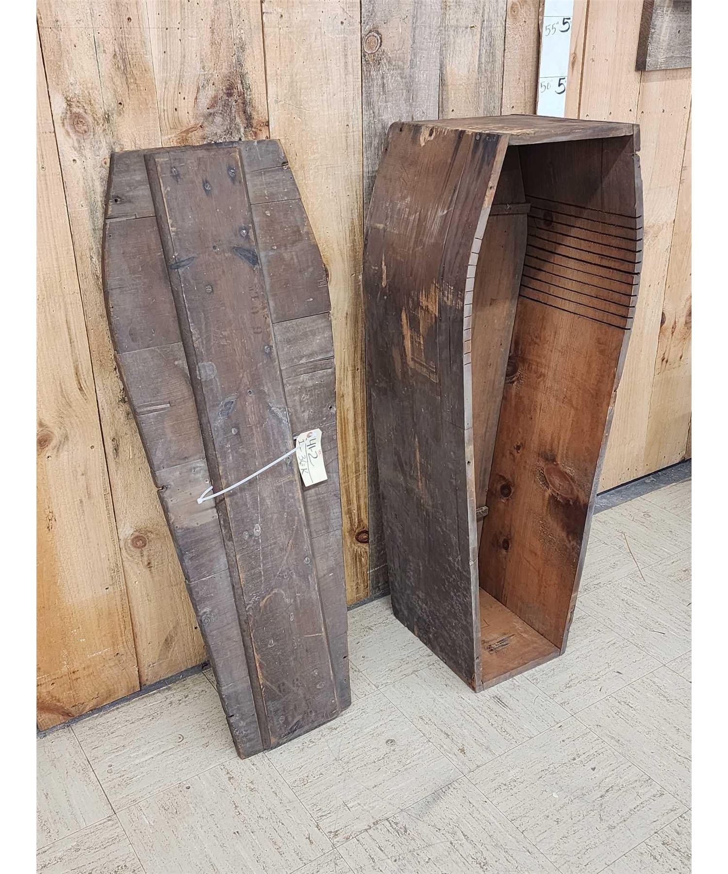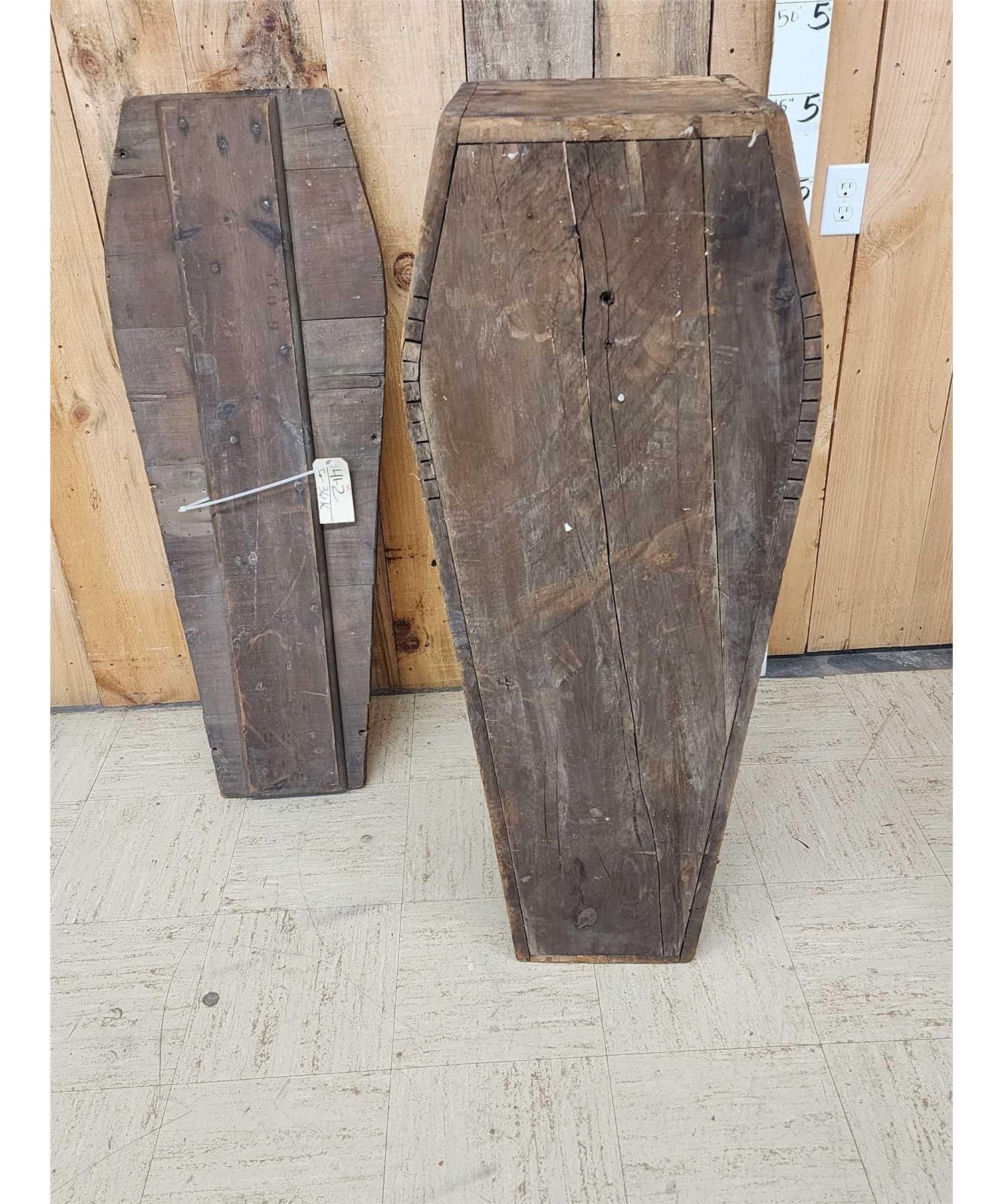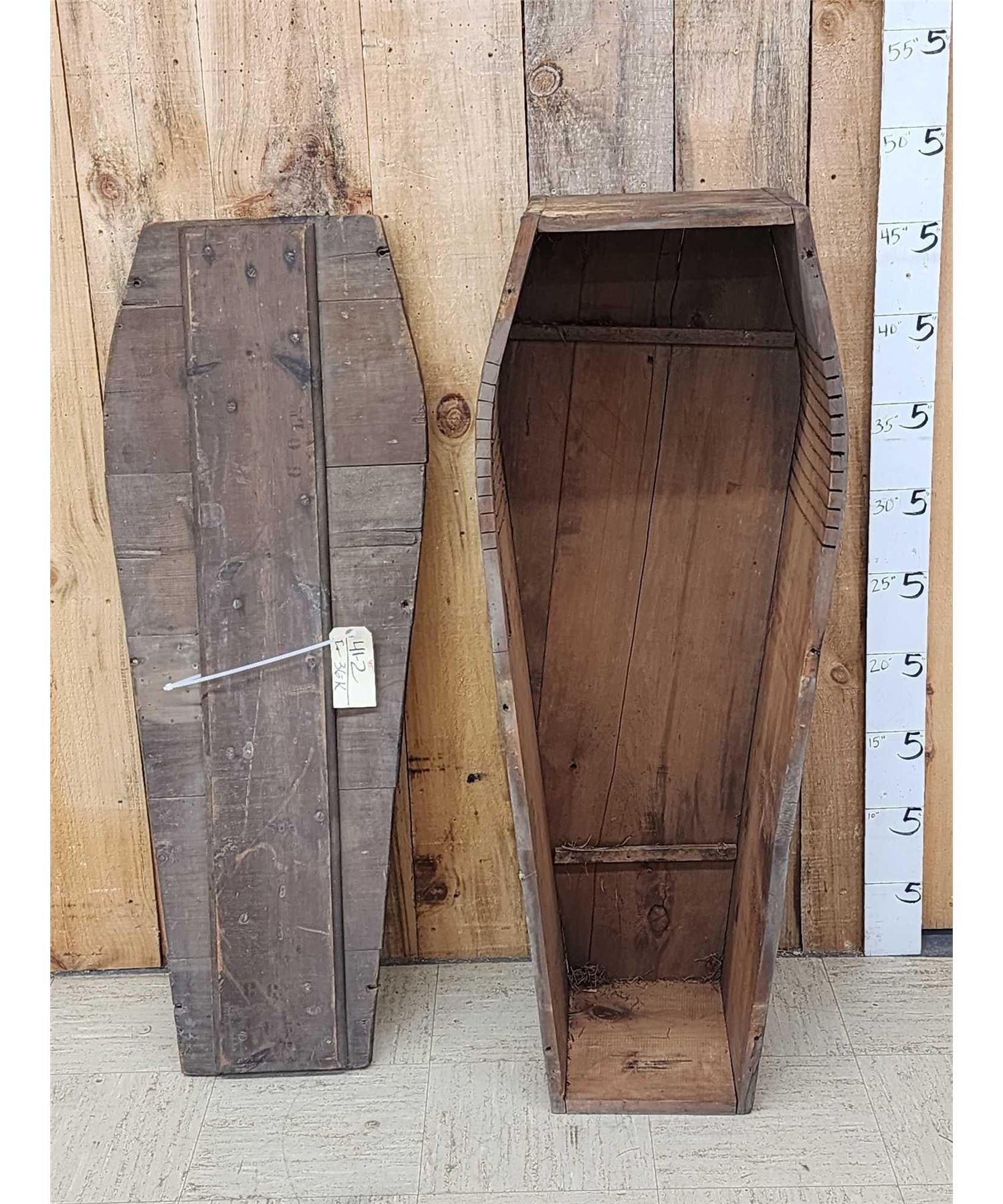 41.2 This appears to be made from reclaimed wood or possibly a transport / shipping Casket note the print on the lid either way it's a great antique Oddities Curiosity piece about 47" long x 11" on the narrow end 18" on the wide end x 15" deep