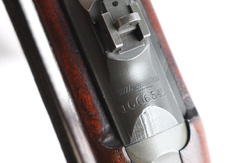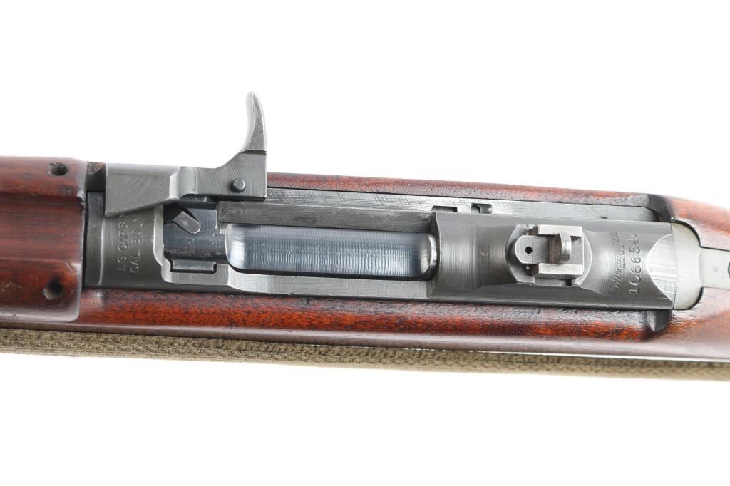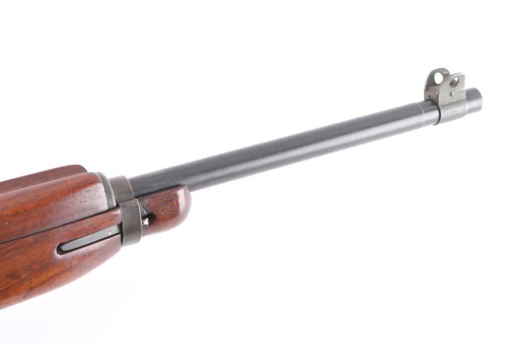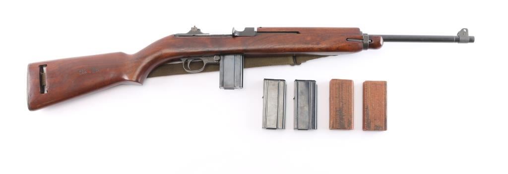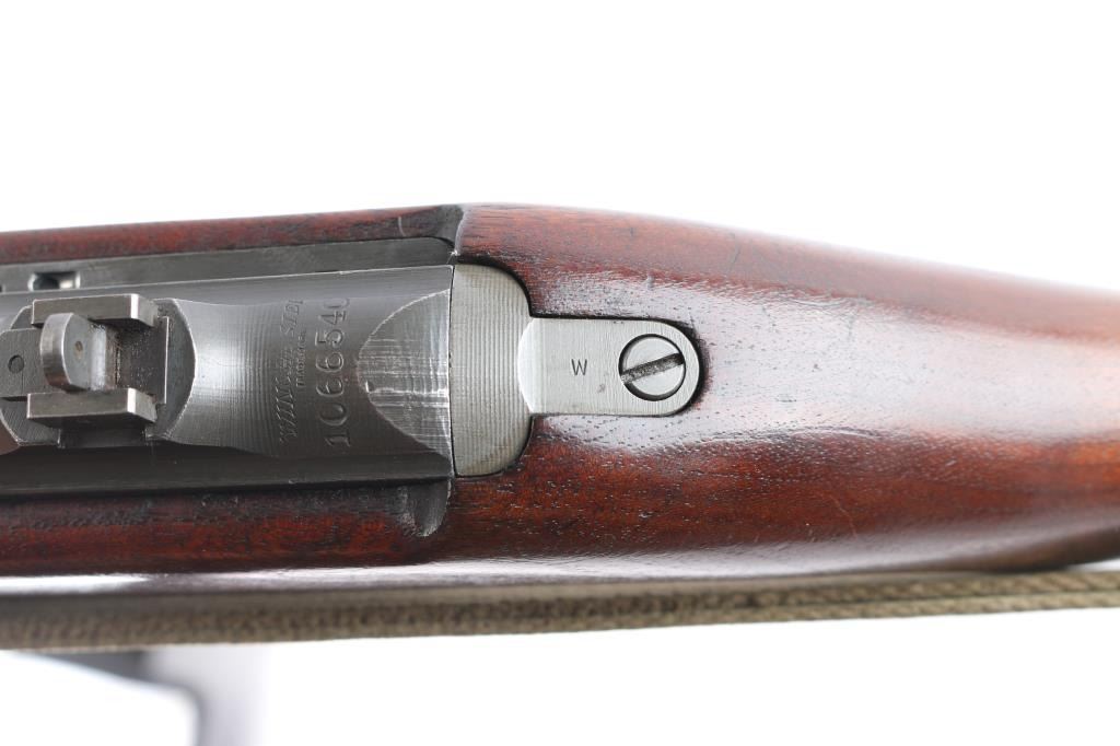 Parts correct, early production WWII era U.S. military contract semi-automatic service rifle chambered in .30 carbine. Manufactured in New Haven, CT circa 1943. This carbine was produced in Winchester's first production serial number block 1,000,000 - 1,349,999 and utilizes the type 1 detachable recoil spring tube with the catch in the receiver cut all the way through. Features a parkerized finish, 18" barrel stamped “W”, [Winchester proof], & [flaming bomb] near the gas pistol, shrouded blade front sight, flip-up "L" dual aperture rear sight stamped "S", thin barrel band, smooth push button safety, push button magazine release stamped “W”, 15 round magazine stamped "SW", smooth curved trigger, type 2 trigger housing stamped “W”, blued flat bolt stamped “W”, "W" stamped recoil shield, period green canvas sling, oiler stamped with IO"" inside a circle, two-rivet handguard with wide groove and smooth walnut pistol grip shoulder stock with high-wood forend, "I" cut oiler slot, knurled metal buttplate, "W.R.A./G.H.D." & crossed cannons cartouches. Many small parts also bear the “W” stamp including the slide, sear and hammer. Includes four additional 15 round magazine, one marked “IU” inside a circle, one marked “BW”, and two wrapped. Rifle retains approximately 85-90% of its original finish showing contact wear on the bolt & receiver, a couple light scratches and some scattered rust tones. The action is mechanically sound, the four land bore is excellent, the markings are sharp and the wood stocks are very good with blemishes & a couple minor losses.