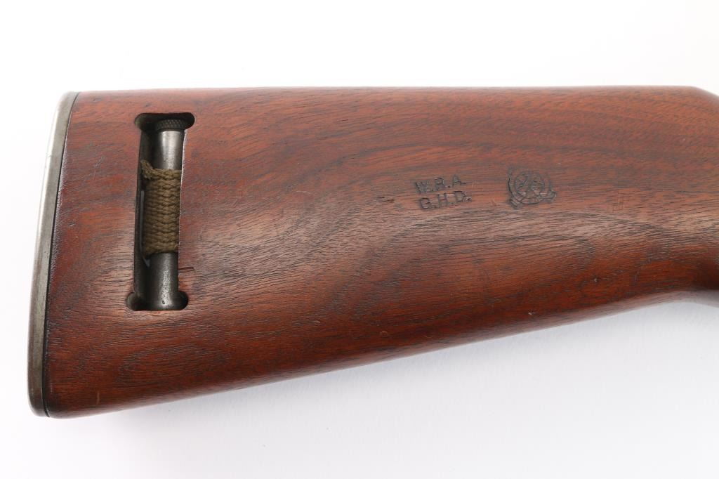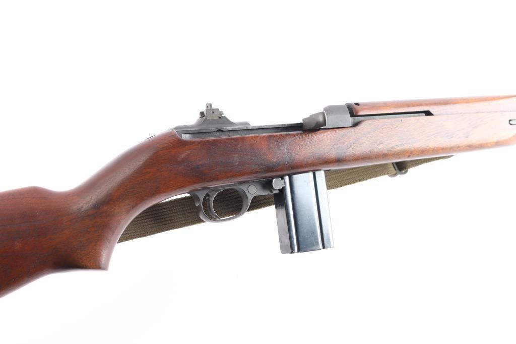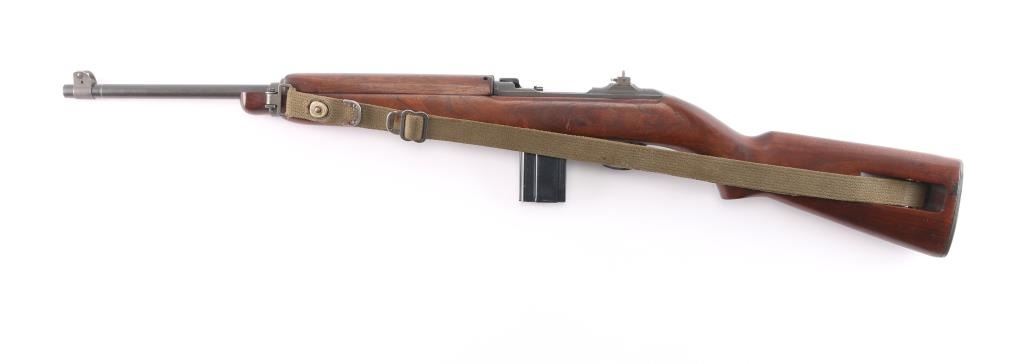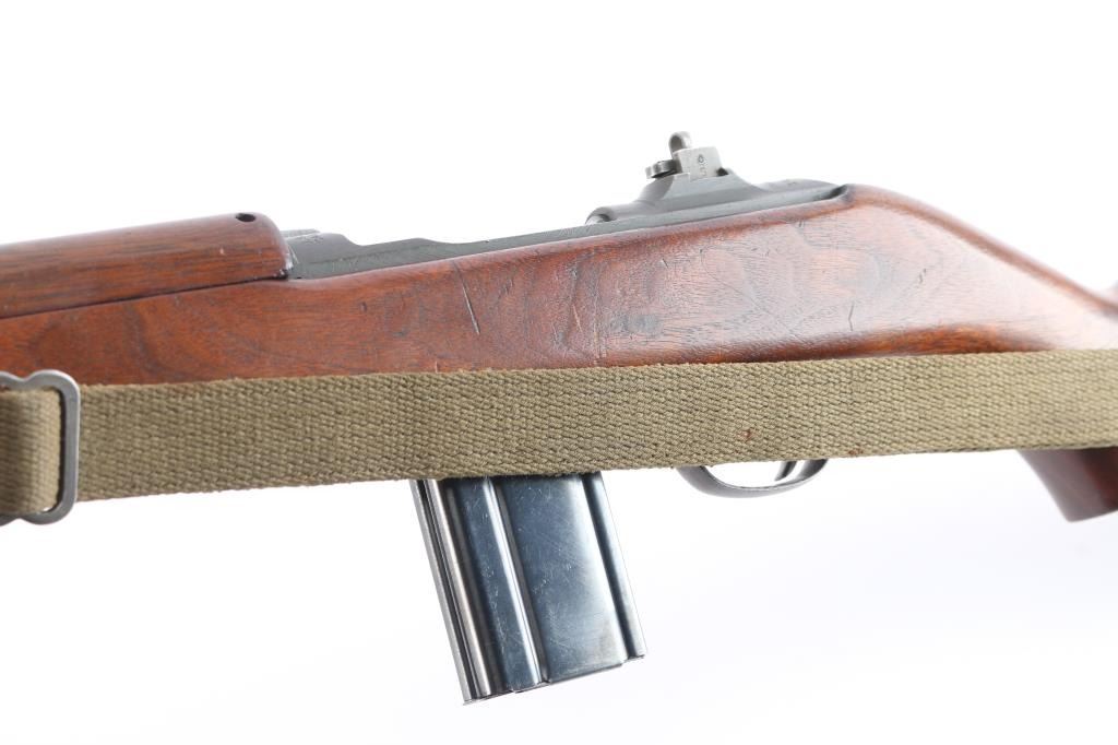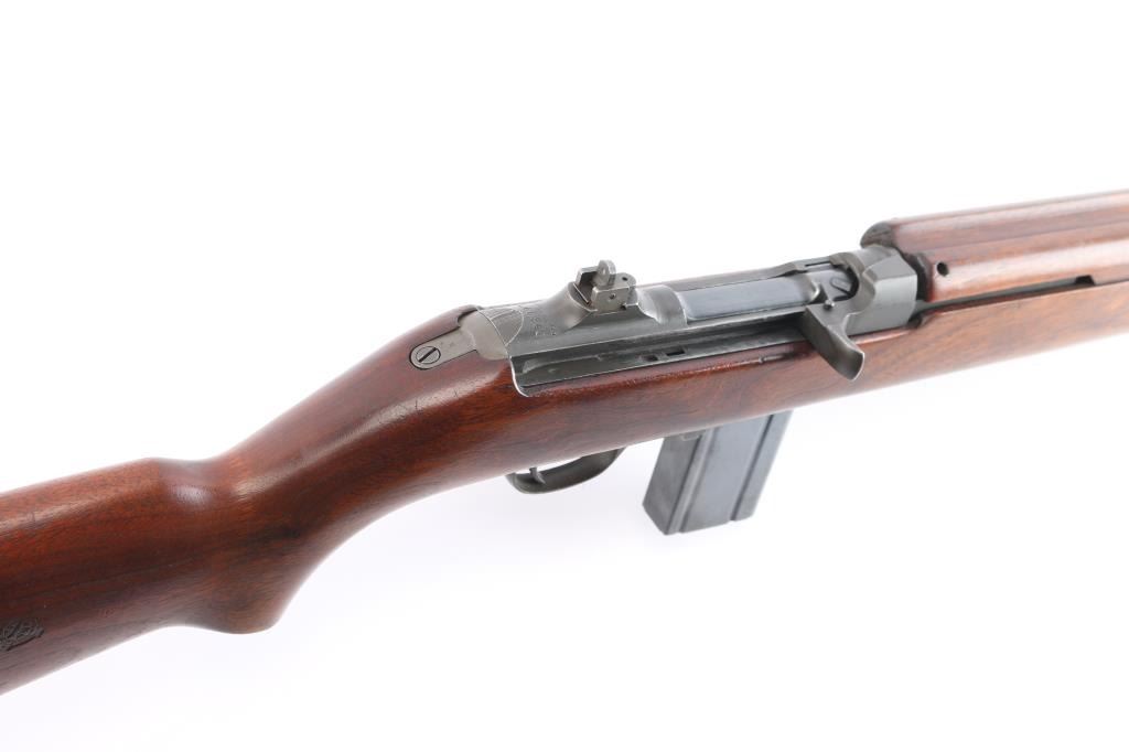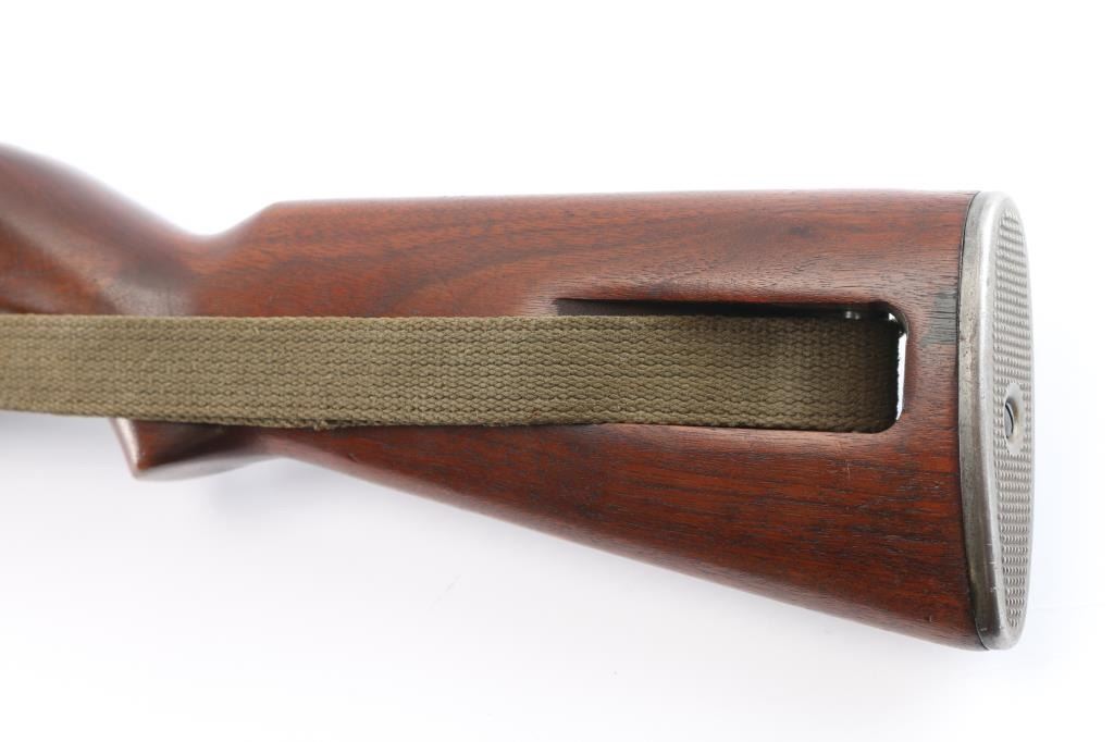 Parts correct, early production WWII era U.S. military contract semi-automatic service rifle chambered in .30 carbine. Manufactured in New Haven, CT circa 1943. This carbine was produced in Winchester's first production serial number block 1,000,000 - 1,349,999 and utilizes the type 1 detachable recoil spring tube with the catch in the receiver cut all the way through. Features a parkerized finish, 18" barrel stamped “W”, [Winchester proof], & [flaming bomb] near the gas pistol, shrouded blade front sight, flip-up "L" dual aperture rear sight stamped "S", thin barrel band, smooth push button safety, push button magazine release stamped “W”, 15 round magazine stamped "SW", smooth curved trigger, type 2 trigger housing stamped “W”, blued flat bolt stamped “W”, "W" stamped recoil shield, period green canvas sling, oiler stamped with IO"" inside a circle, two-rivet handguard with wide groove and smooth walnut pistol grip shoulder stock with high-wood forend, "I" cut oiler slot, knurled metal buttplate, "W.R.A./G.H.D." & crossed cannons cartouches. Many small parts also bear the “W” stamp including the slide, sear and hammer. Includes four additional 15 round magazine, one marked “IU” inside a circle, one marked “BW”, and two wrapped. Rifle retains approximately 85-90% of its original finish showing contact wear on the bolt & receiver, a couple light scratches and some scattered rust tones. The action is mechanically sound, the four land bore is excellent, the markings are sharp and the wood stocks are very good with blemishes & a couple minor losses.