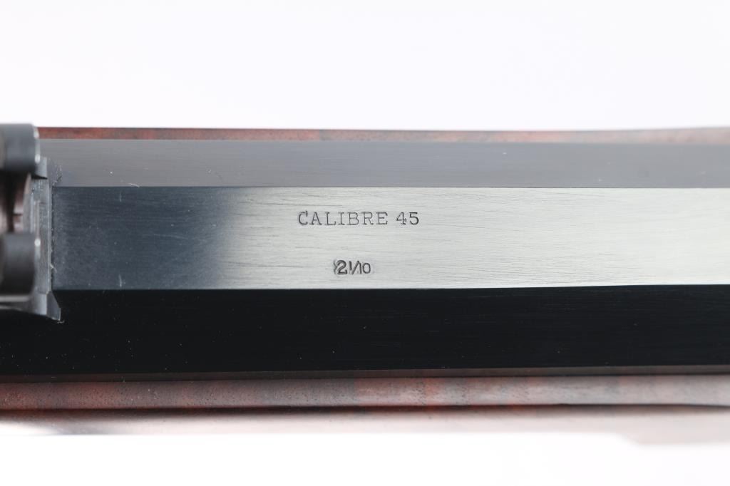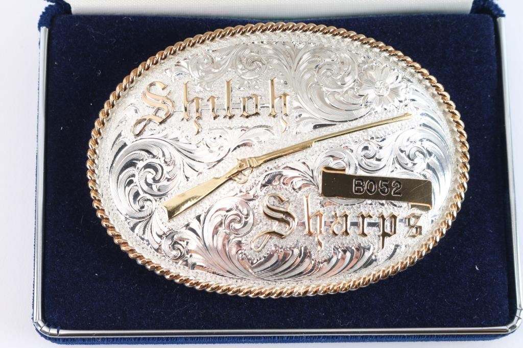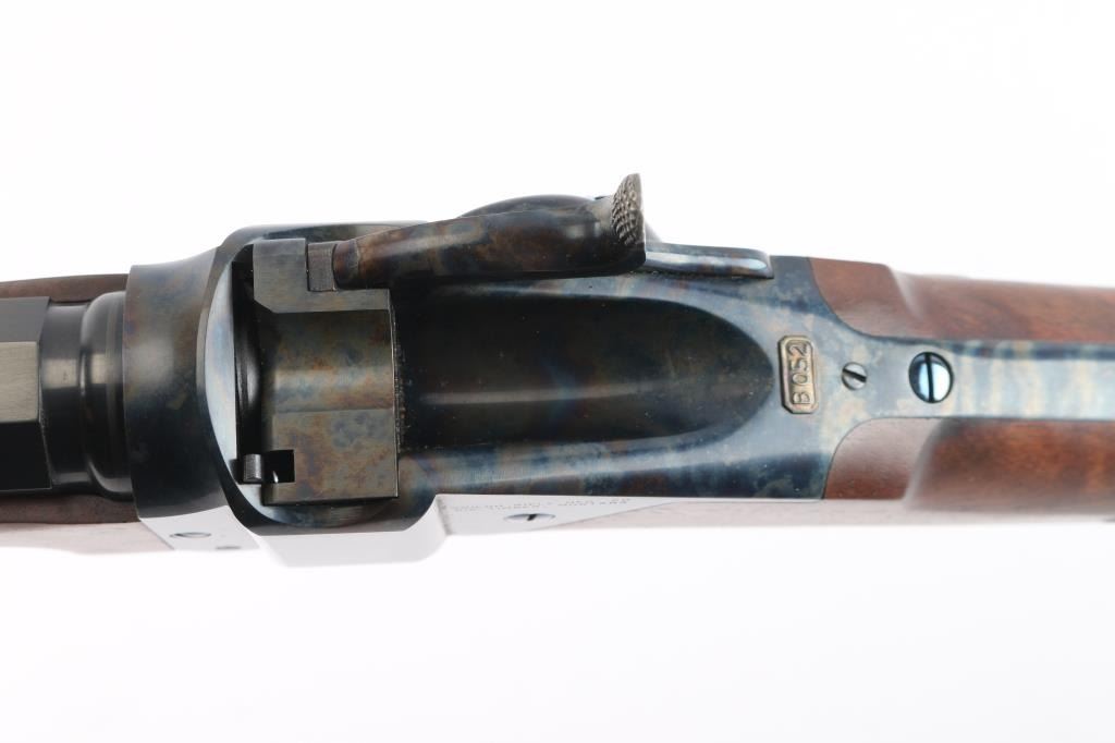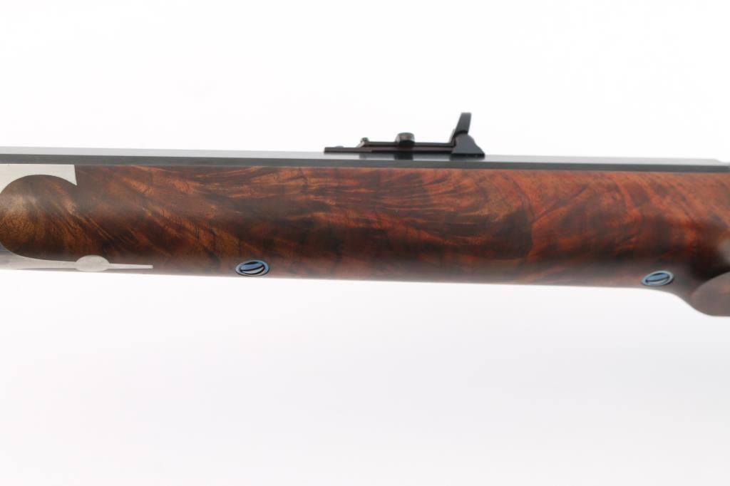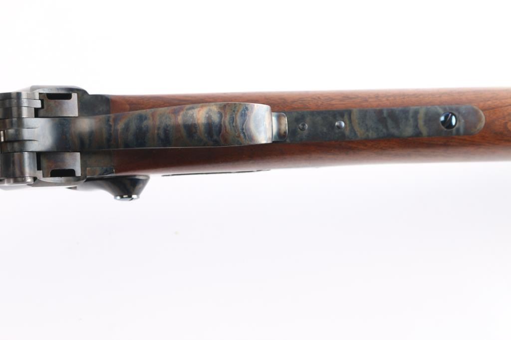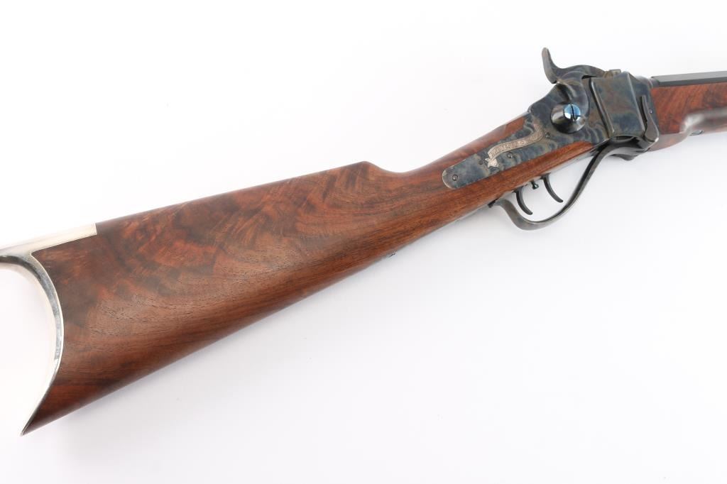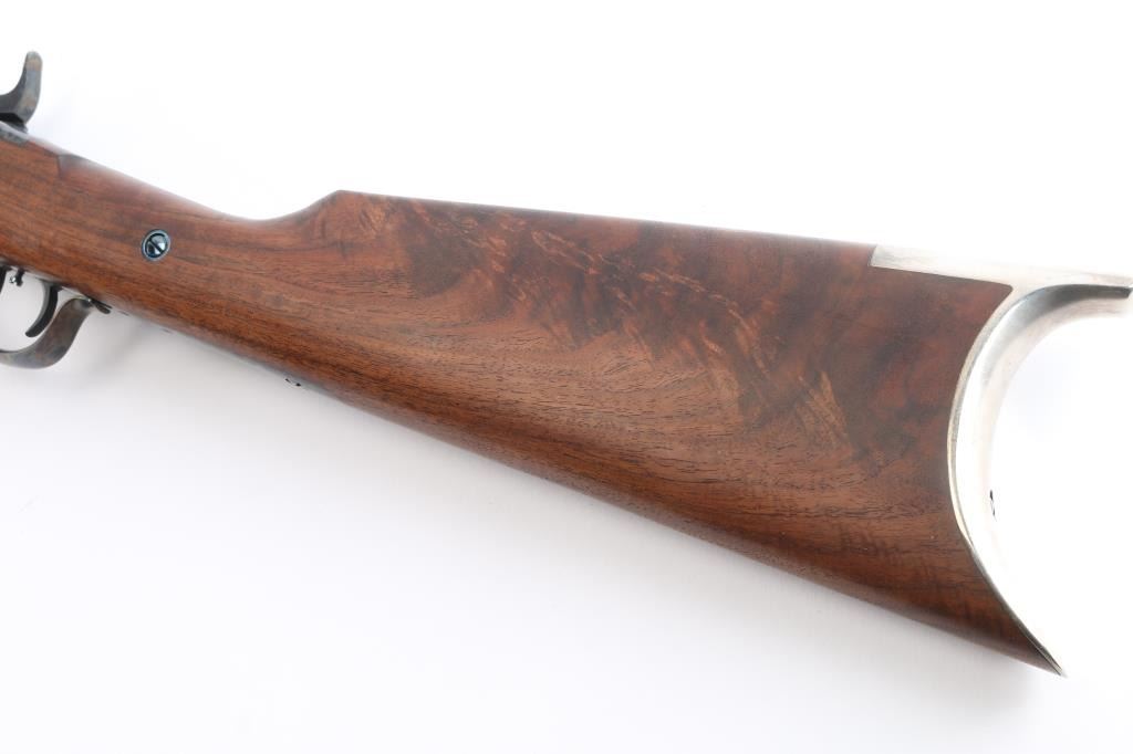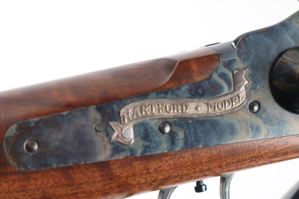 Features a polished blued 30" heavy octagon barrel with silver banded Hartford collar, dovetailed German silver blade front sight, buckhorn rear sight with flip-up ladder marked 2-8, case hardened receiver with hand engraved silver serial number plate & embossed banner that reads “HARTFORD MODEL”, fire blued screws, double set triggers, knurled hammer spur, smooth extra fancy American black walnut forend with “AA’ finish & pewter tip, and straight grip shoulder stock with silver plated crescent buttplate & 13 3/4" LOP. Includes a factory letter, the original build sheet, QC hang tag & receipt. Also includes an ornate silver plate belt buckle by Montana Silversmiths with matching serial number to the rifle. Rifle retains approximately 99% of its original finish showing minor handling marks and some small blemishes on the pewter forend tip. The action is mechanically sound, the bore is pristine and the figured walnut stocks are excellent.