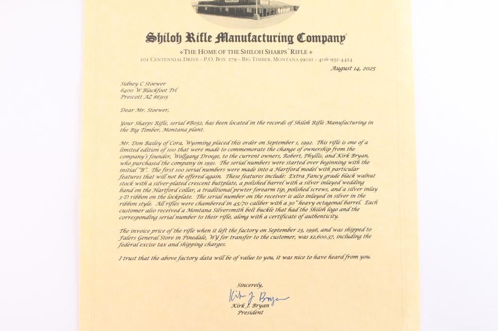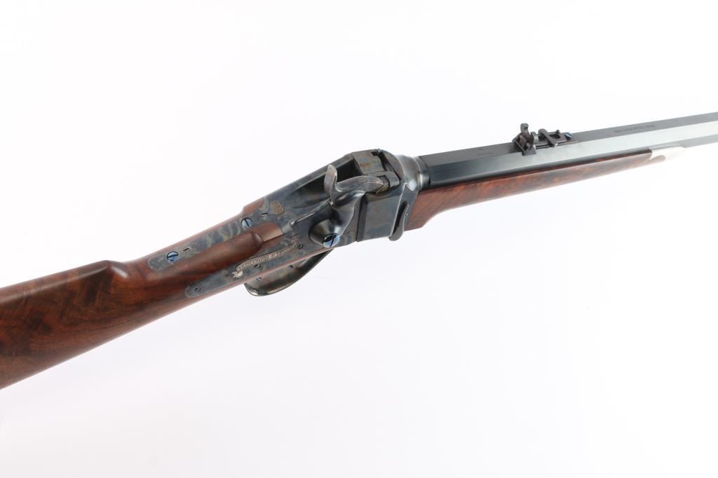.45-70 Gov't #B052 High quality & faithful reproduction of the Sharps Rifle Company Model 1874 falling block single shot sporting rifle chambered in .45 2 1/10". Manufactured in Big Timber, MT circa 1996 as part of a 1 of 100 special edition Commemorative Hartford.