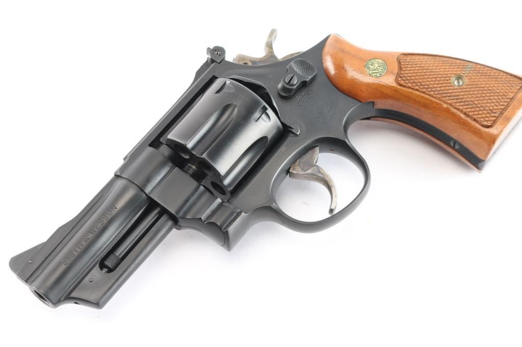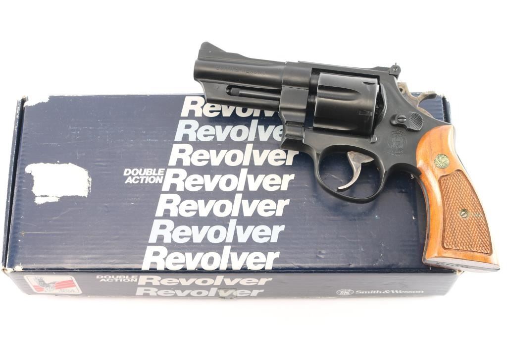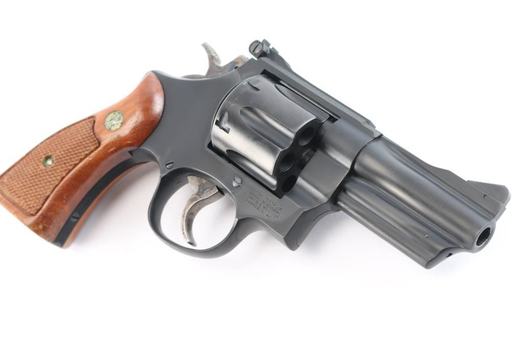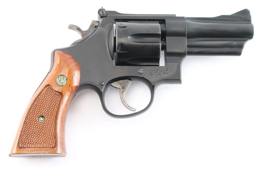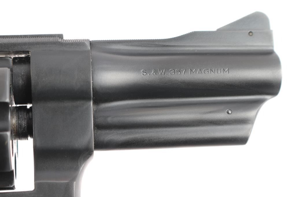 Large frame double action revolver features 3-1/2" barrel, adjustable sights with serrated sighting rib, blued finish, square butt "N" frame, magna style checkered wood grips with S&W medallions, case color smooth trigger and knurled spur hammer. No frame lock. Like new condition with few blemishes. Includes factory blue cardboard box with manual and cleaning rod.