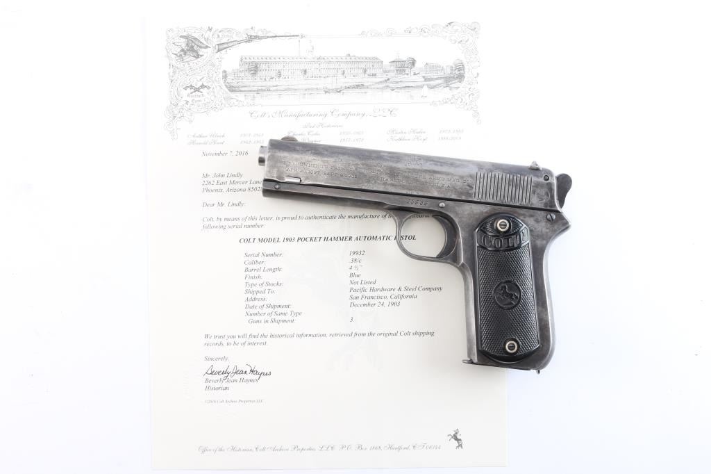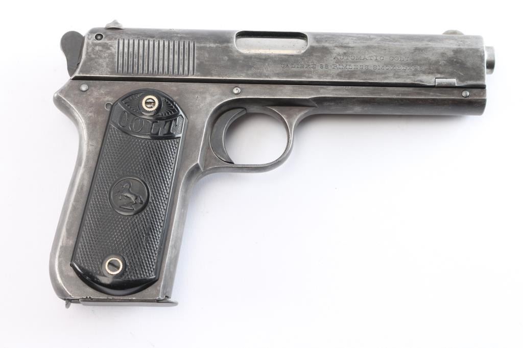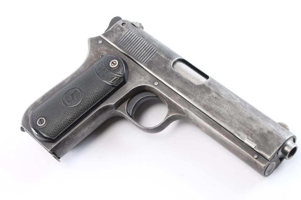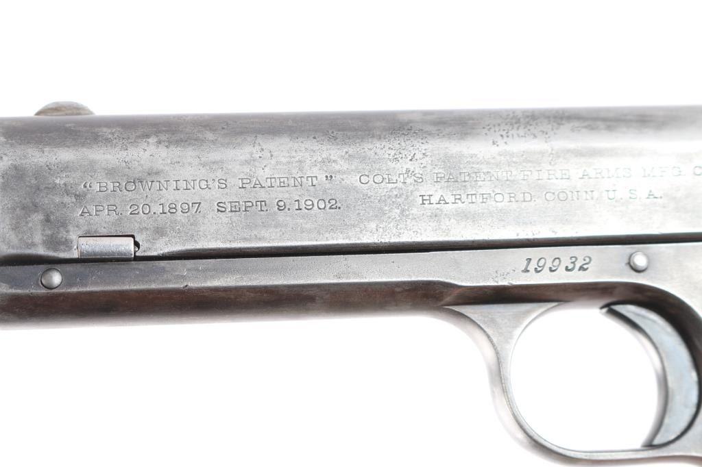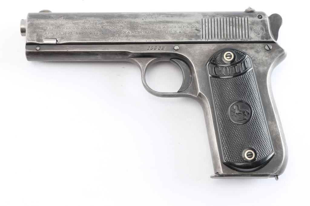 Vintage American made semi-automatic pistol, manufactured circa 1903, first year of production, A total of approximately 29,237 were produced. (1903-1927) Designed by John Browning, blued finish, no manual safety, no grip safety, 4 1/2" barrel, bore is very good/bright, blade front sight, open notch rear sight, checked low-profile hammer, smooth trigger, black hard rubber grips with "Colt" and "Rampant Colt" logo, metal 7-round single stack magazine, approximately 10% of original blue remains with the rest turned a gray/dull blue patina. There is a patch of very light pitting on top of the slide. The grips are very good, no chips, action is smooth. Colt marking are crisp/clear. It is a compact version of the Colt Model 1902 Sporting Model pistol derived from the original Colt M1900. The .38 ACP (aka .38 Auto) and the .38 Super use cases with identical dimensions, the only difference being the maximum operating pressures of each. It would be unwise to use new, factory .38 Super ammunition in any pistol based on the M1900 series Colts. (1900, 1902, 1903). Comes with a Colt factory letter confirming the above configuration. One of a 3 gun shipment to Pacific Hardware & Steel Co. San Francisco, Ca. on December 24, 1903.