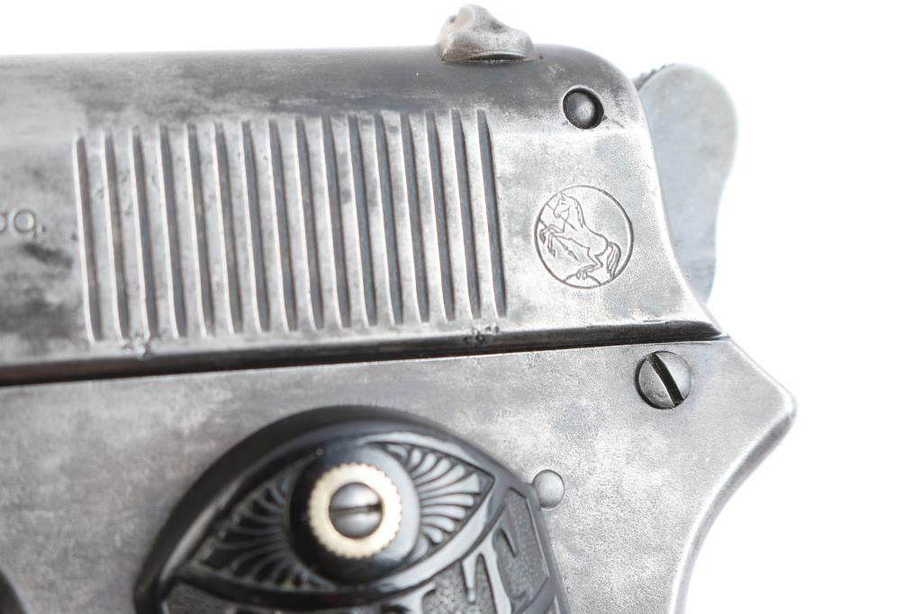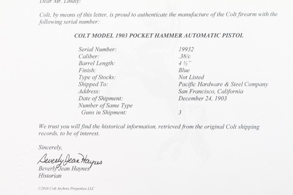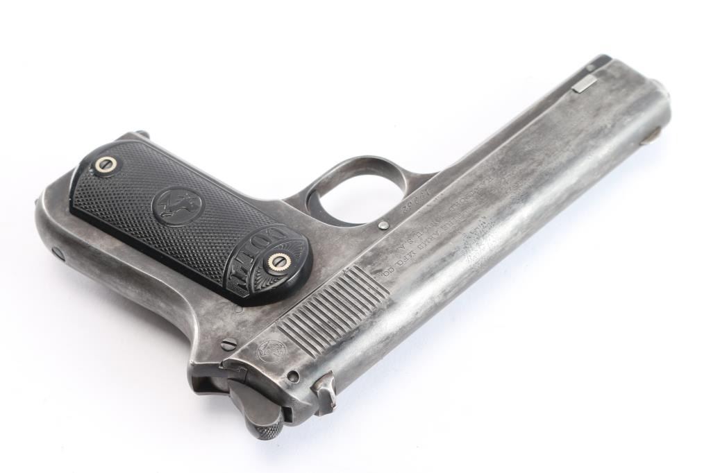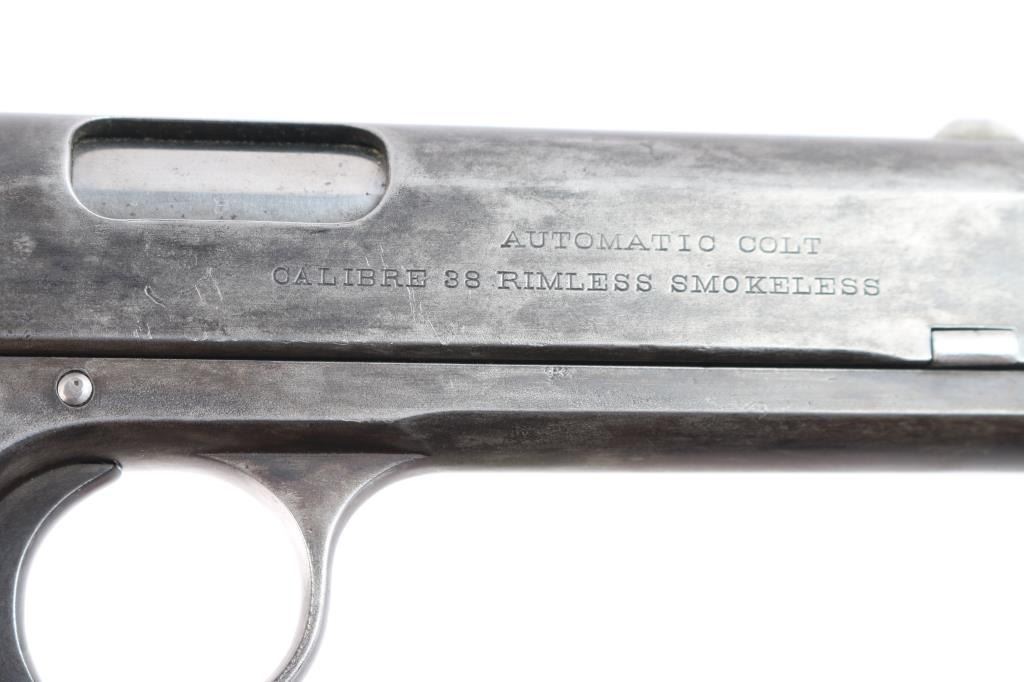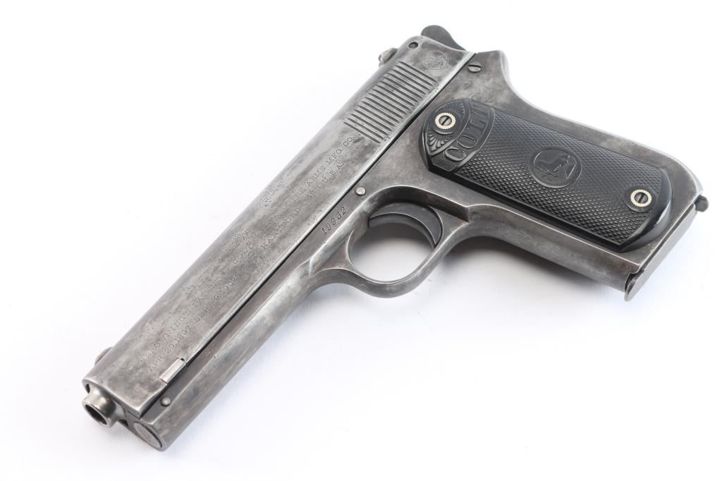 Vintage American made semi-automatic pistol, manufactured circa 1903, first year of production, A total of approximately 29,237 were produced. (1903-1927) Designed by John Browning, blued finish, no manual safety, no grip safety, 4 1/2" barrel, bore is very good/bright, blade front sight, open notch rear sight, checked low-profile hammer, smooth trigger, black hard rubber grips with "Colt" and "Rampant Colt" logo, metal 7-round single stack magazine, approximately 10% of original blue remains with the rest turned a gray/dull blue patina. There is a patch of very light pitting on top of the slide. The grips are very good, no chips, action is smooth. Colt marking are crisp/clear. It is a compact version of the Colt Model 1902 Sporting Model pistol derived from the original Colt M1900. The .38 ACP (aka .38 Auto) and the .38 Super use cases with identical dimensions, the only difference being the maximum operating pressures of each. It would be unwise to use new, factory .38 Super ammunition in any pistol based on the M1900 series Colts. (1900, 1902, 1903). Comes with a Colt factory letter confirming the above configuration. One of a 3 gun shipment to Pacific Hardware & Steel Co. San Francisco, Ca. on December 24, 1903.