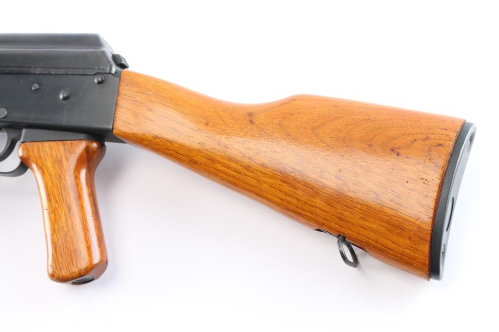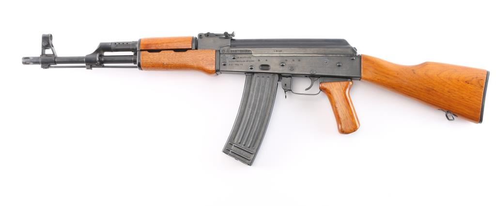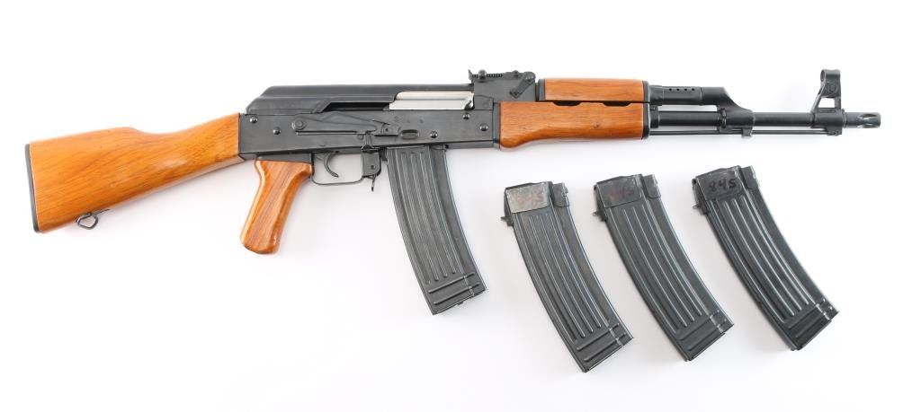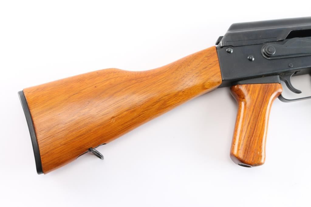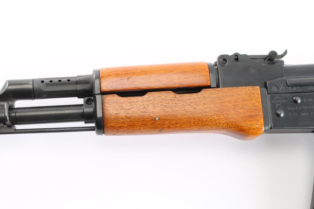 ‘Pre-ban’ Desirable semi-automatic AK pattern rifle chambered in 5.56mm. Manufactured in China at state factory 66 and imported by CSI of Dallas, TX with import marks on the left side of the receiver. Features a blued finish, 16.25" threaded barrel with attached flash hider, hooded adjustable post front sight, tangent rear sight graduated to 800 meters, bayonet lug, cleaning rod, smooth curved trigger, manual safety/dust cover, 30 round magazine, stamped steel receiver and four-piece smooth light wood stock set with cleaning kit in the buttstock. Includes three additional 30 round magazines. Matching serial numbers found on the receiver, top cove, bolt, bolt carrier and recoil spring guide. Rifle retains approximately 95% of its original finish showing scatted scratches & minor dings. The action is mechanically sound, the chrome lined bore is excellent and the wood stocks are very good with blemishes. ‘Pre-ban’ Desirable semi-automatic AK pattern rifle chambered in 5.56mm. Manufactured in China at state factory 66 and imported by CSI of Dallas, TX with import marks on the left side of the receiver. Features a blued finish, 16.25" threaded barrel with attached flash hider, hooded adjustable post front sight, tangent rear sight graduated to 800 meters, bayonet lug, cleaning rod, smooth curved trigger, manual safety/dust cover, 30 round magazine, stamped steel receiver and four-piece smooth light wood stock set with cleaning kit in the buttstock. Includes three additional Chinese 30 round magazines. Matching serial numbers found on the receiver, top cove, bolt, bolt carrier and recoil spring guide. Rifle retains approximately 95% of its original finish showing scatted scratches & minor dings. The action is mechanically sound, the chrome lined bore is excellent and the wood stocks are very good with blemishes.